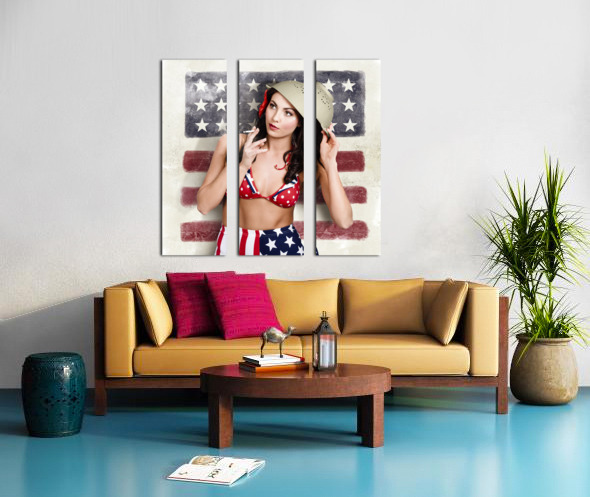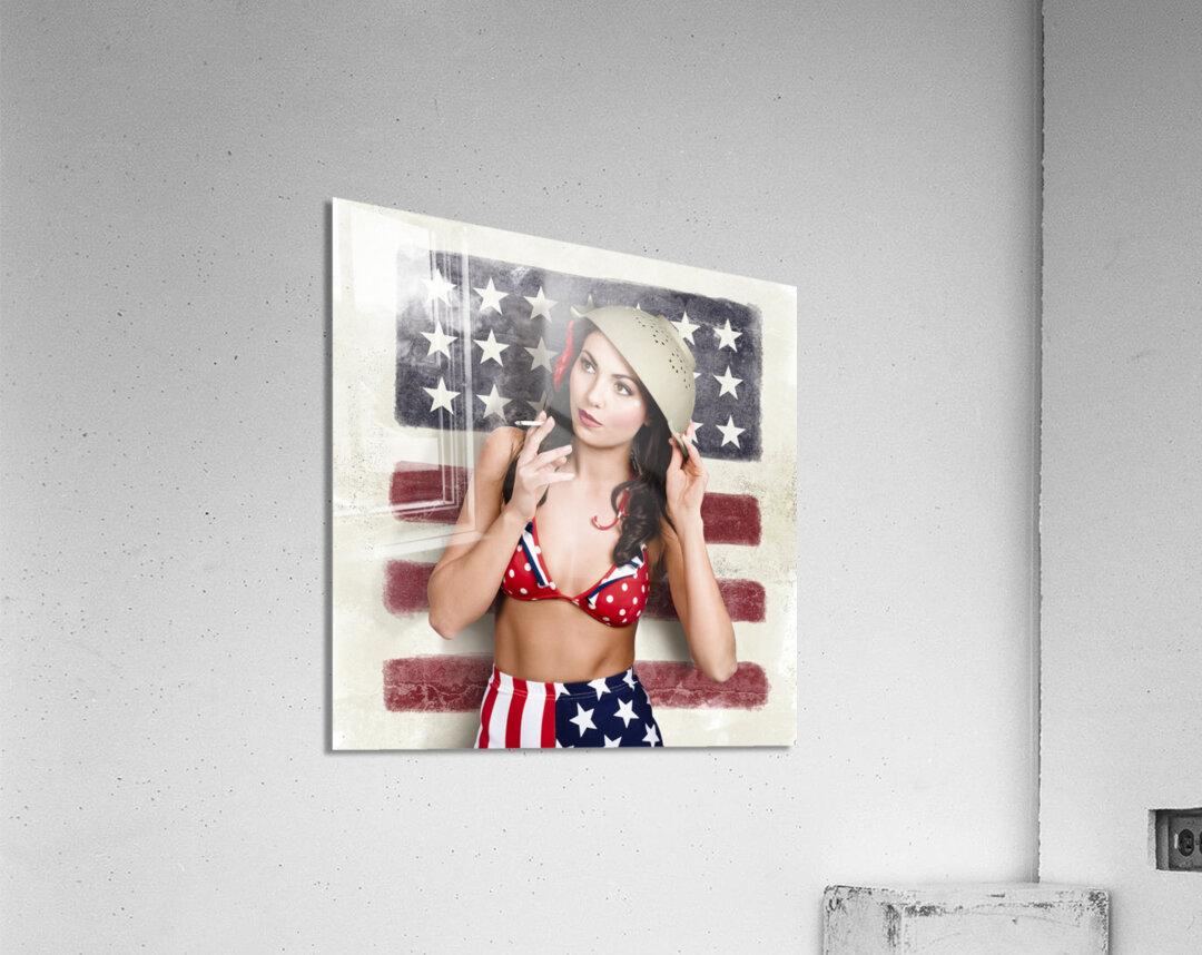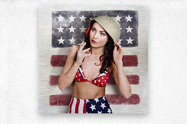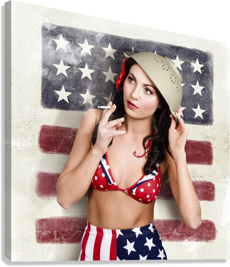 ABOUT THIS ARTWORK: USA PIN-UP WOMAN. ON VINTAGE AMERICAN FLAG WALL