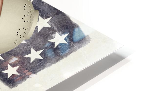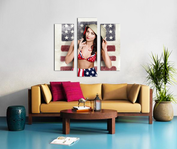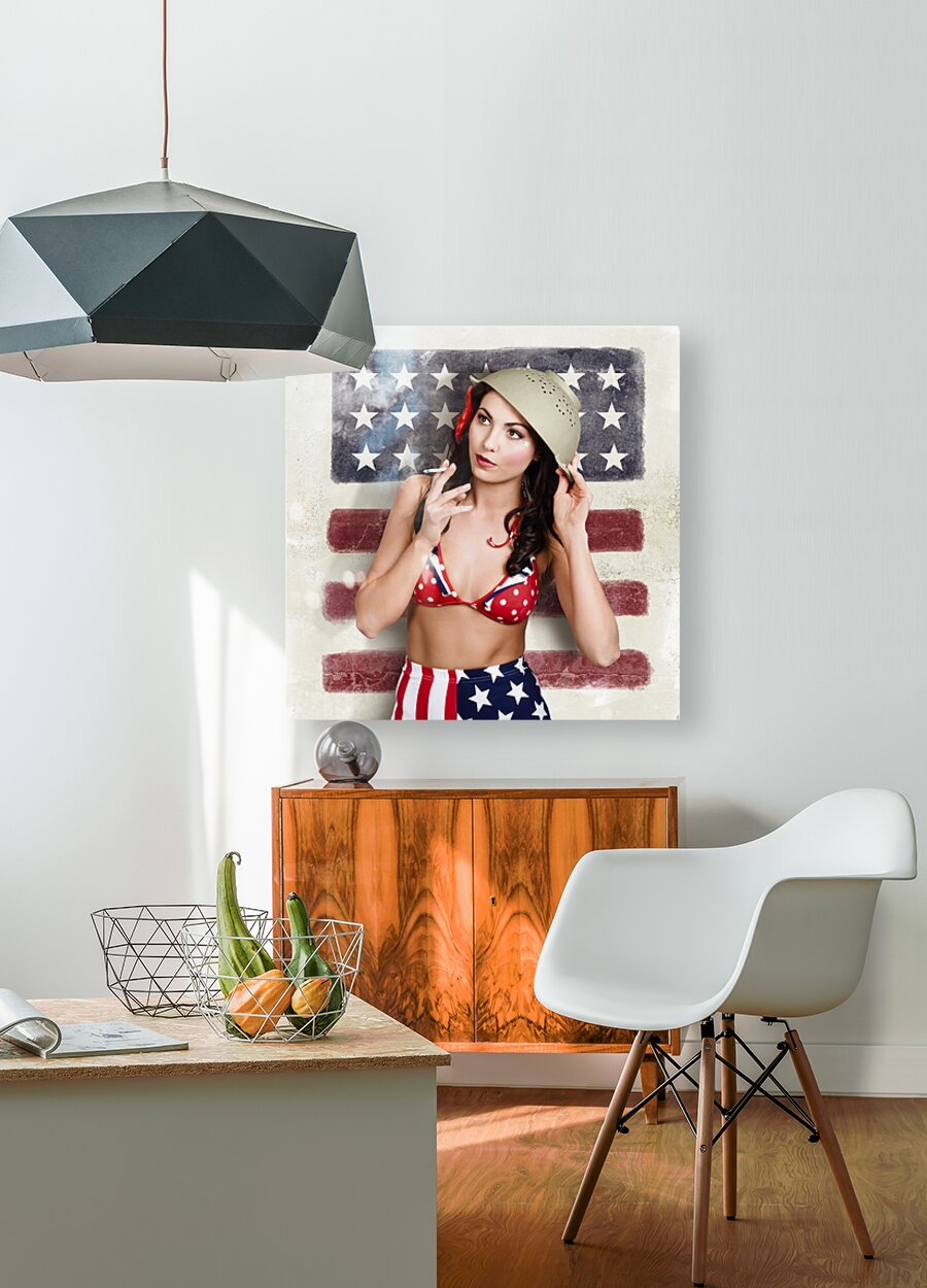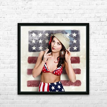 USA pin-up woman. On vintage American flag wall Picture Frame Printing