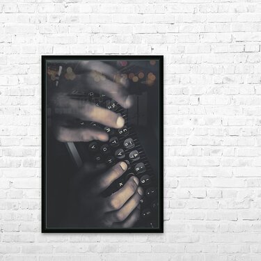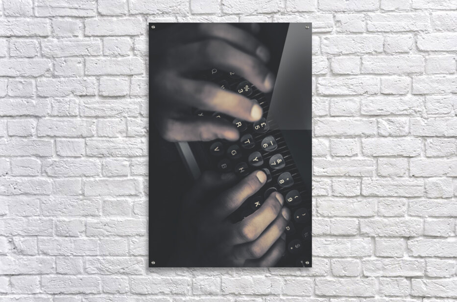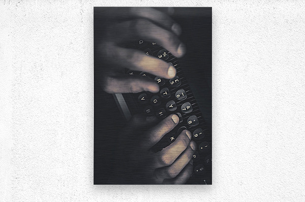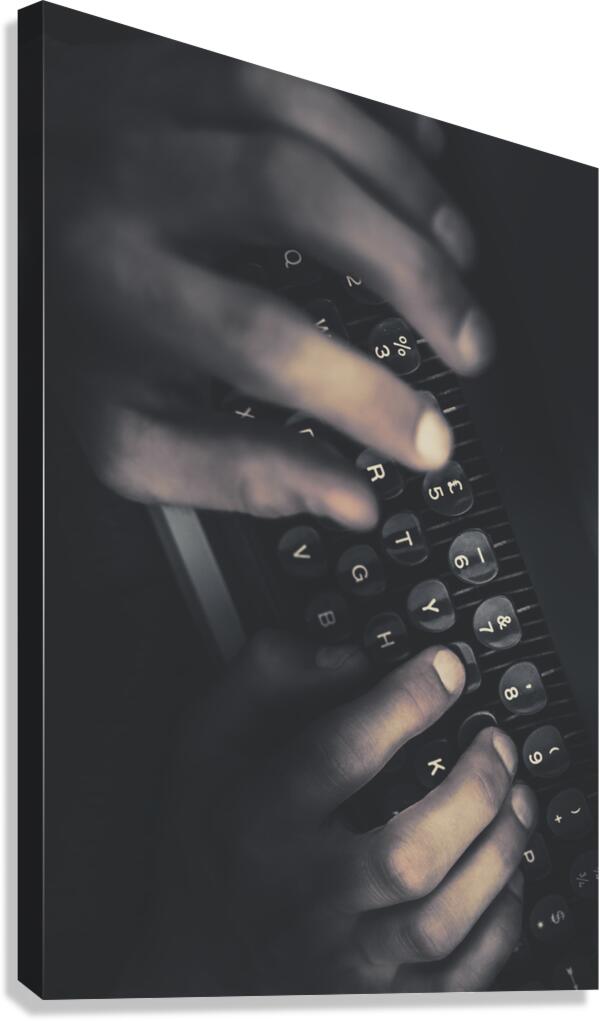 Dark creative writing concept of hands typing the keys to a fictional novel on an old typewriter. The mystery writer