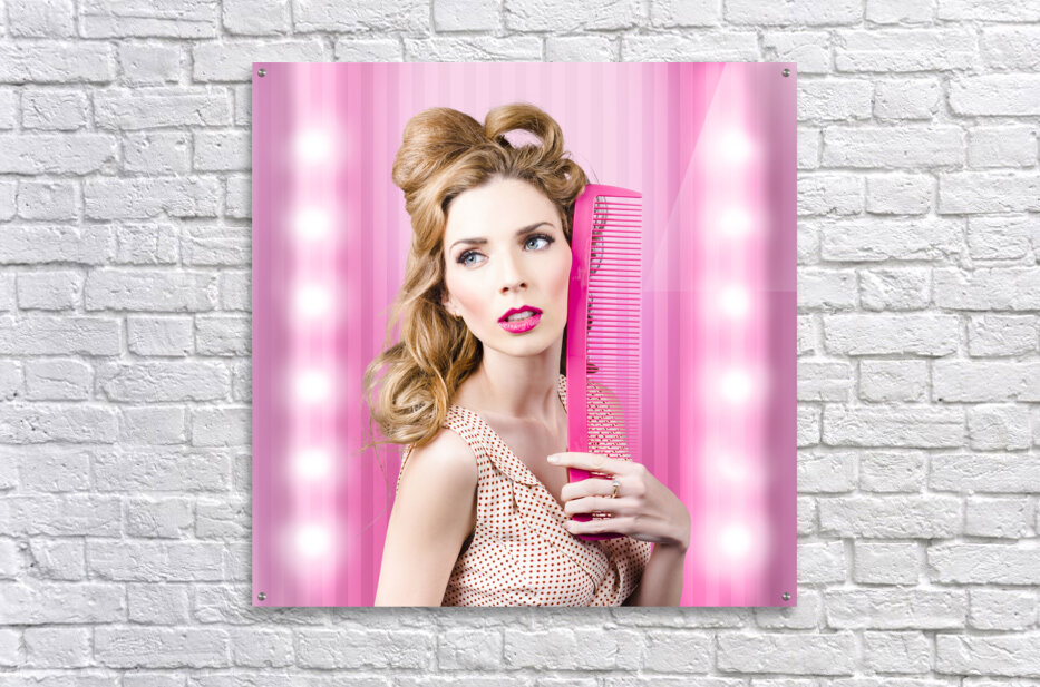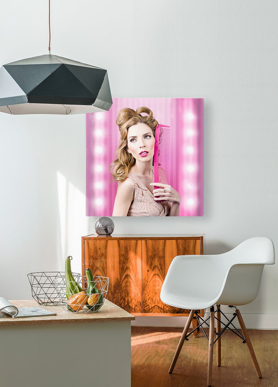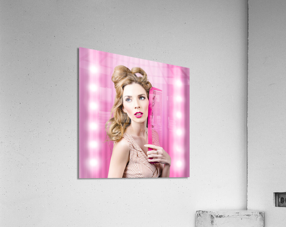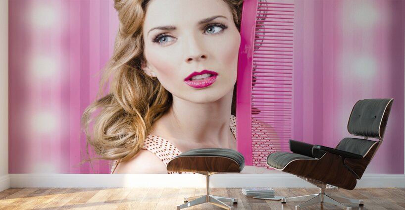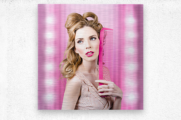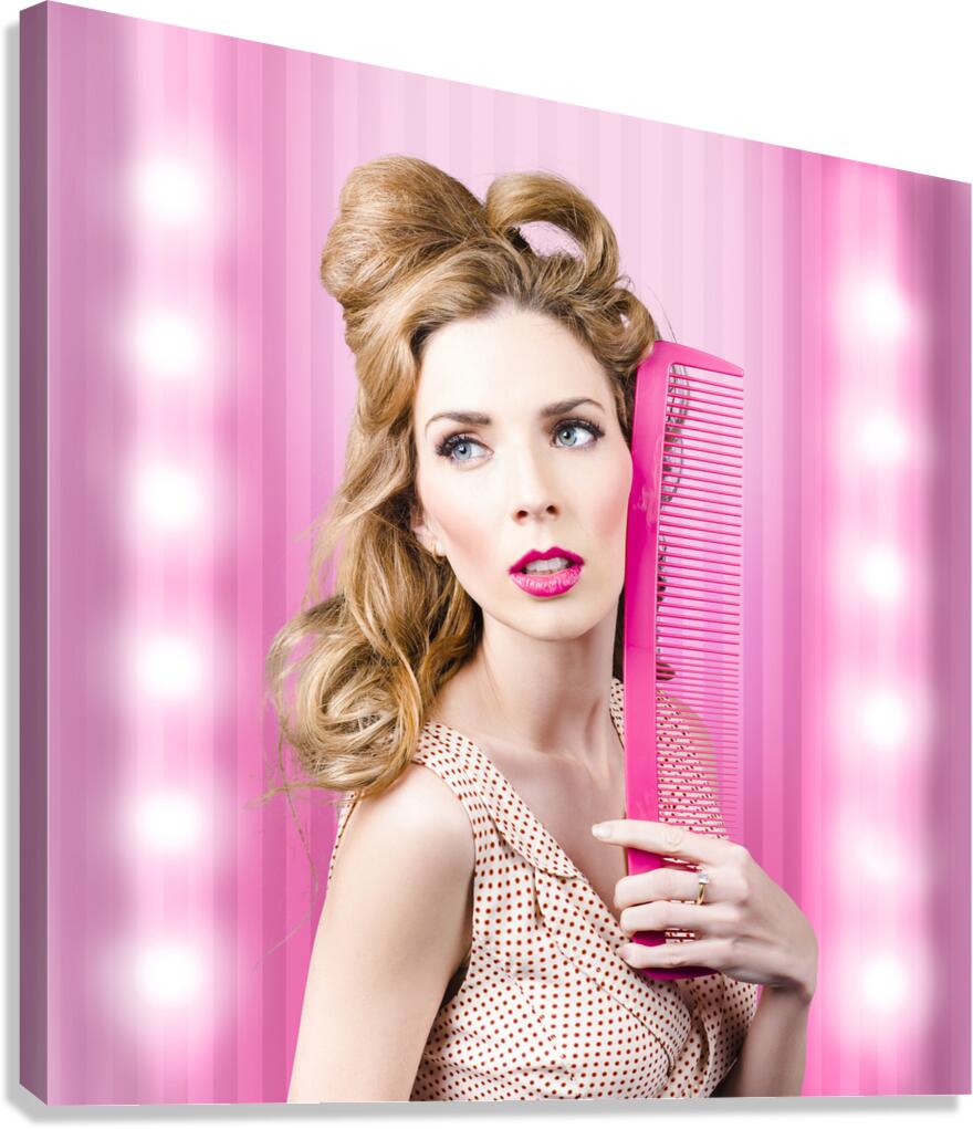 Half body portrait of a serious sexy girl with brown hair dressed in retro fashion standing inside a barber salon with beauty comb. Fashion faux pas