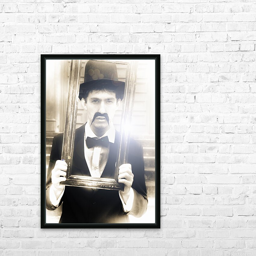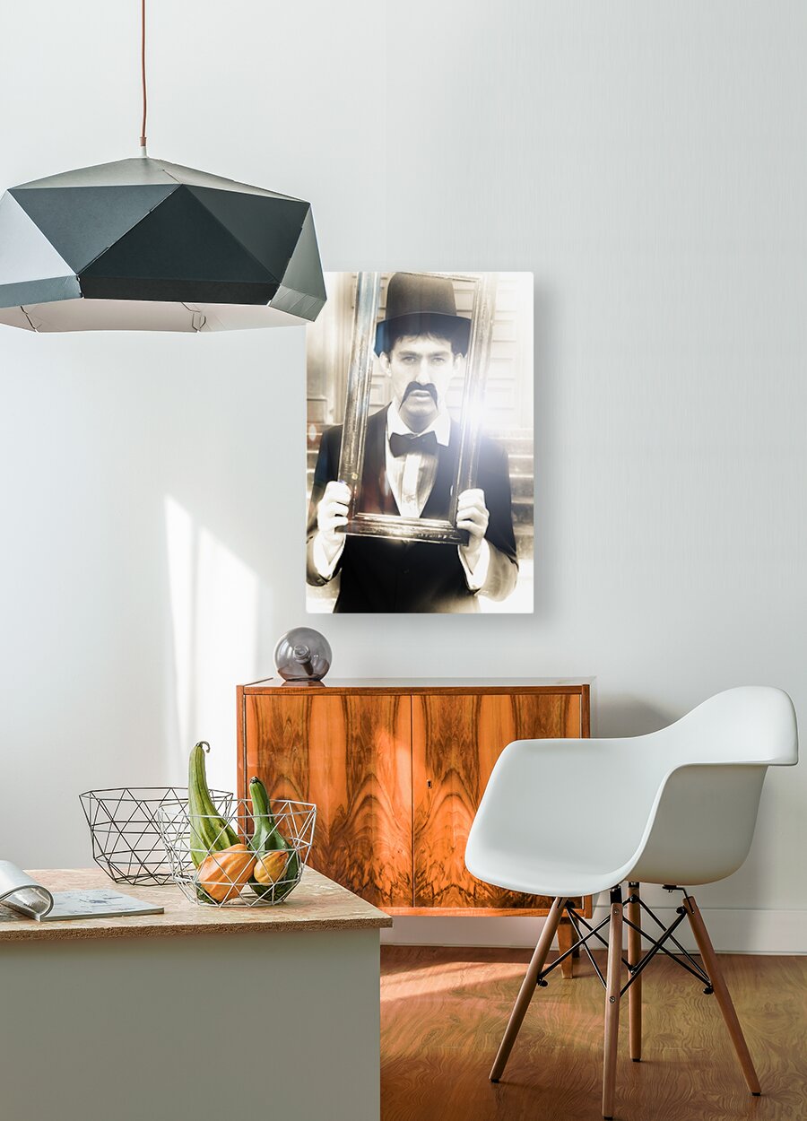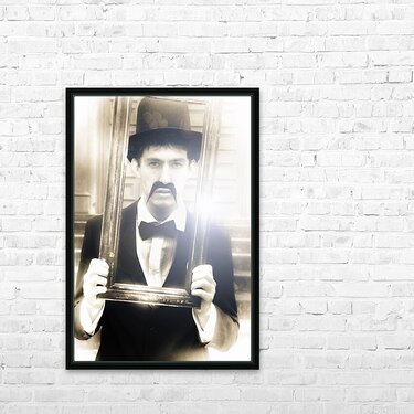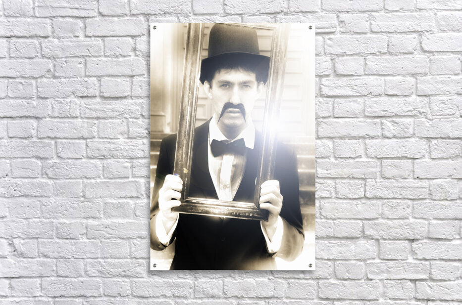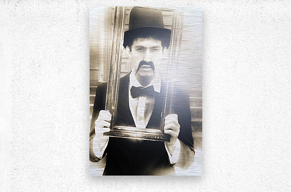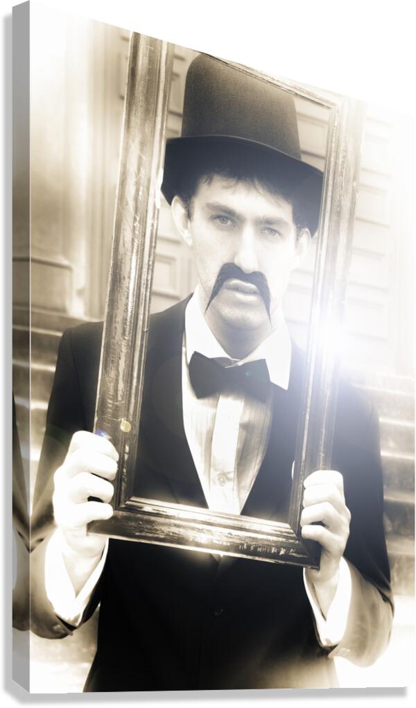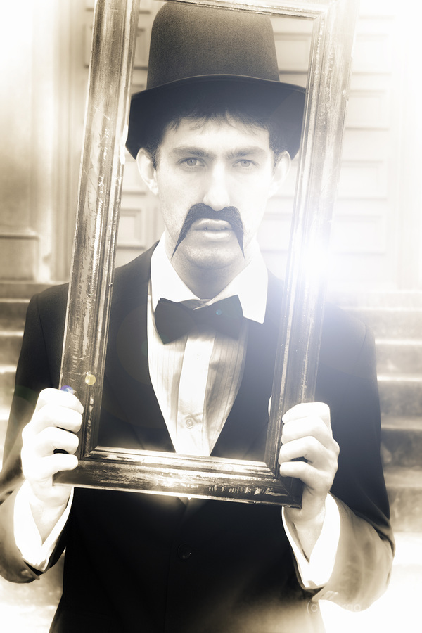 Vintage Man Looks Through A Retro Picture Frame From Yesterday In A Bygone Moment Representing The Nostalgia Of Passing Time And Faded Memories