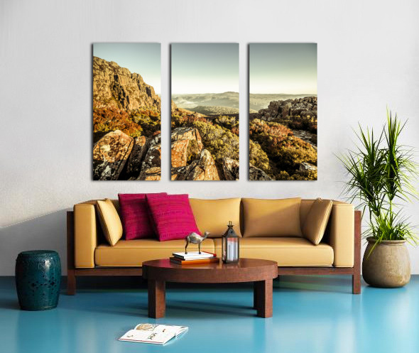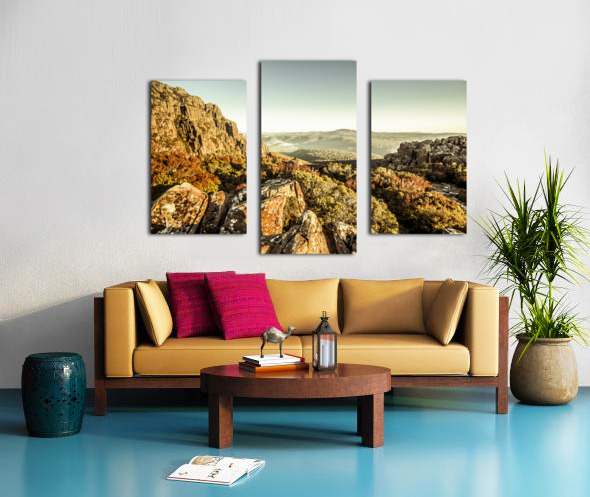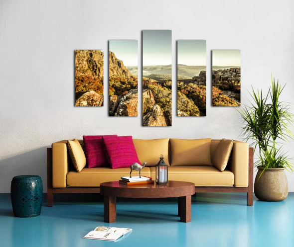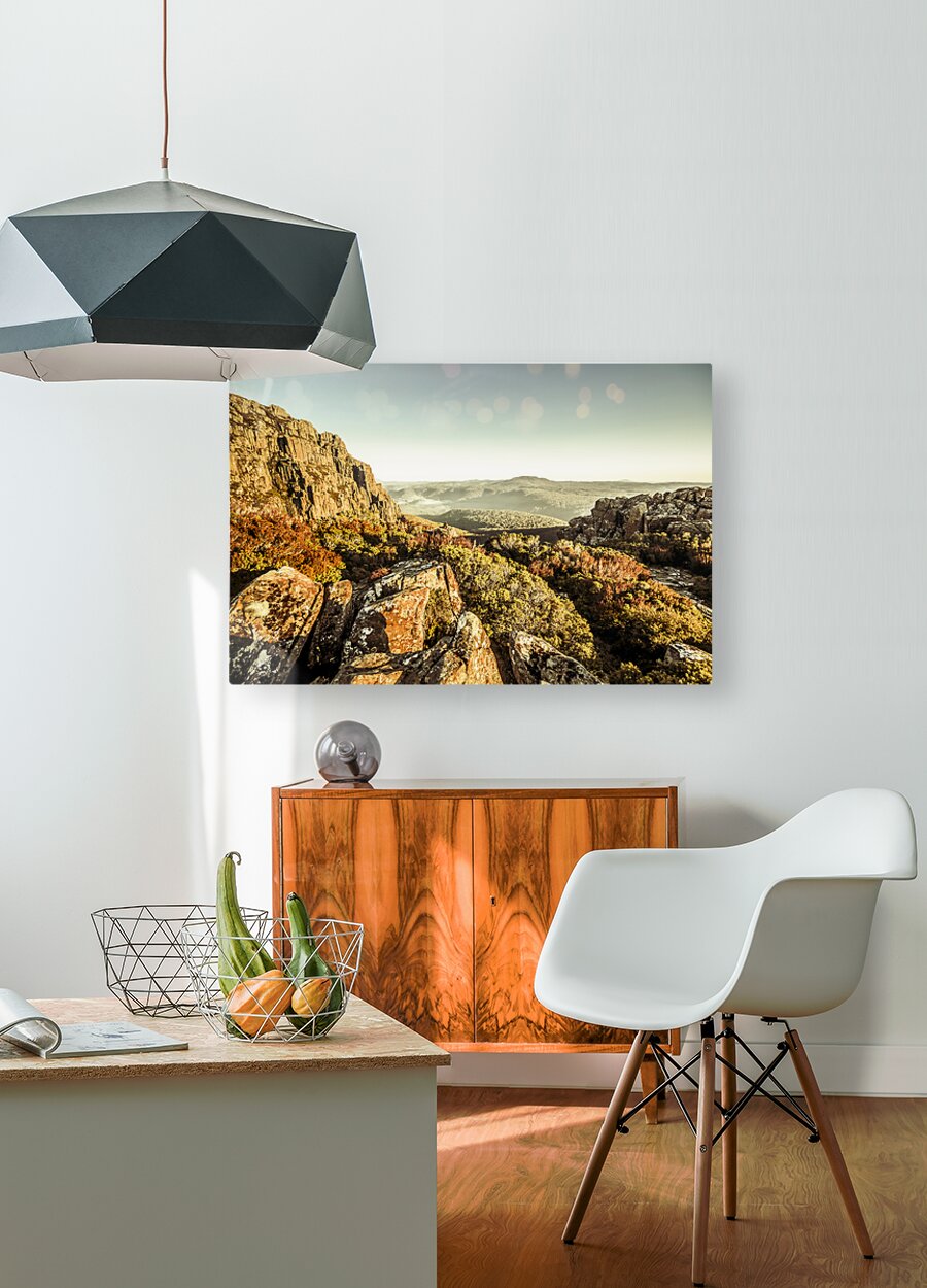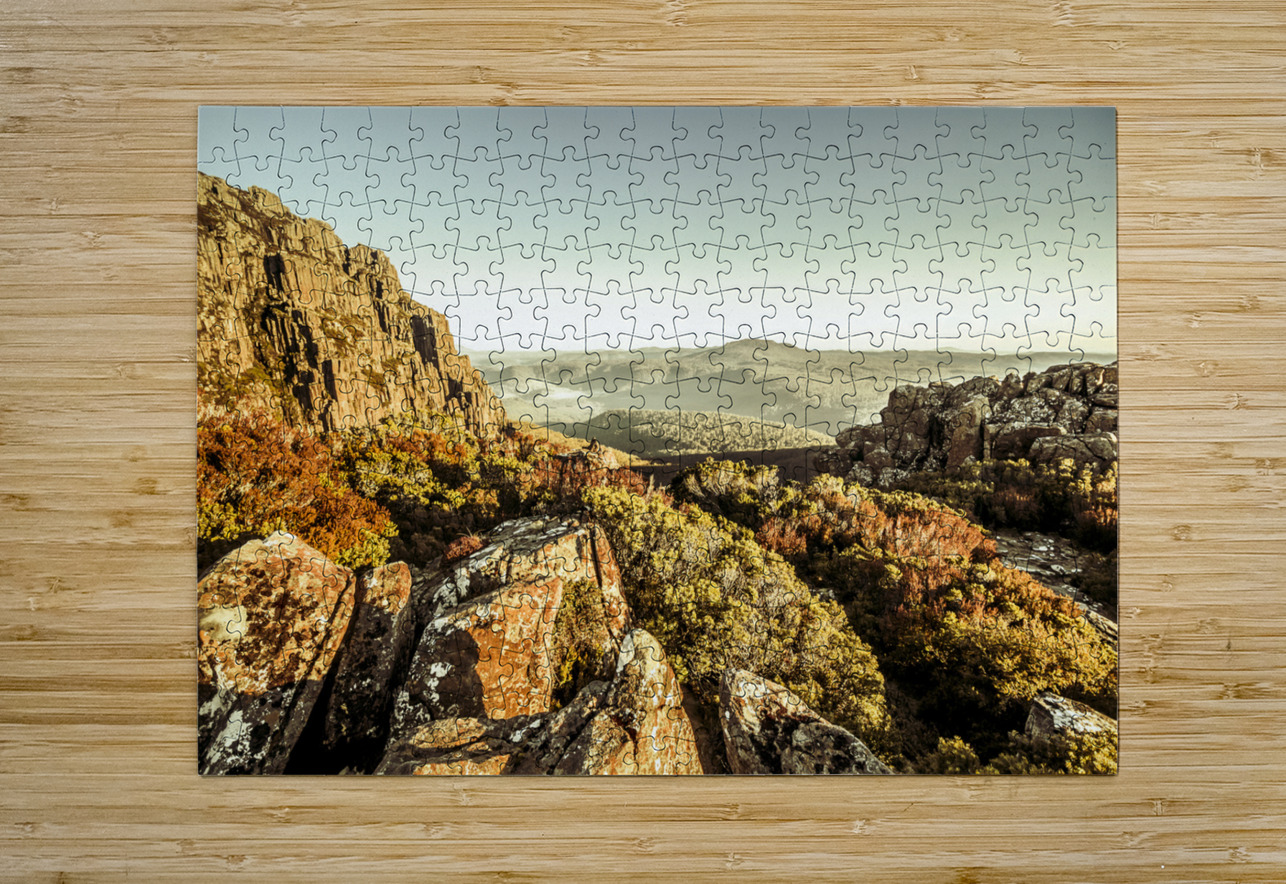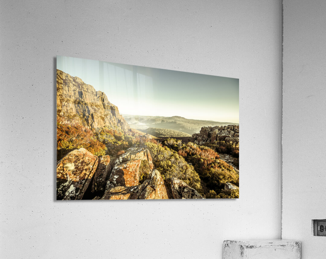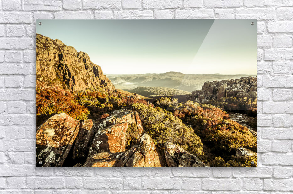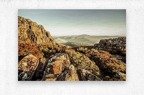 An alpine morning captured from a stony vista of cliff lookouts to country hills. Ben Lomond National Park Tasmania Australia
