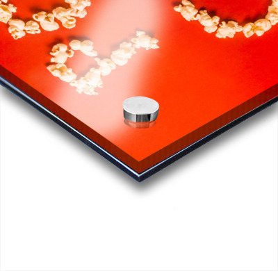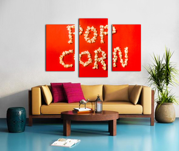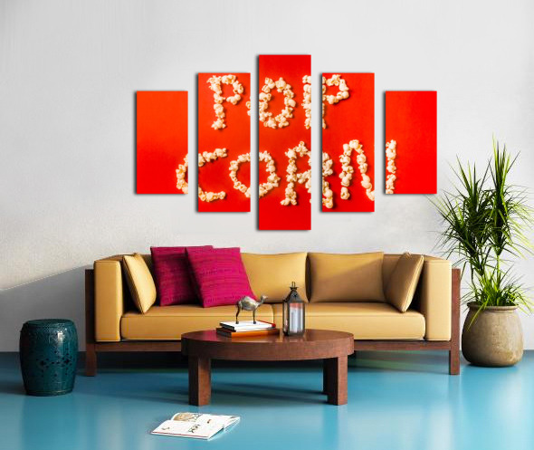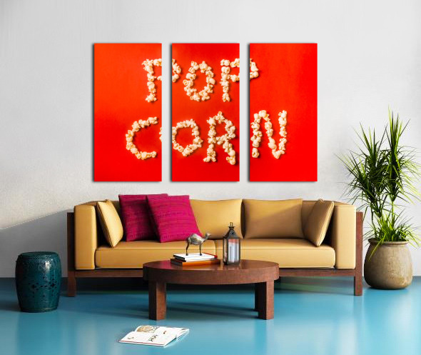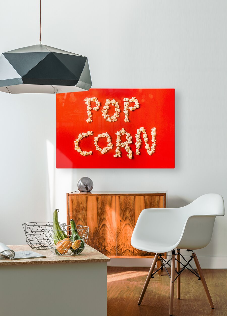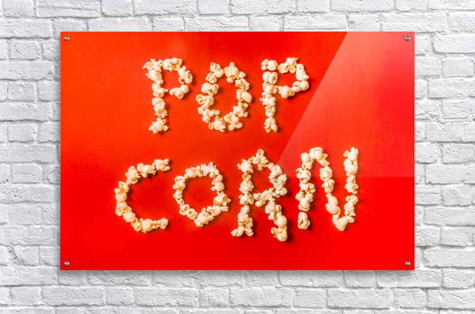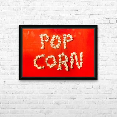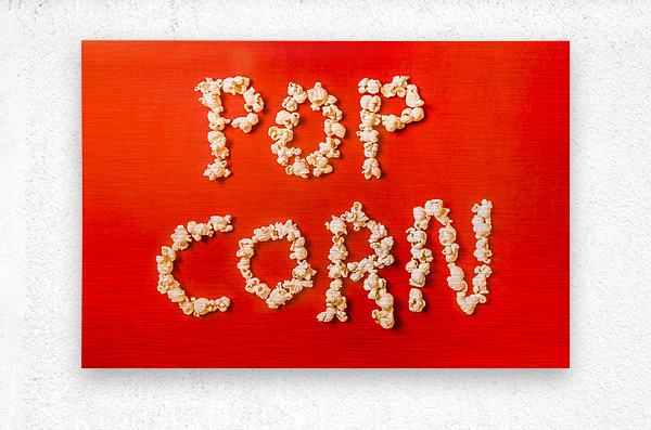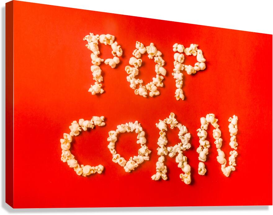 Corny pop art in a fresh foods scene of popcorn in name and subject on red background