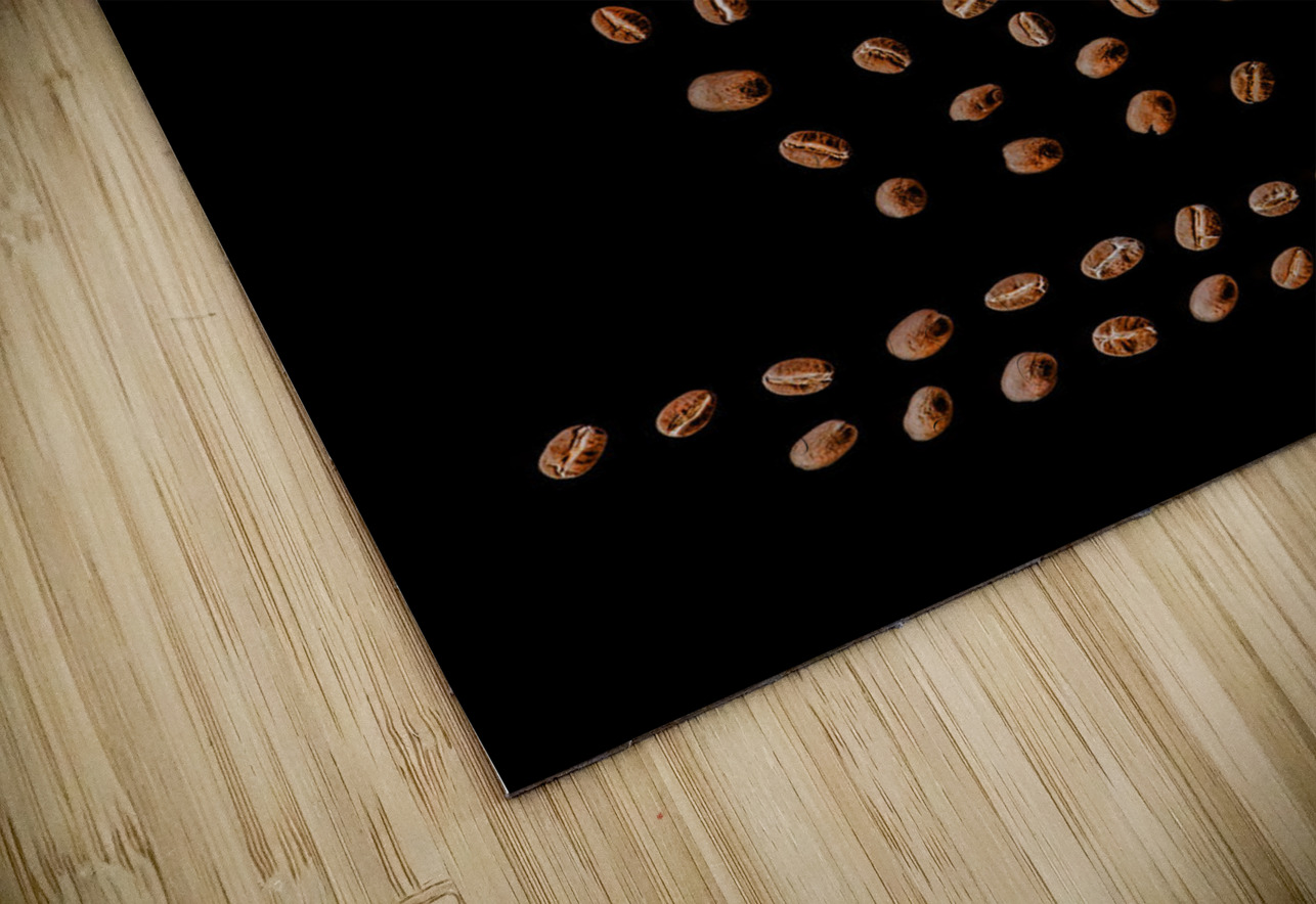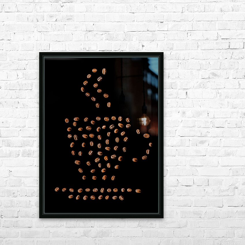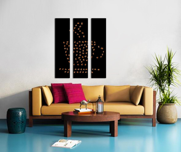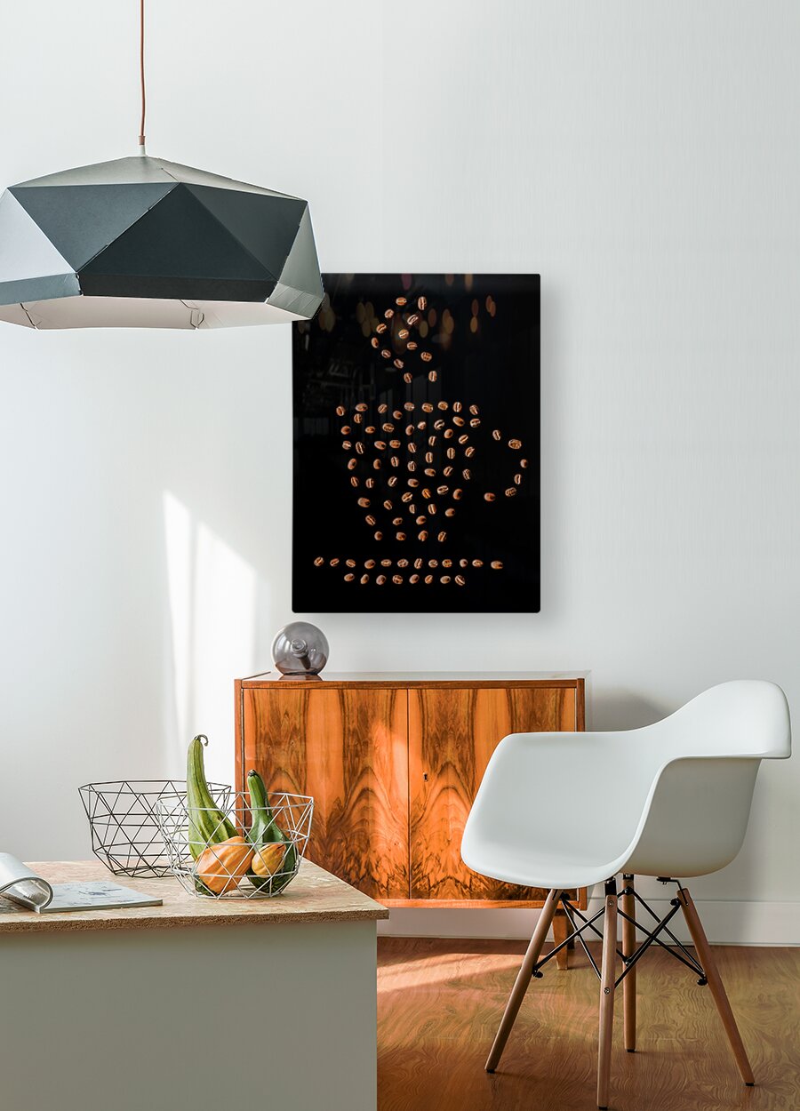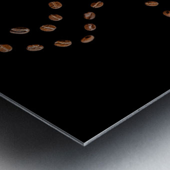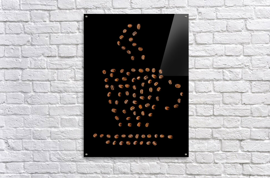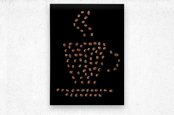 Contemporary beverage art on a cafe mug created with coffee beans displaced on black background