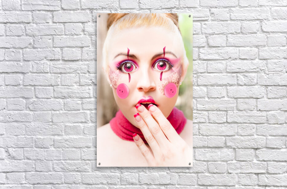 Dolled up portraiture on a surprised female doll face expressing shear shock with button cheeks and creative make up.