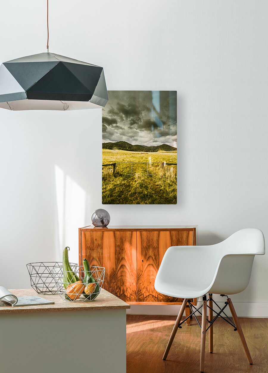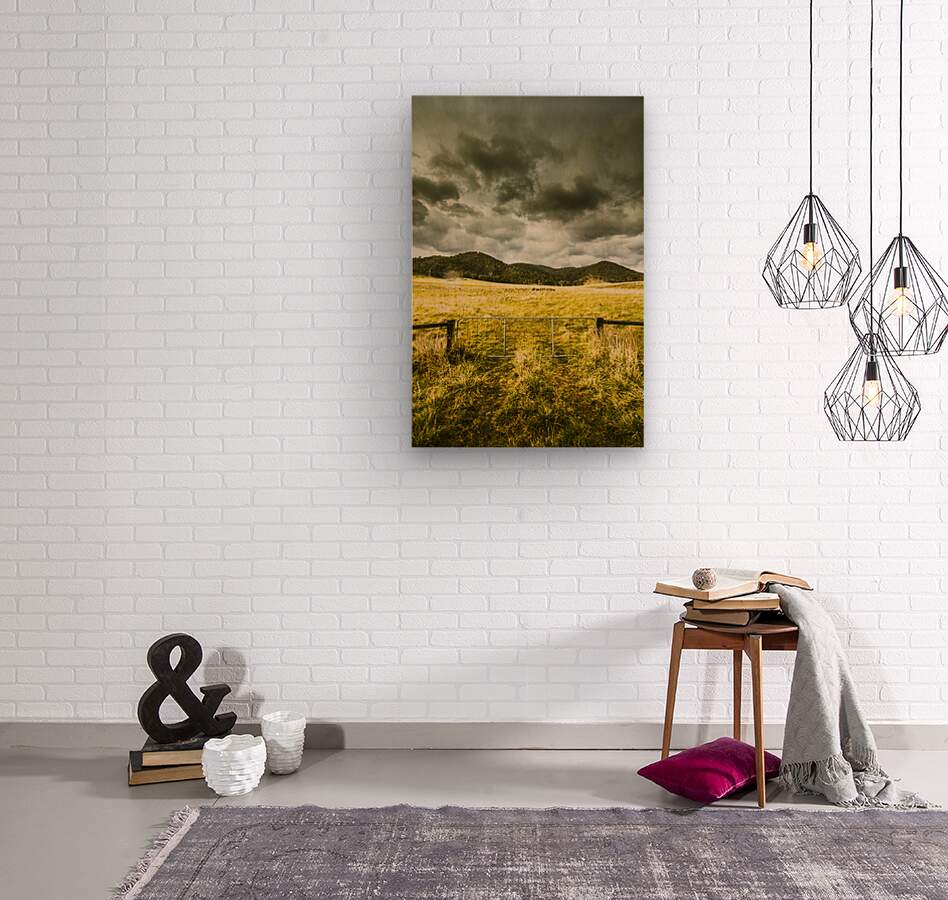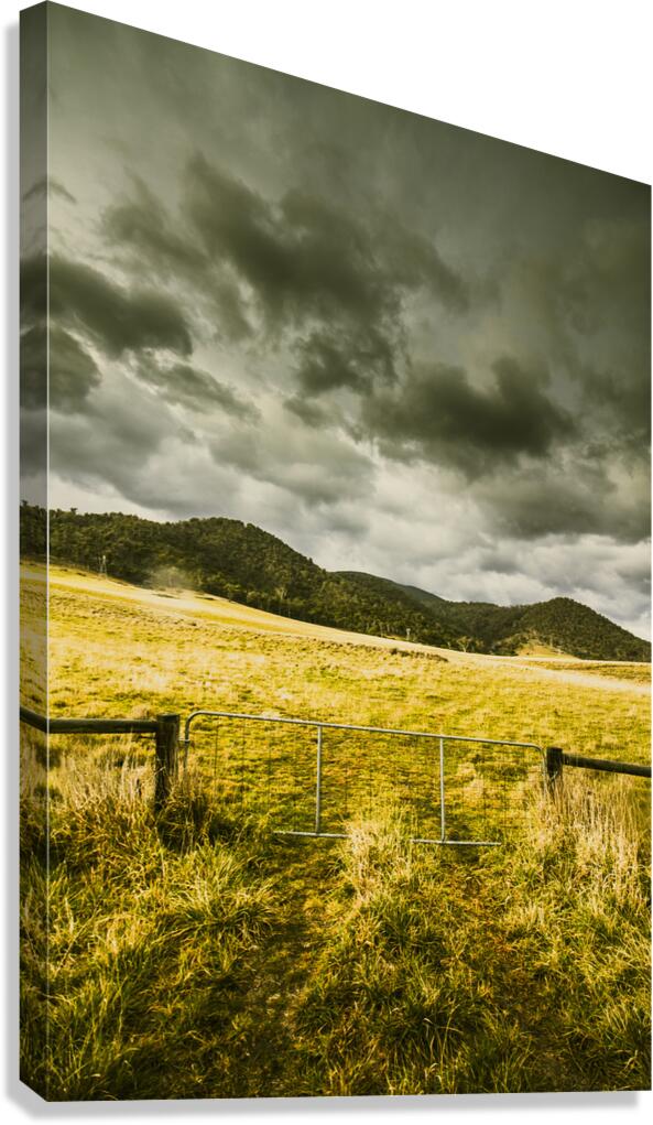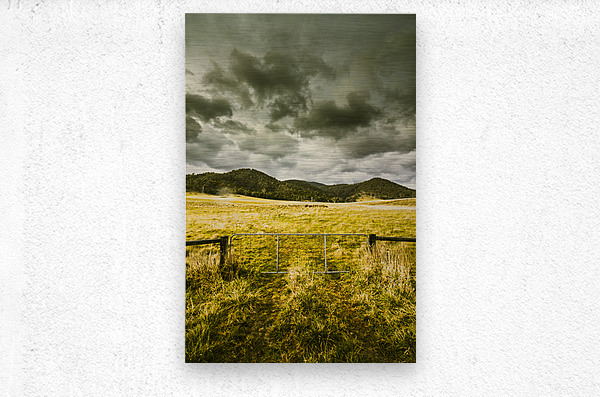 Rain clouds and lens droplets frame a beautiful winter farmland field with paddock gate. Royal George Tasmania Australia