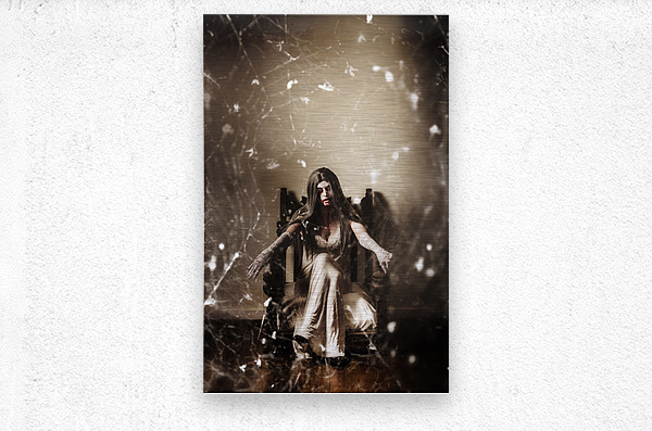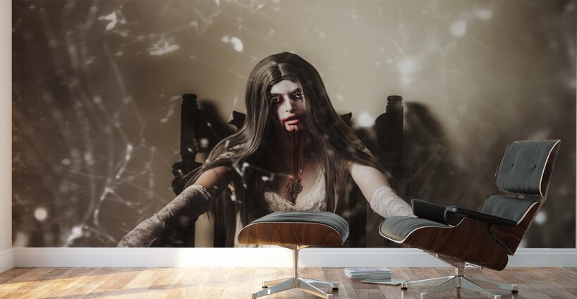 Dark portrait of a possessed demon woman seated in haunted house in vintage fashion with spiderweb. Devil is in the details