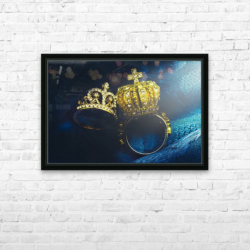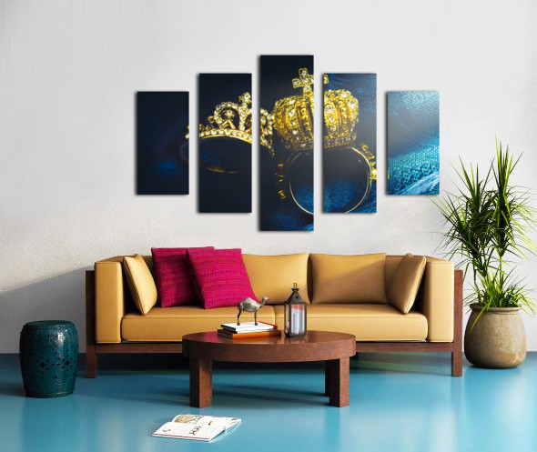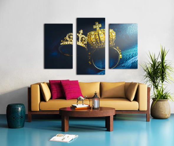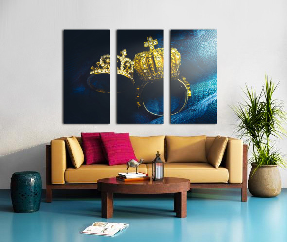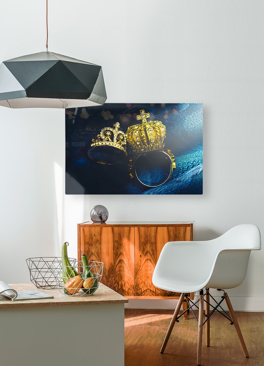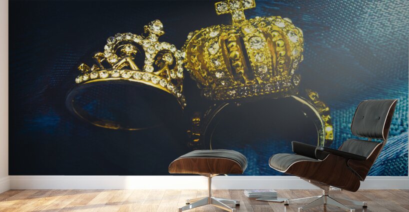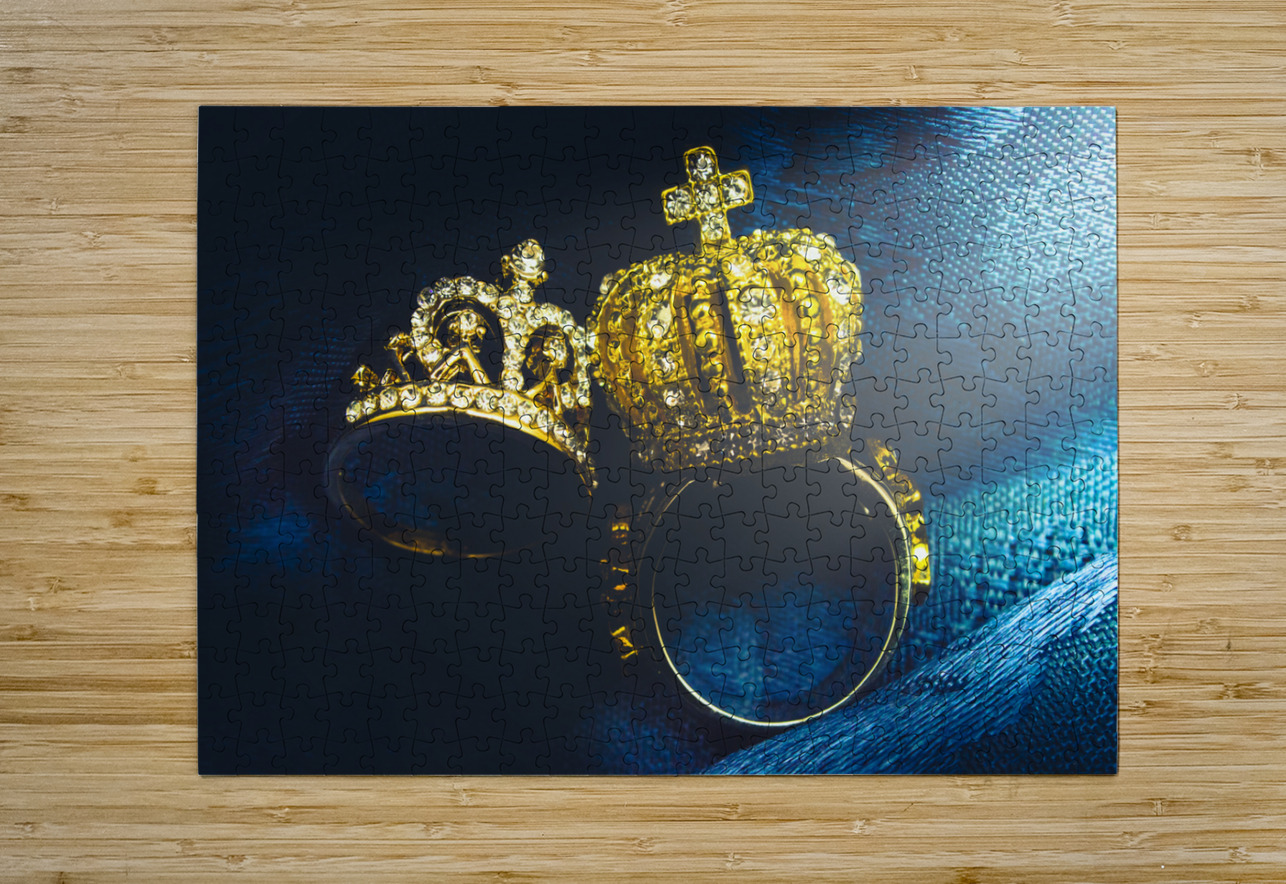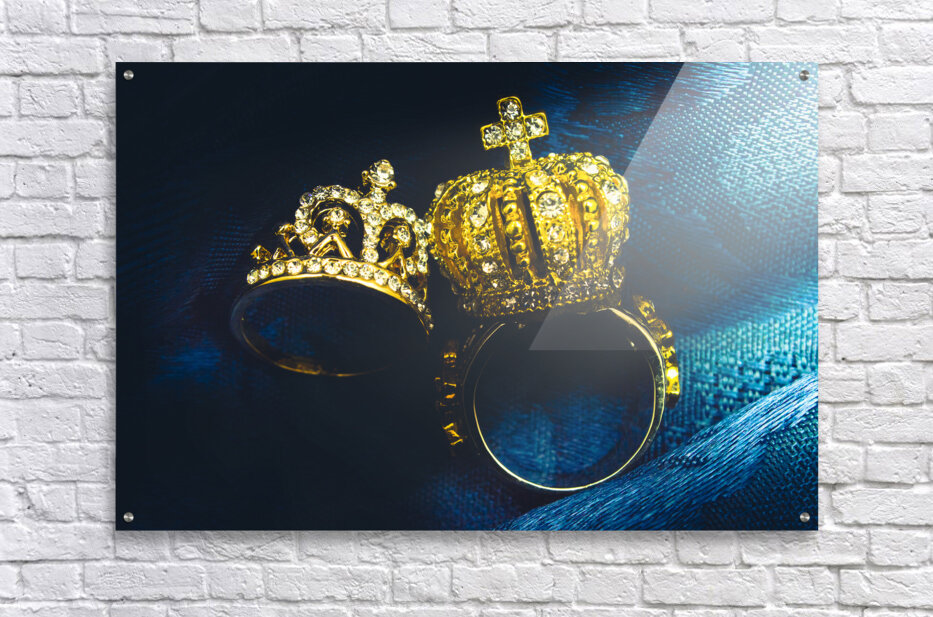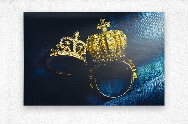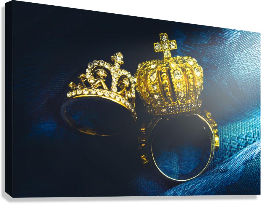 Luxury still-life art on golden crown jewels on blue silk cloth. Rings of nobility