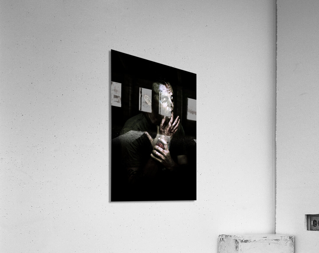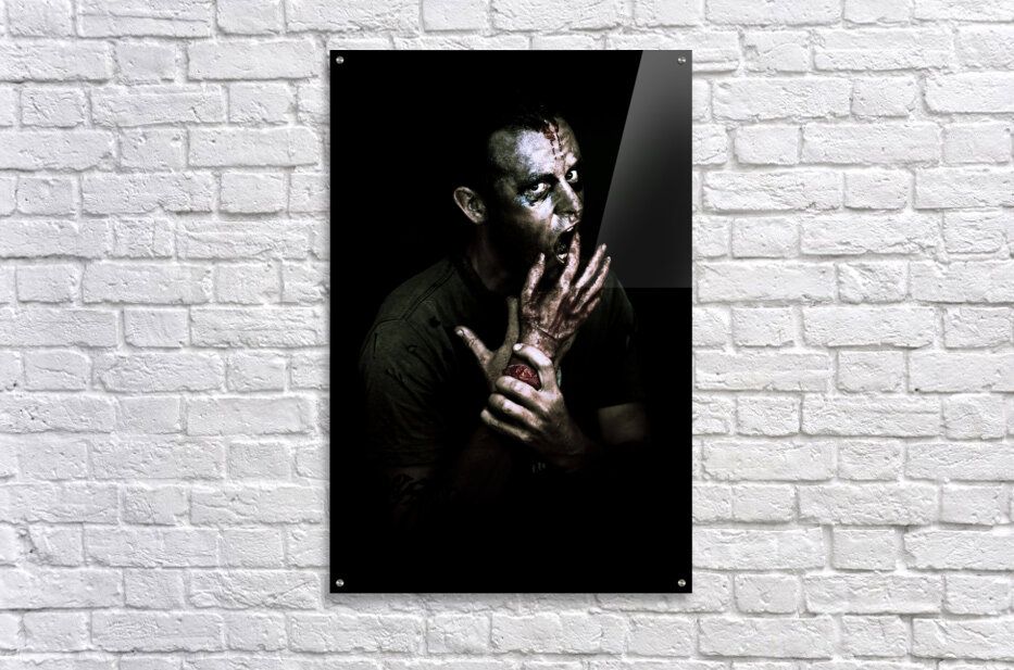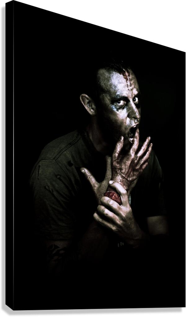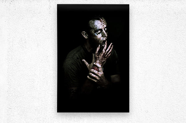 A decaying zombie feeds on a severed bloody human hand in the darkness of midnight in a deadly midnight snack conceptual