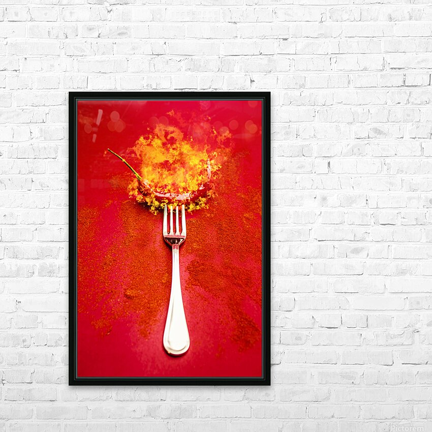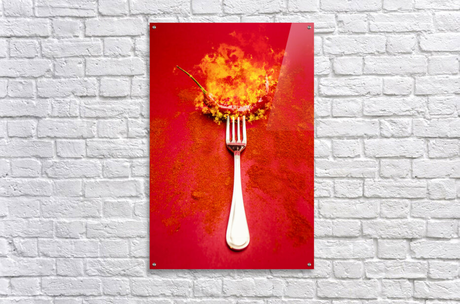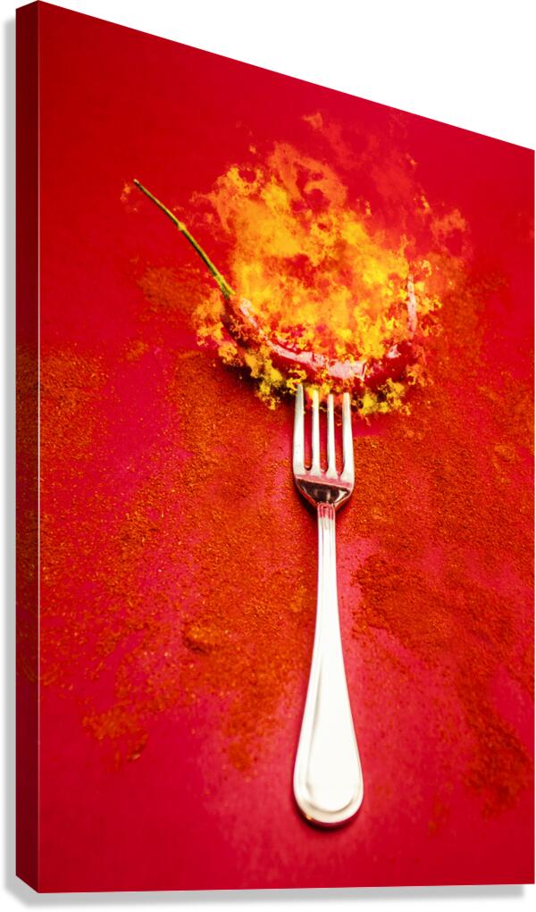 Creative food art on a flame grill hot chili pepper on the end of a indian restaurant fork. Forking hot food