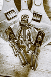 Quirky still life art on a mechanical workshop fix from a technical error 404. Old hardware upgrade