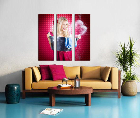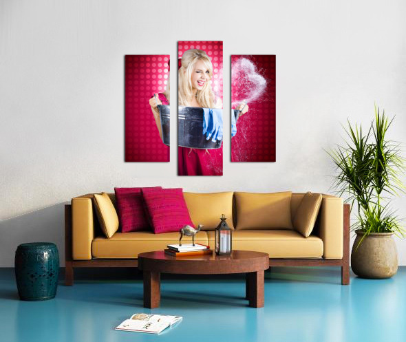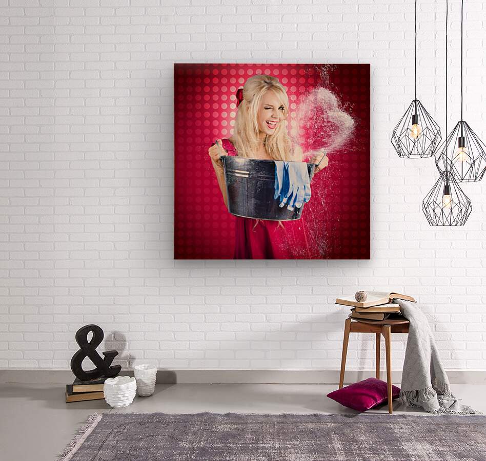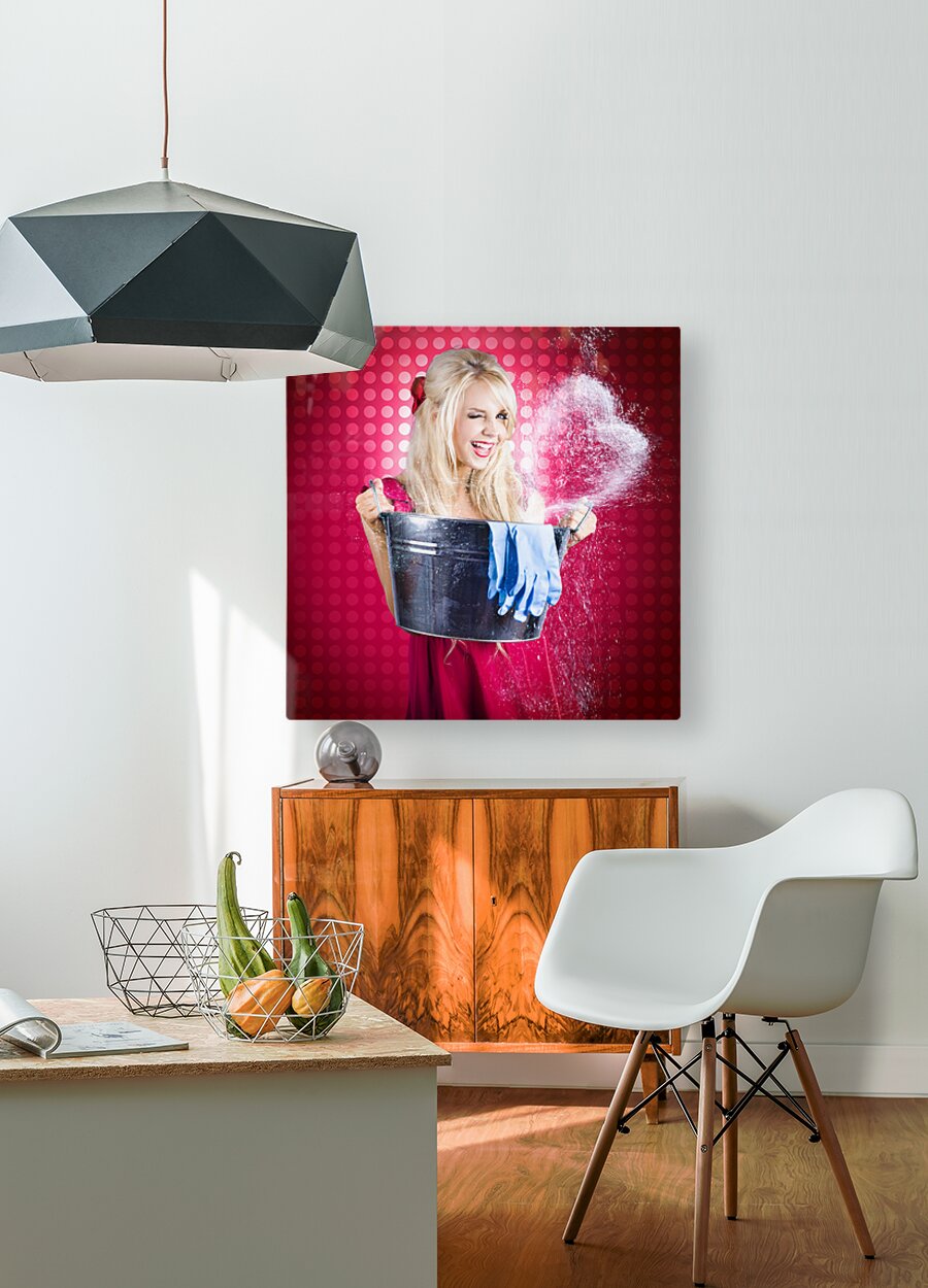Funny Romantic Blond Pin Up Woman Holding Bucket Full Of Water When Splashing Out A Heart Shape With Cleaning Products In A Depiction Of Housekeeping ...[+]