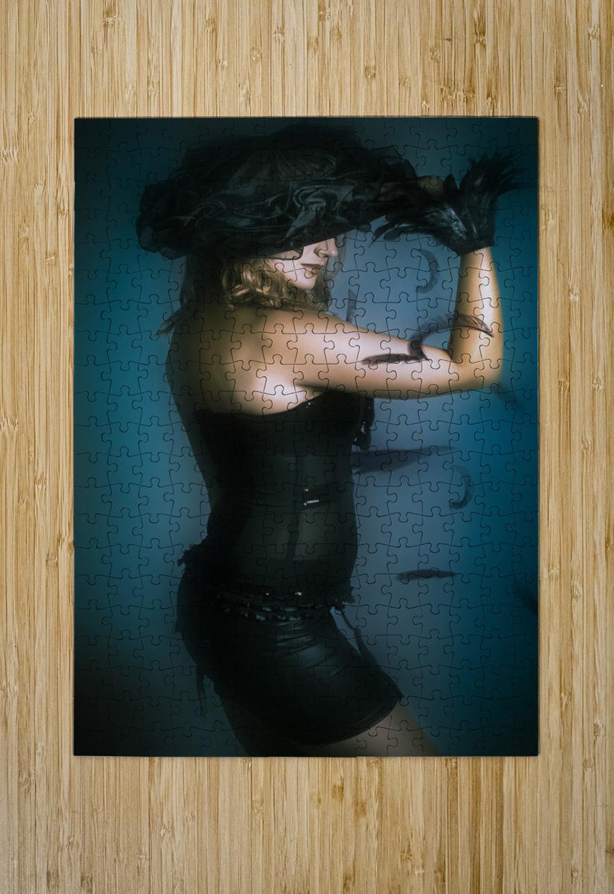 Soft blurred portrait of a woman standing side on wearing high fashion black hat with burlesque fashion outfit. Mystery dancer concept