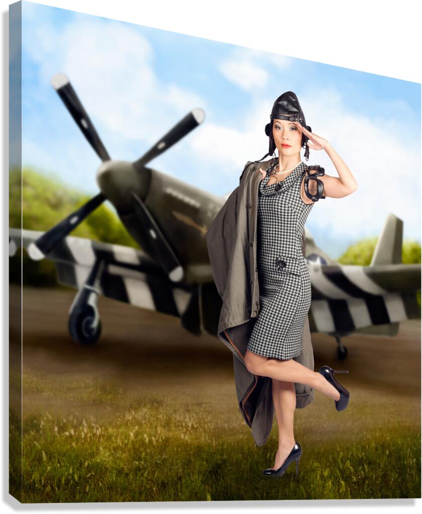 Artistic photo illustration of a beautiful asian pinup woman in 1940s military dress making a salute in front of an air force bomber plane