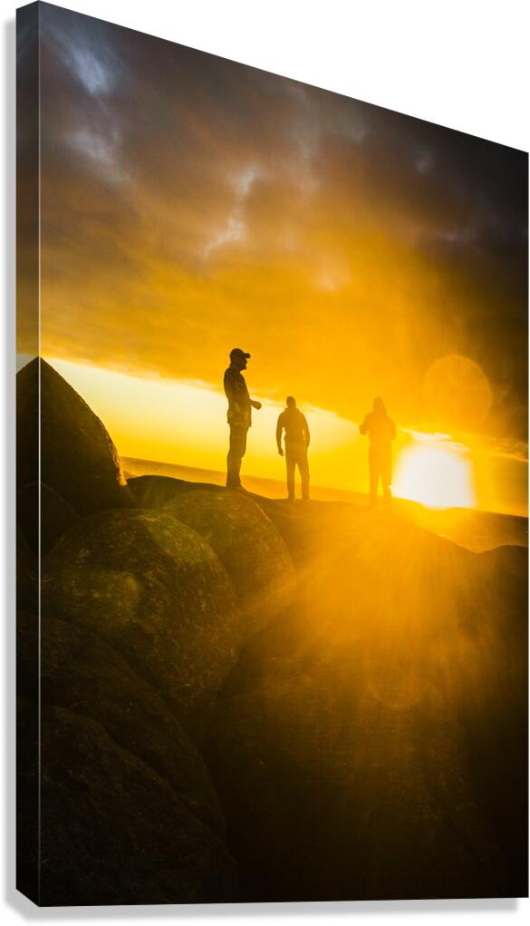 Landscape portrait on a group of people on a recreational holiday to the beach in a flared sunset scene. Captured Granville Harbour Tasmania Australia
