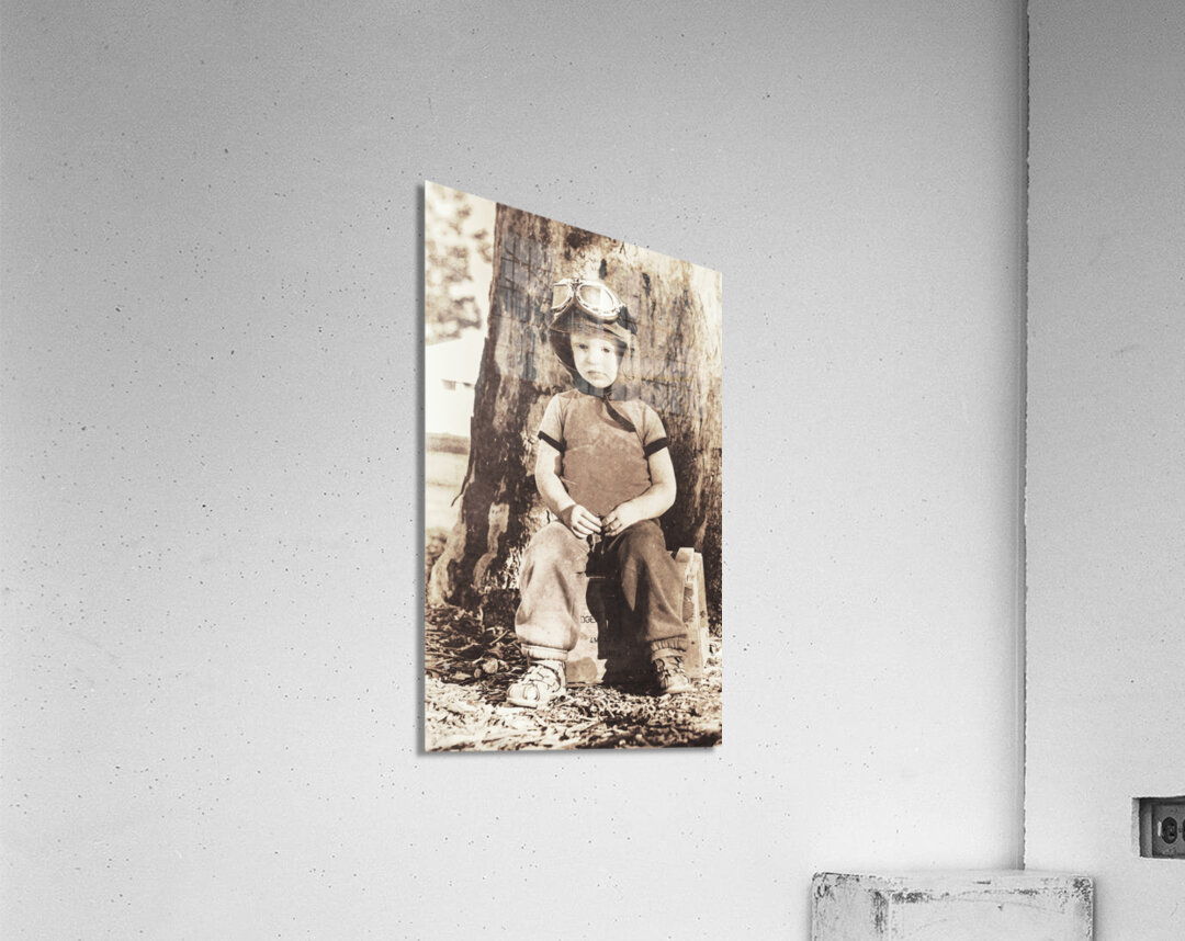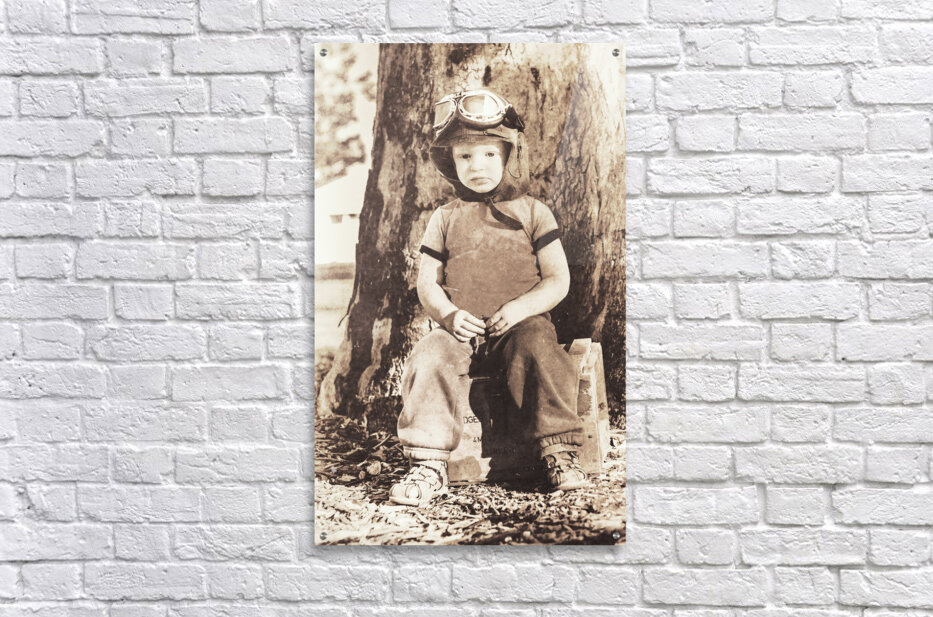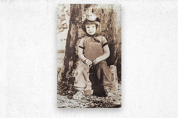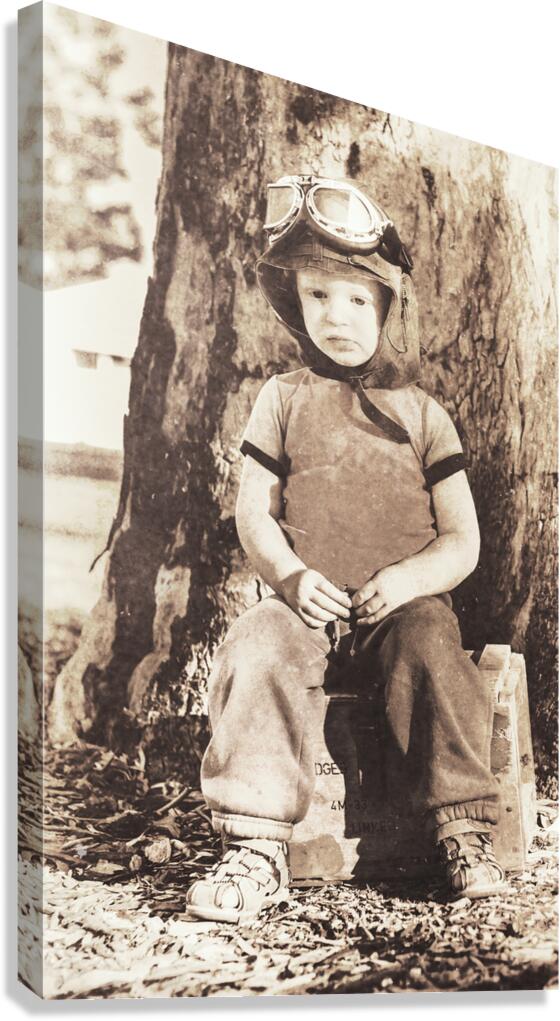 Vintage 1940 styled picture of a Cute 3yo kid wearing aviation goggles while sitting on an ammunitions crate. ww2 wingman holding the forte