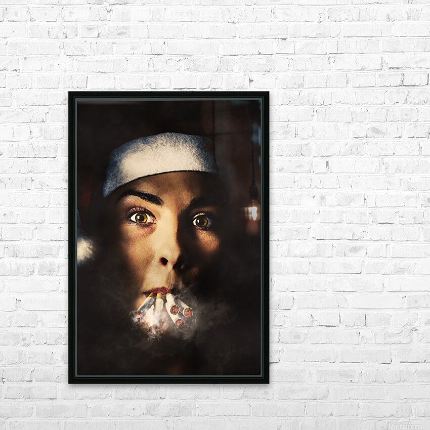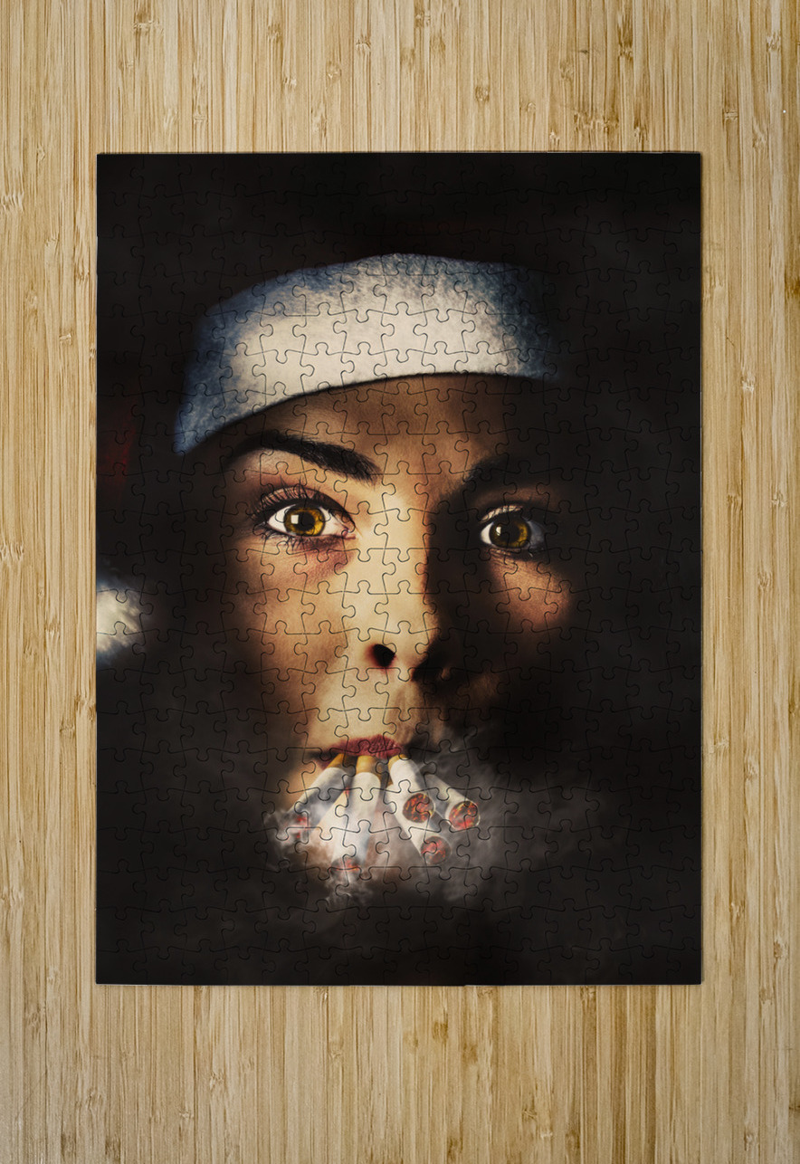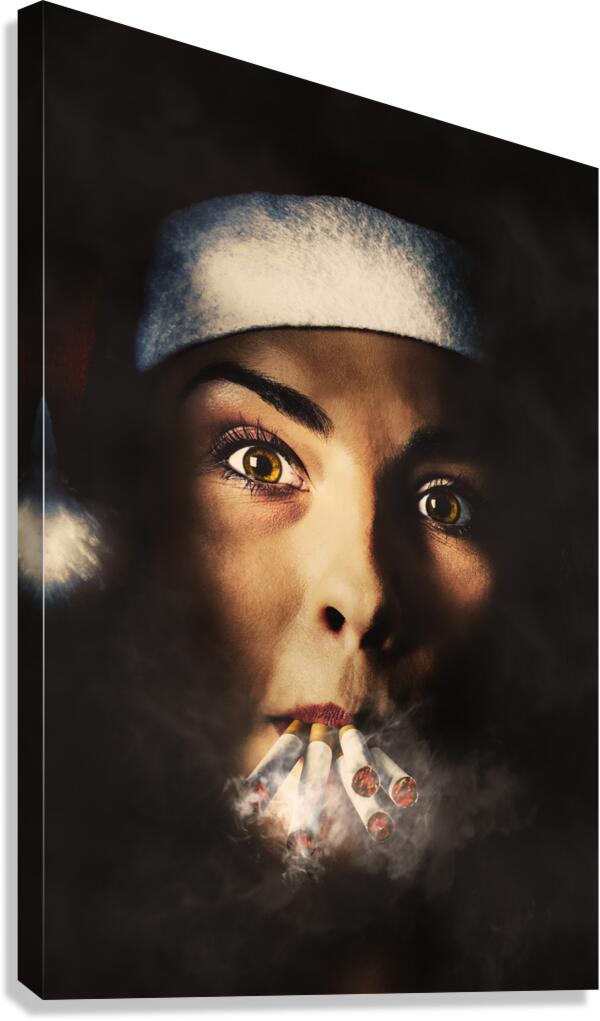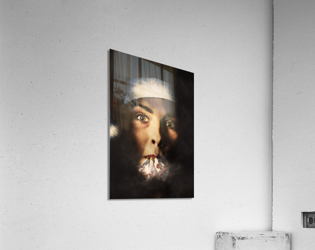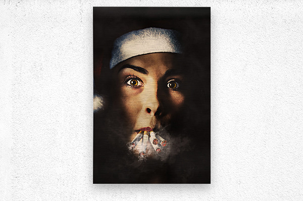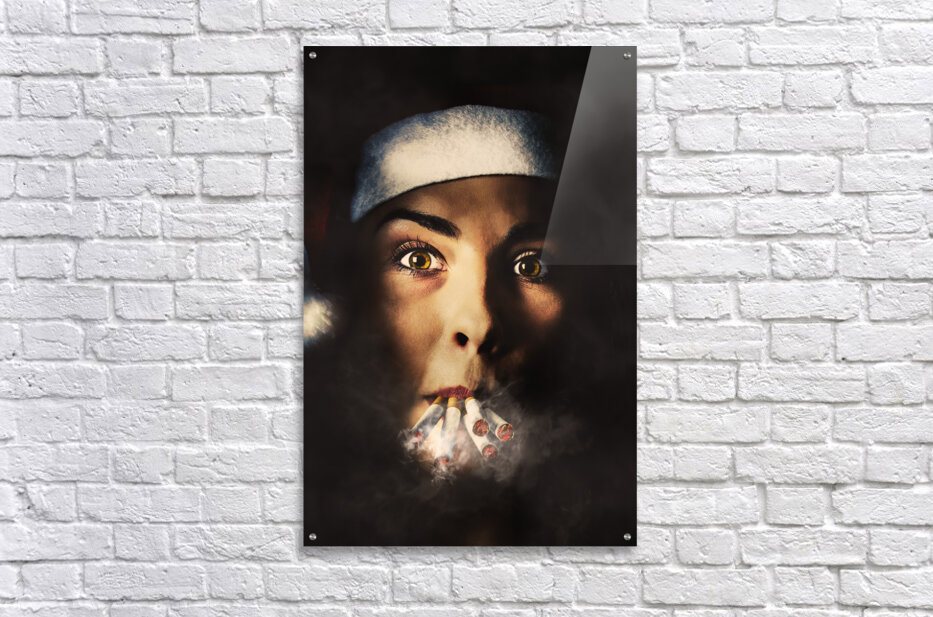Dark creative portrait on the face of a stressed santa girl smoking heavy from the stress of a busy and tiring Christmas. The eve of a new years resolution