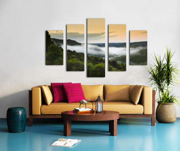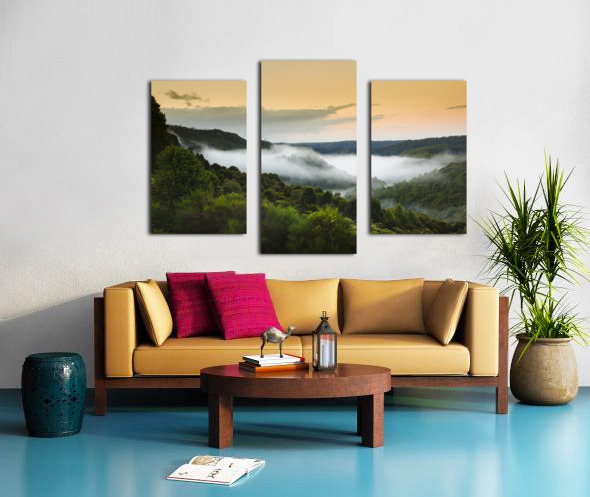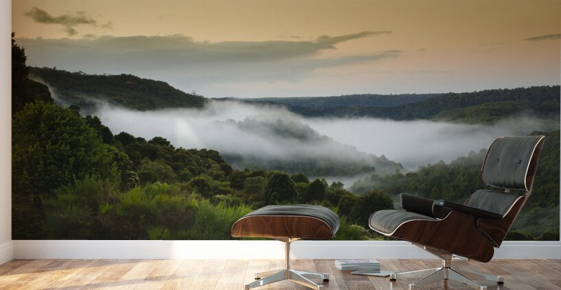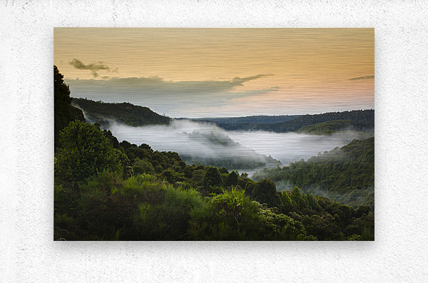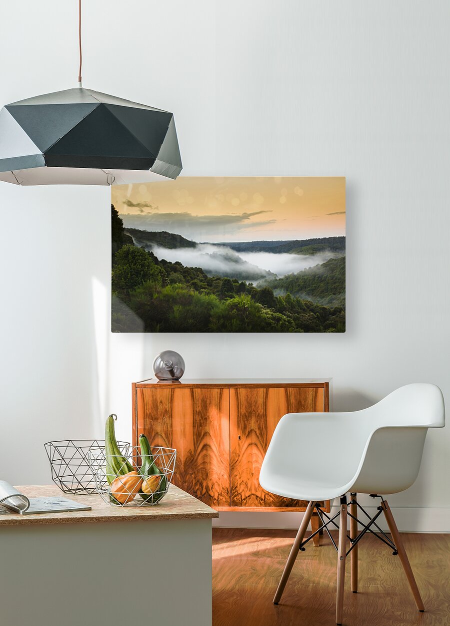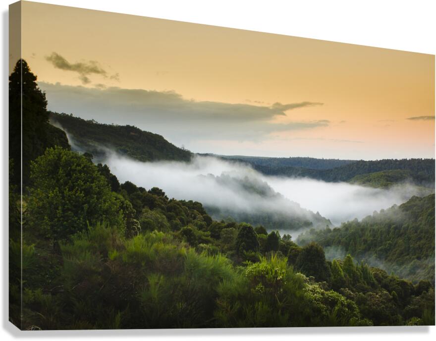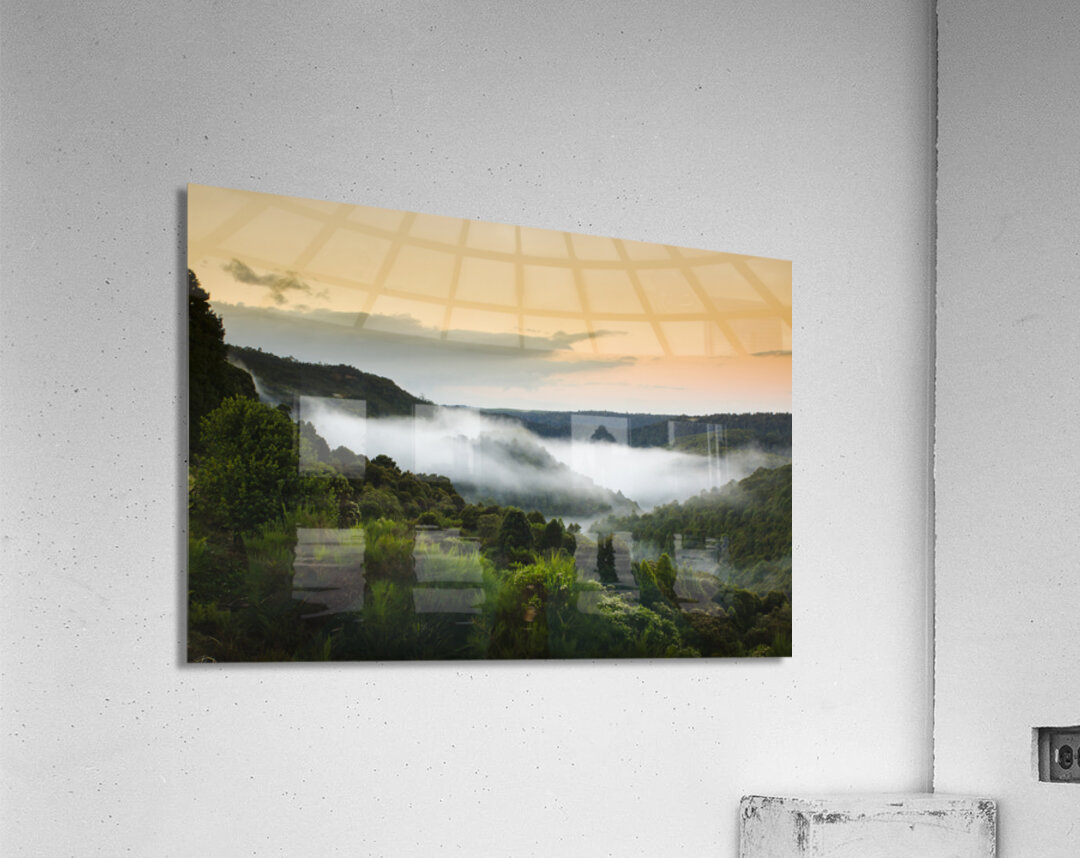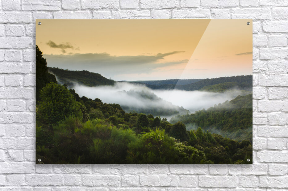 Fine art landscape photo on a misty morning view with an orange sunrise over Waratah Mountains in Tasmania Australia. Valley daybreak