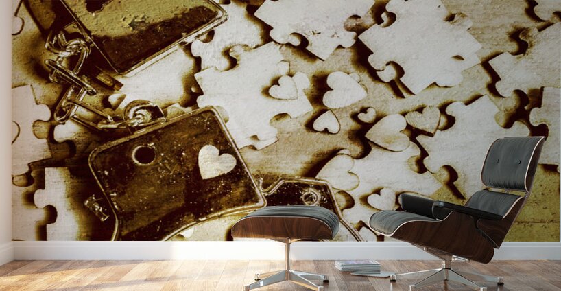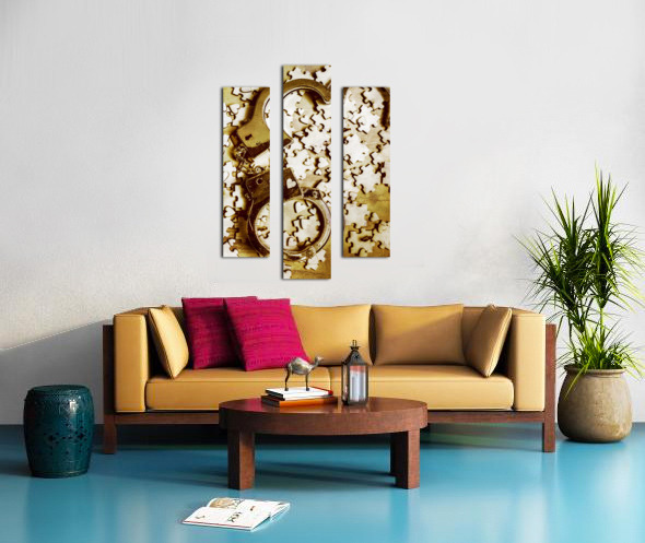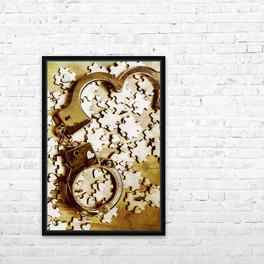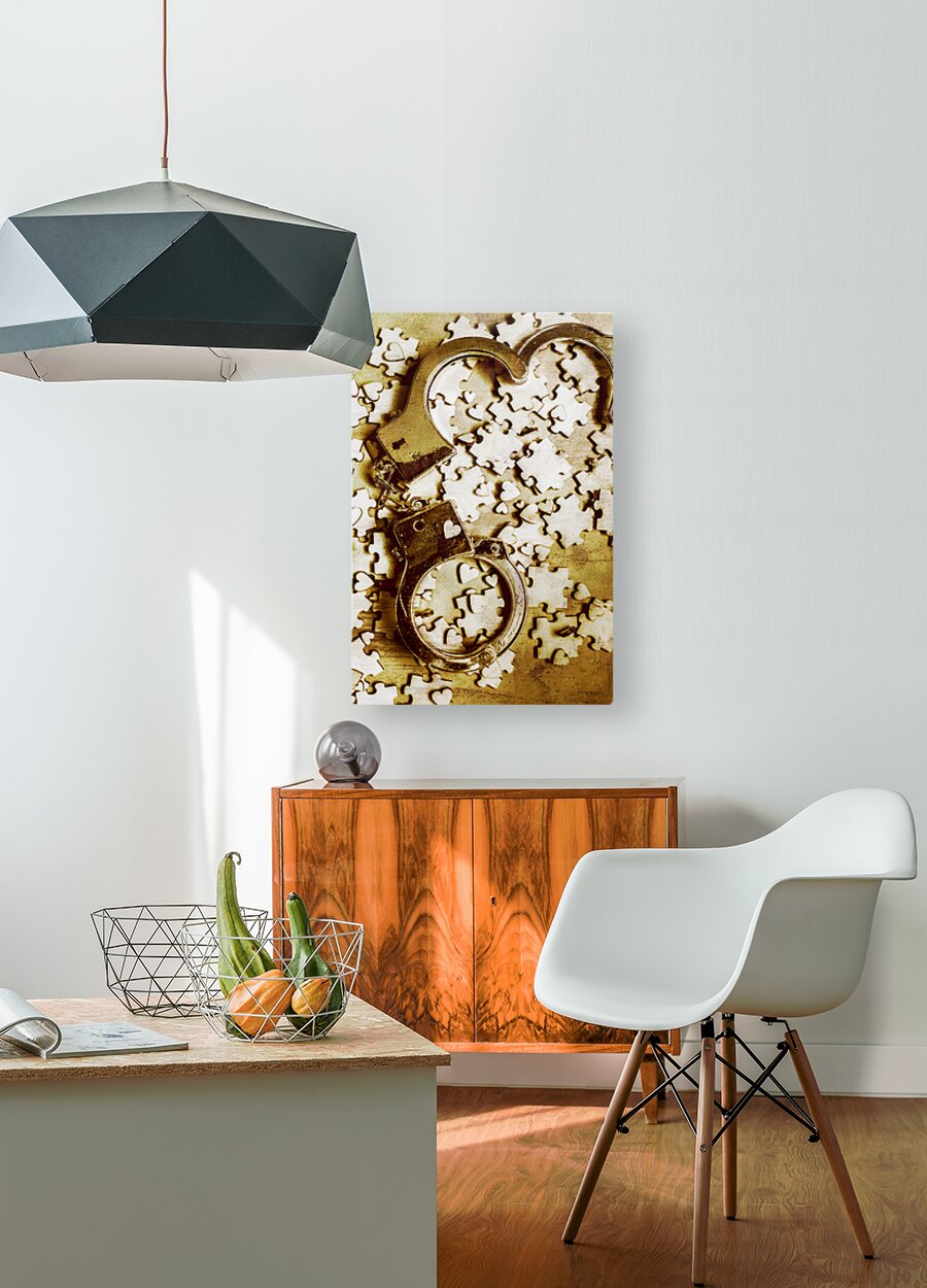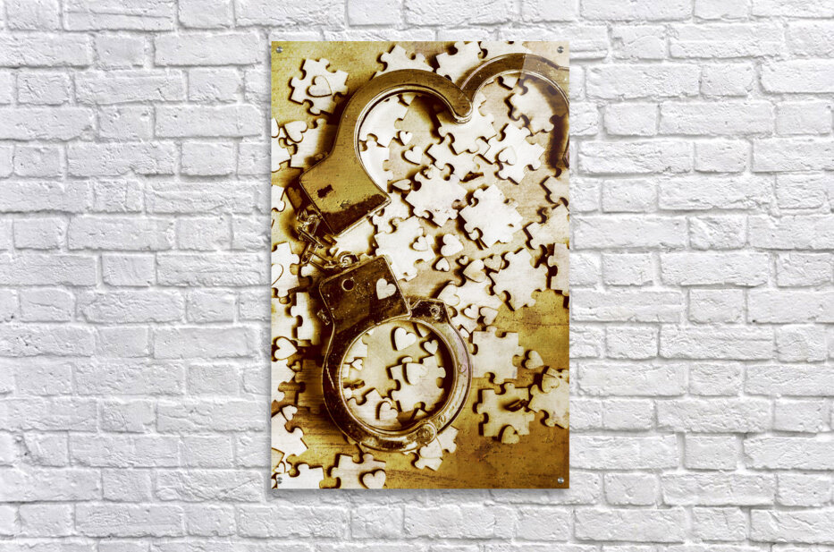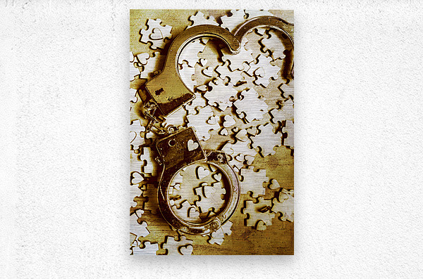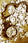 Wooden still-life art on hearts and jigsaw pieces placed with handcuffs of attachment and release. Criminal affair