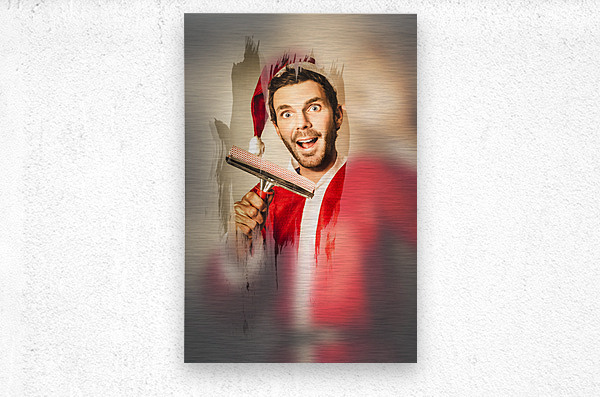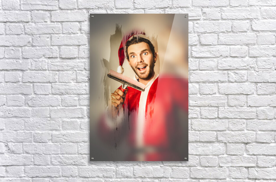 Christmas elf cleaning window frost at north pole with happy expression. Helping santa with x-mas holiday preparation