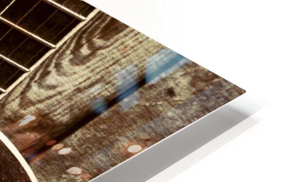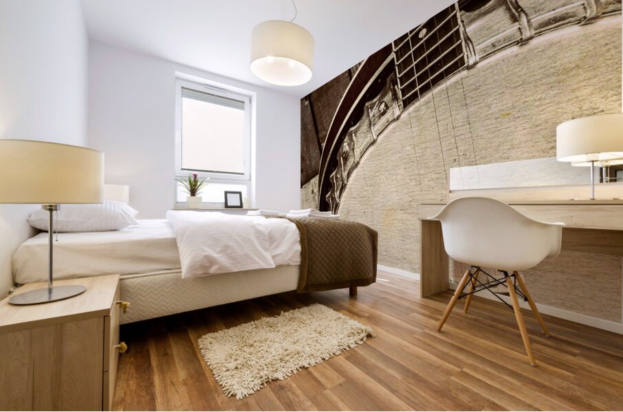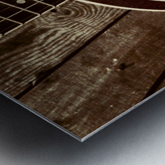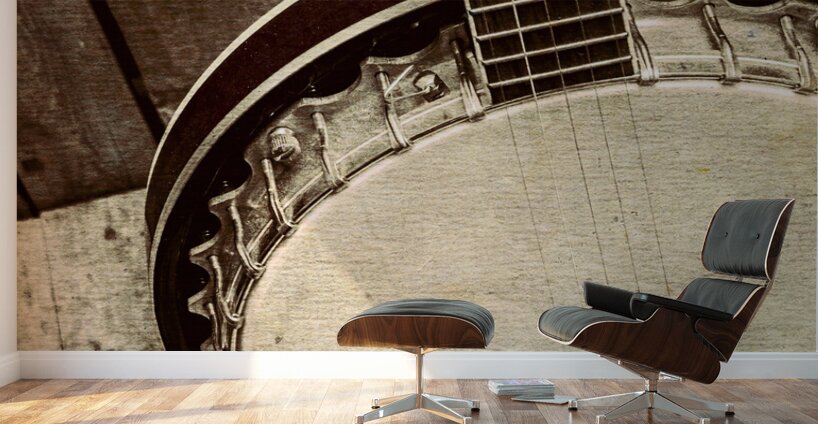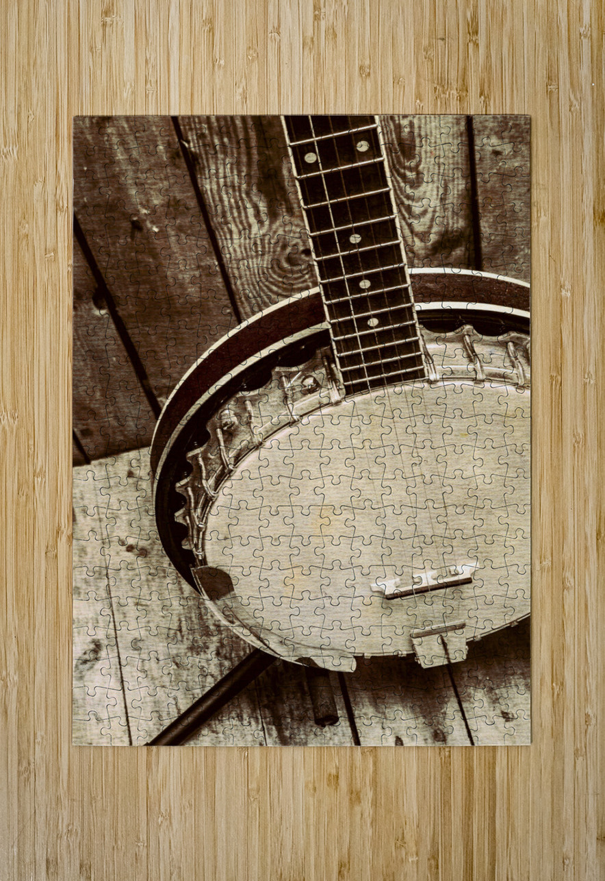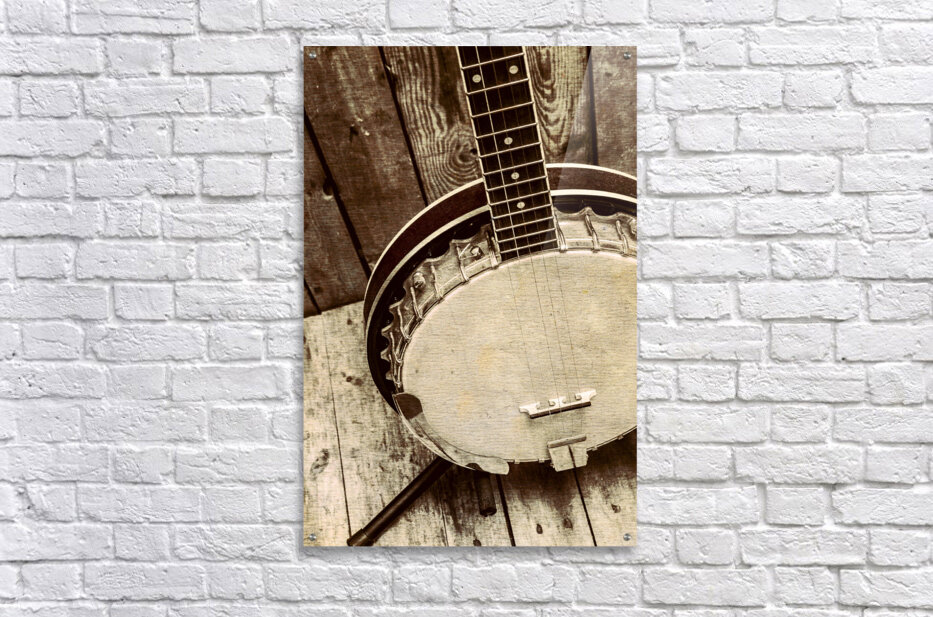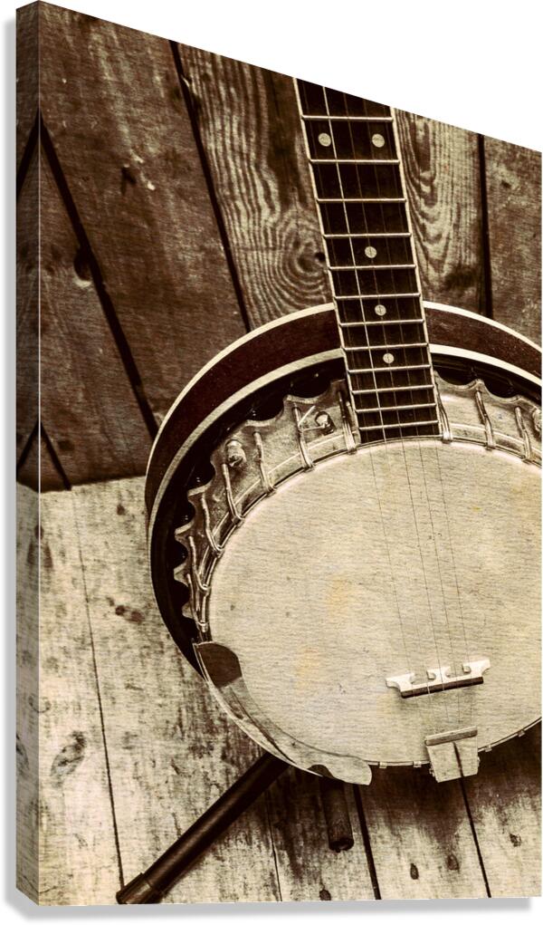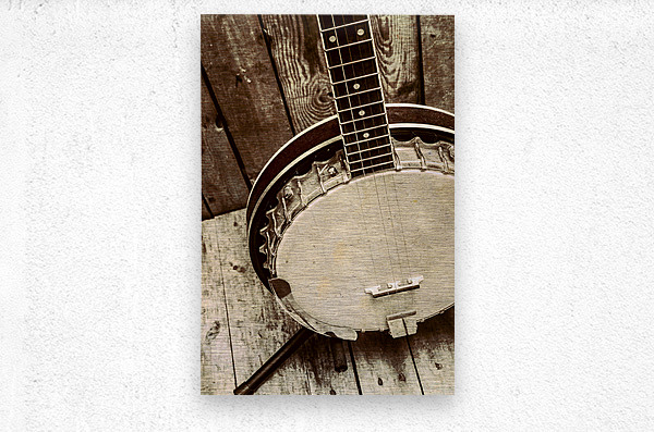 Old-fashioned closeup details on a textured 5 string acoustic guitar in sepia county style. Banjo barn dance