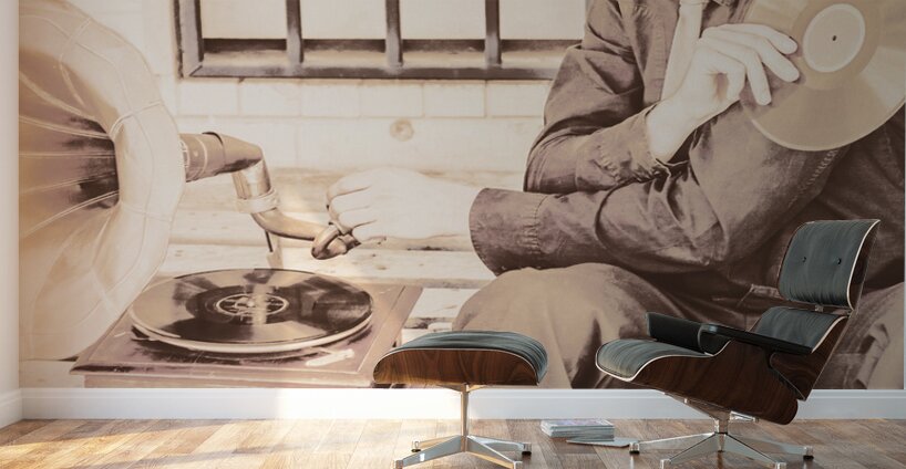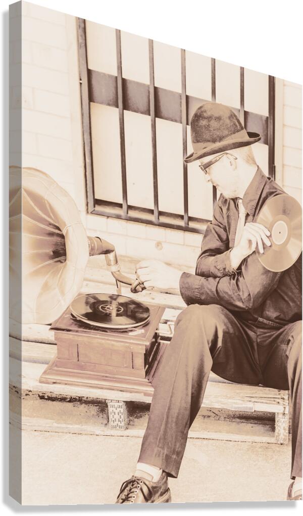 Old distorted grainy image of a vintage gramophone man adjusting needle in the backstreet of yesterday. Melody player