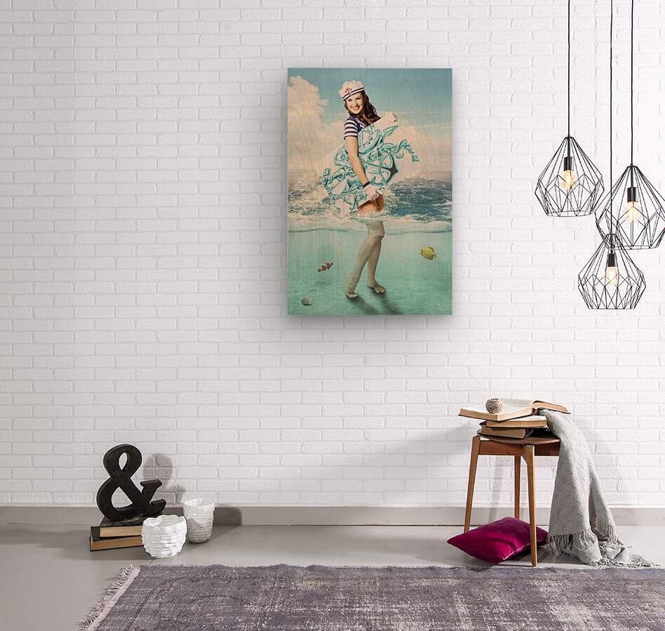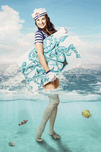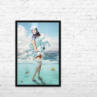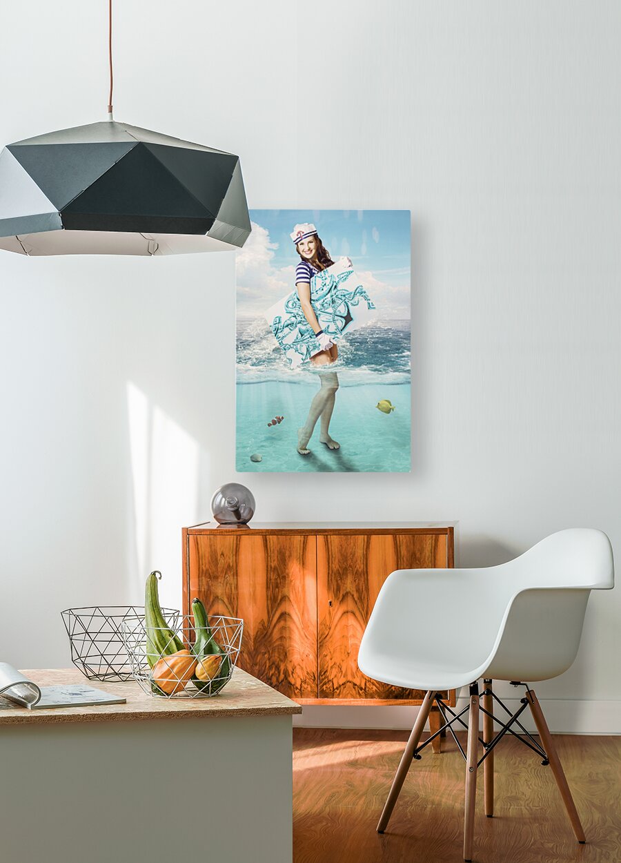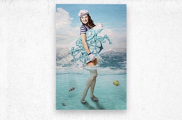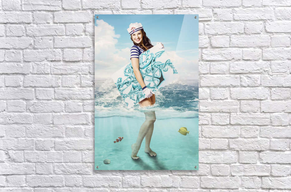 Fine art advertising of beautiful Australian sailor pin-up woman standing in ocean waves holding large blank sign board. Nautical copy space