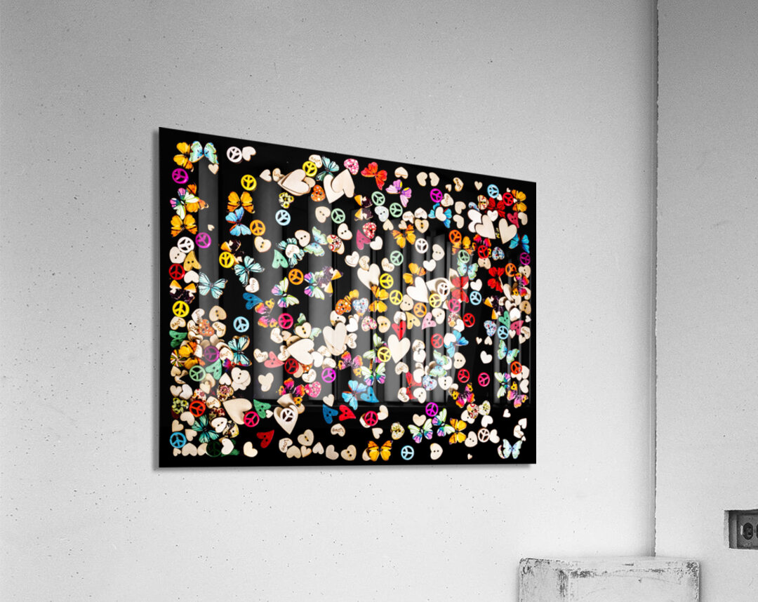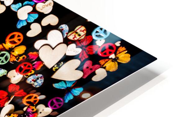 A stock of wooden hearts butterflies and peace pendants abstracted. Woodstock decorated