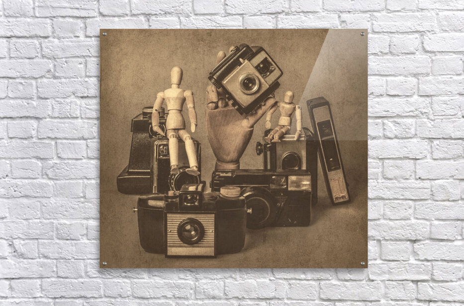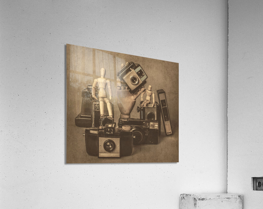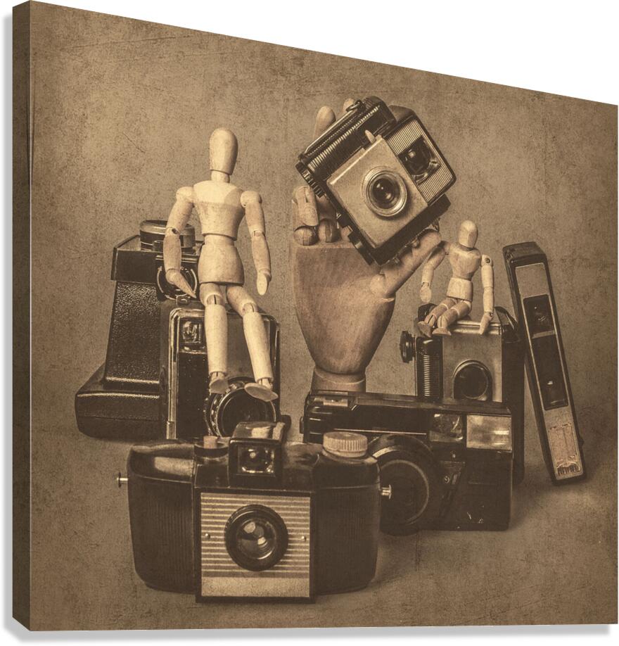 A fictional scene of played out vintage games with old art dolls staged around photography equipment