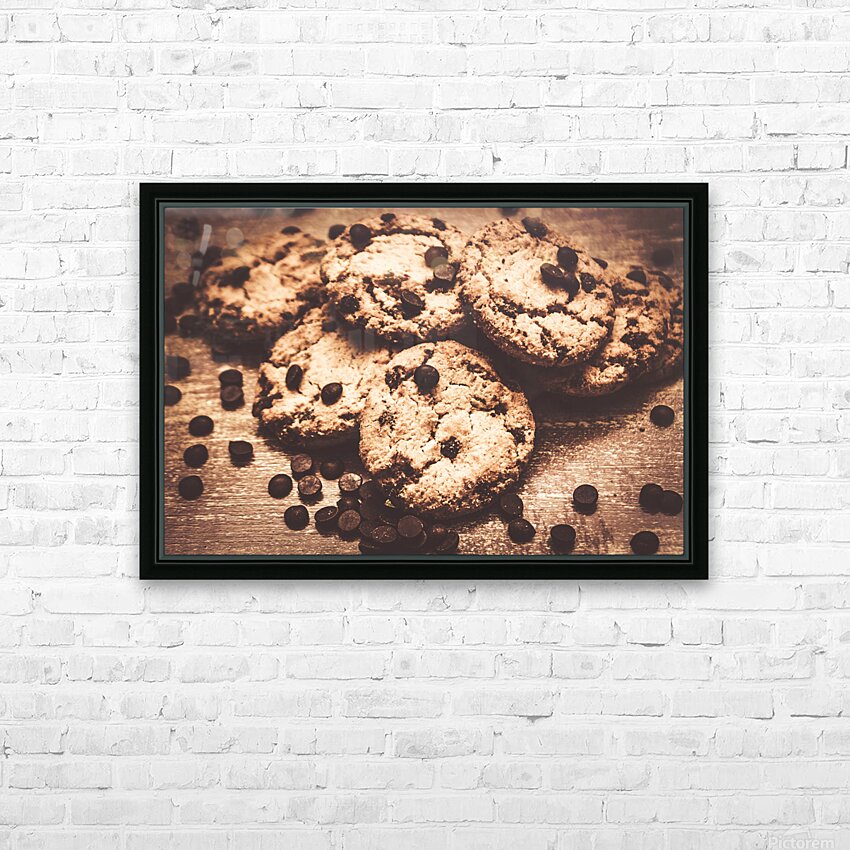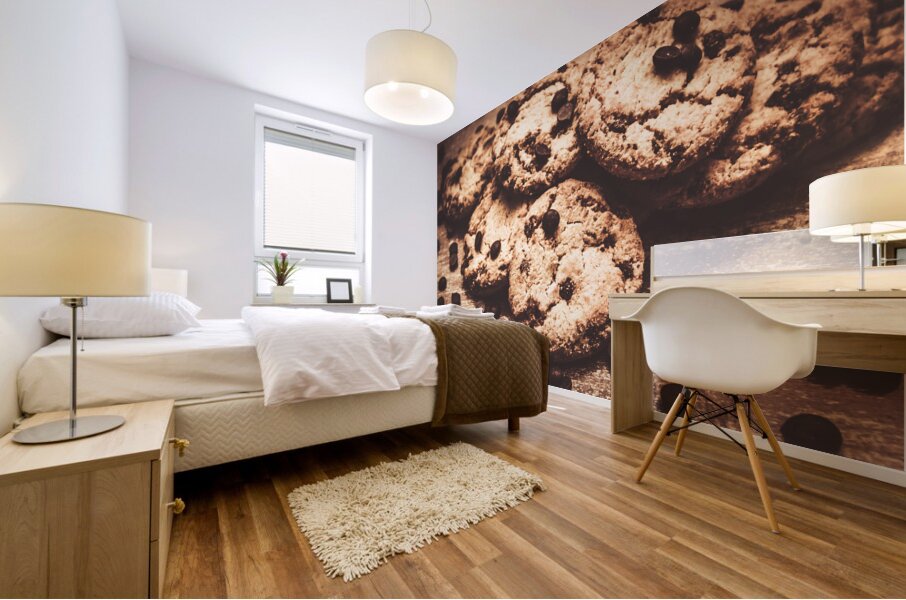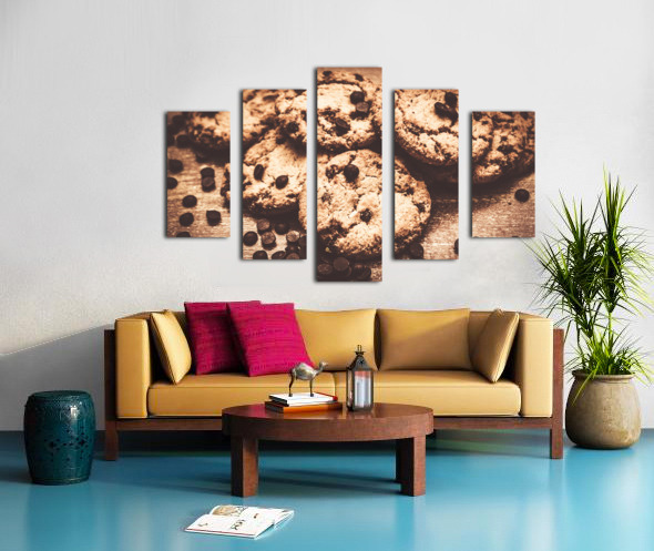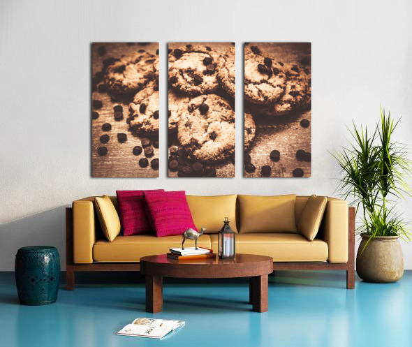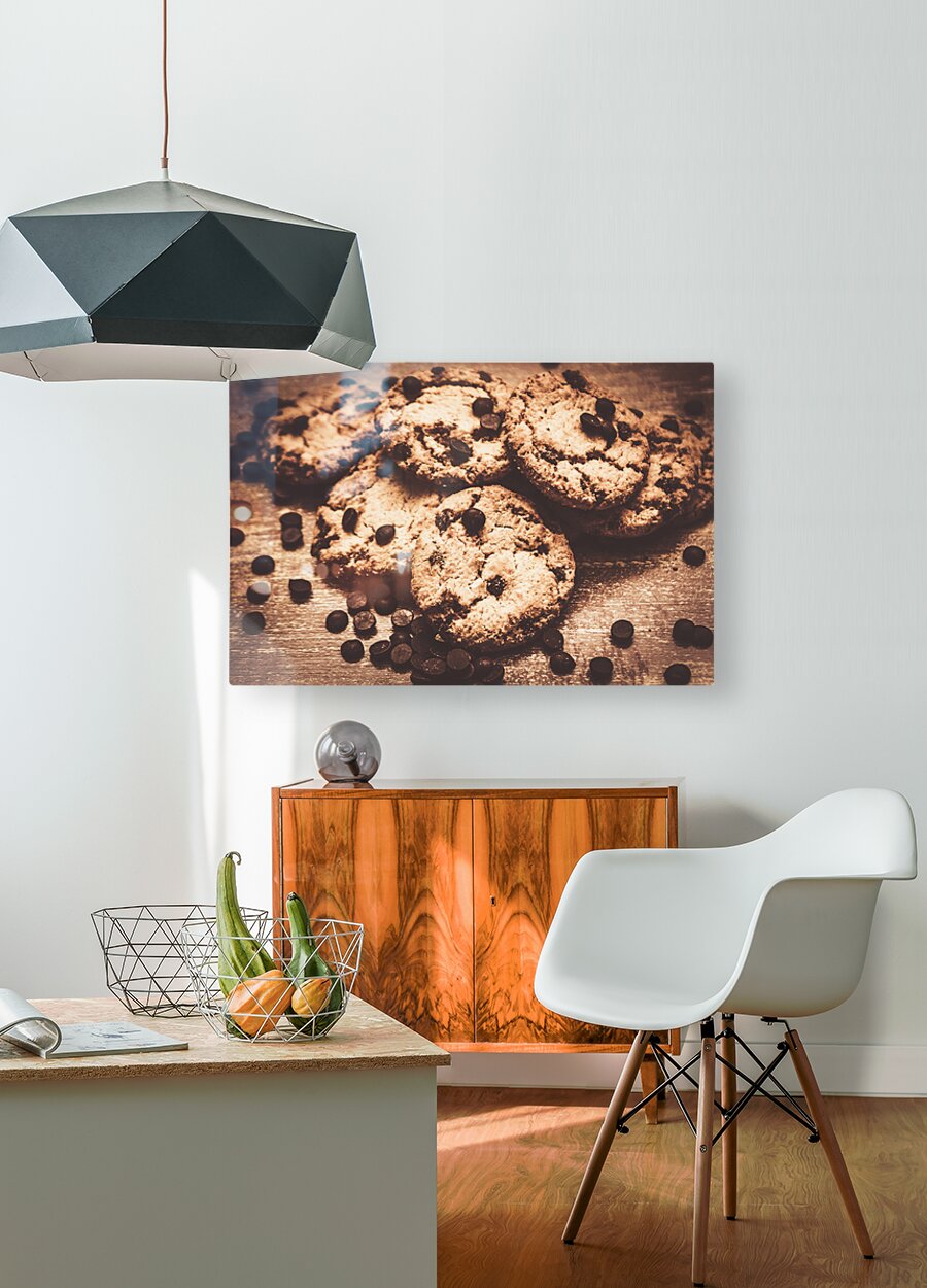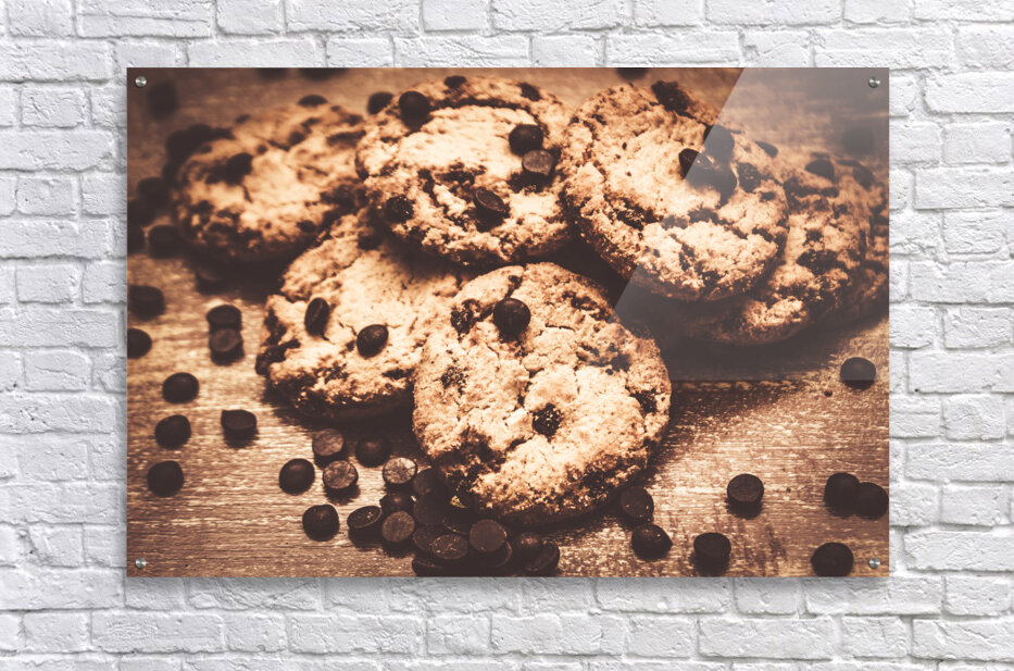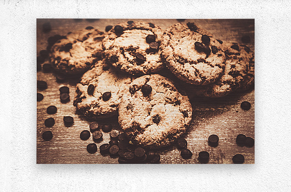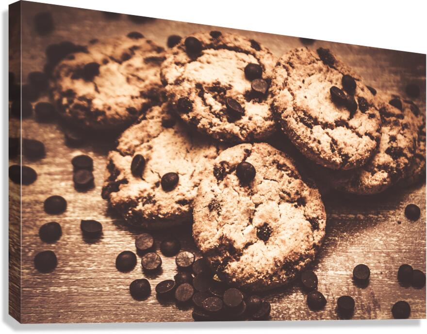 Brown toned kitchen artwork on a stack of old-fashioned freshly baked cookies decorated with chocolate chips on rustic bench