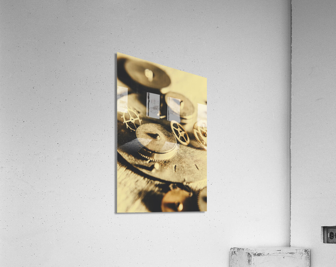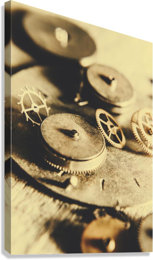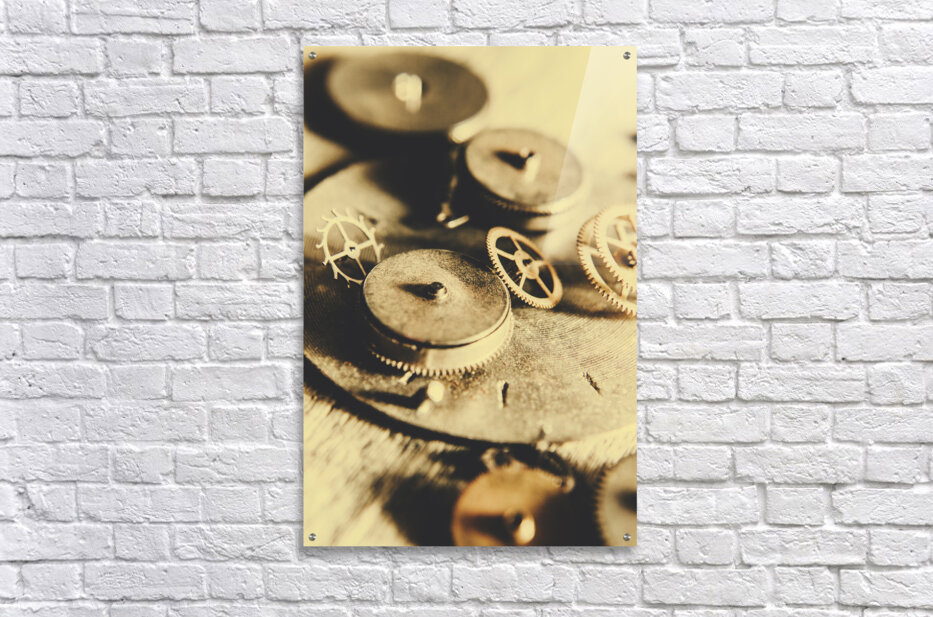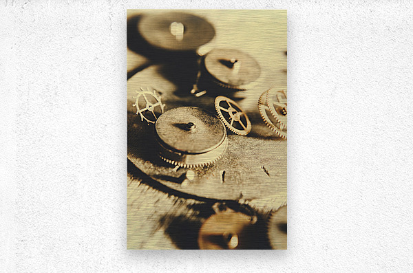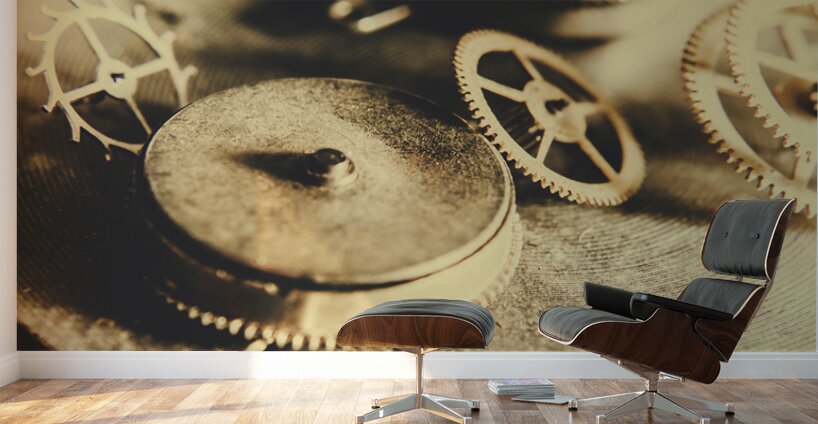 Old factory design art inside a broken clock of engineering precision. Cog and gear workings