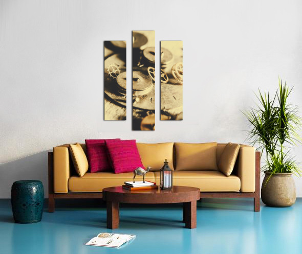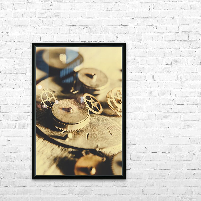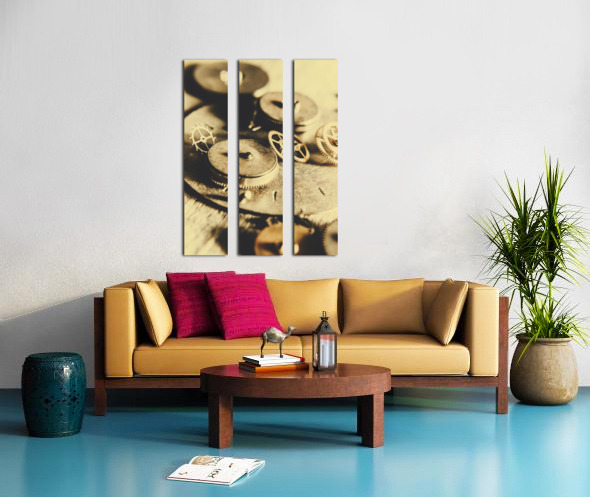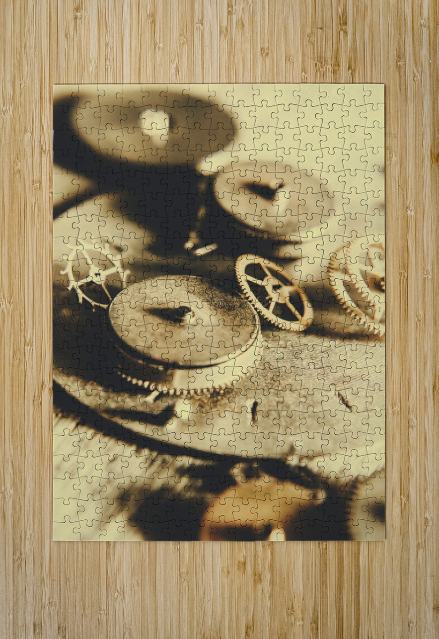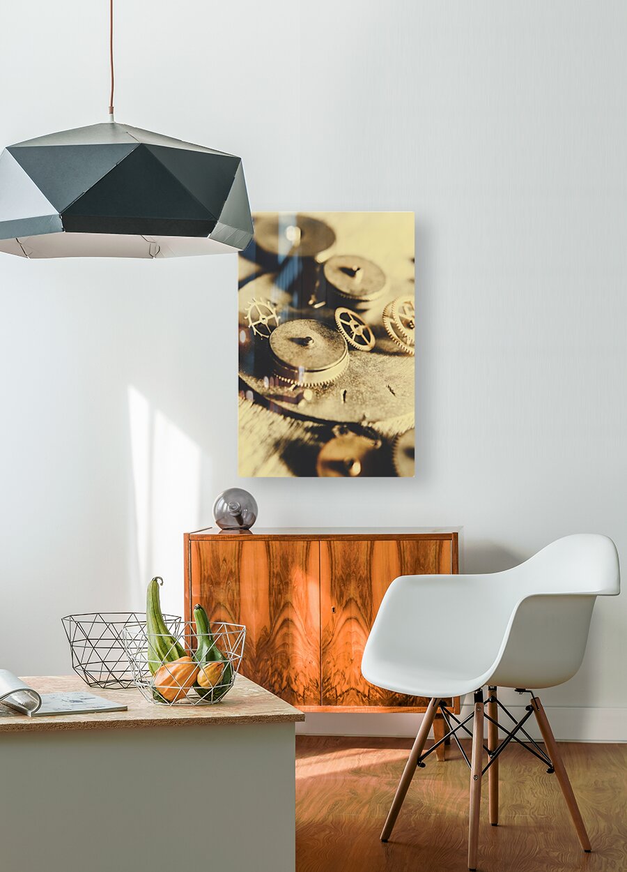 Old factory design art inside a broken clock of engineering precision. Cog and gear workings