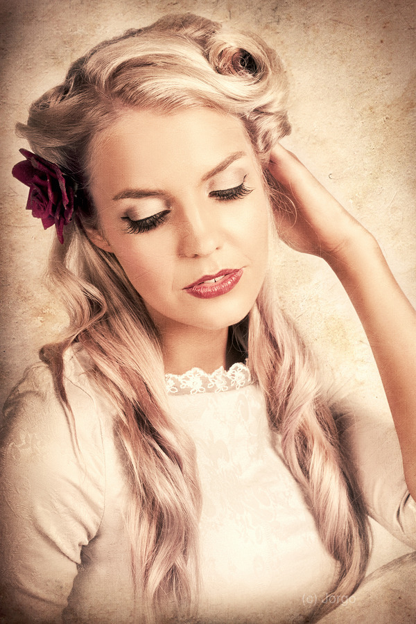 Forties Era Classic Portrait With Texture Of A Posing Vintage Blond Beauty In Elegant Frill And Lace Dress