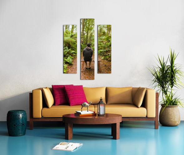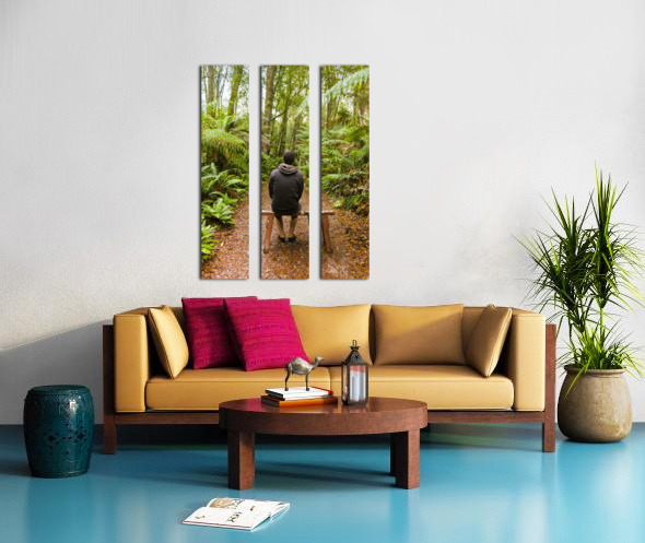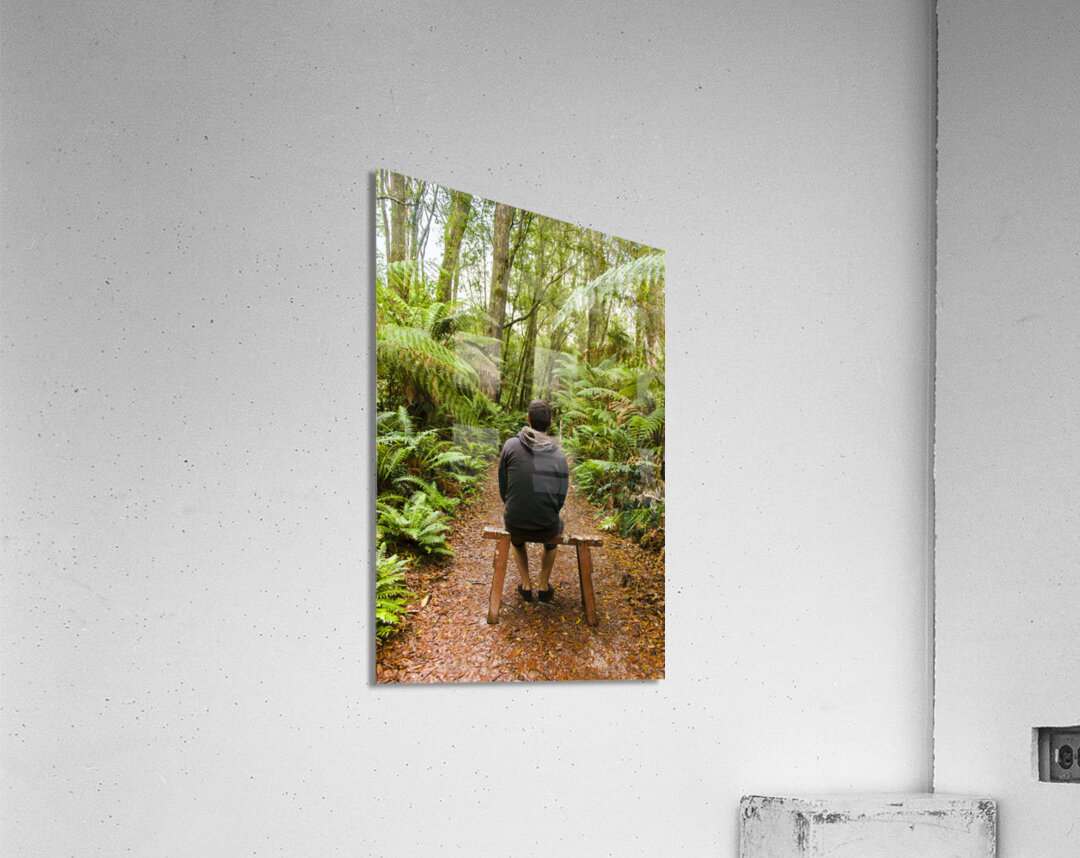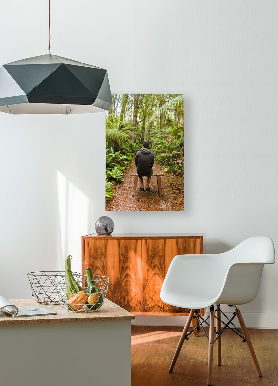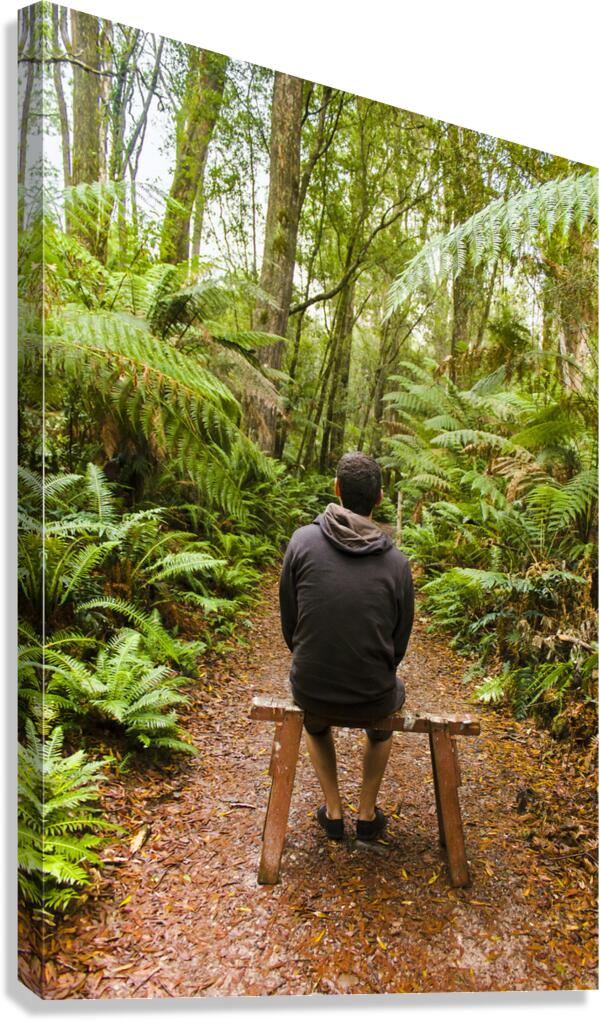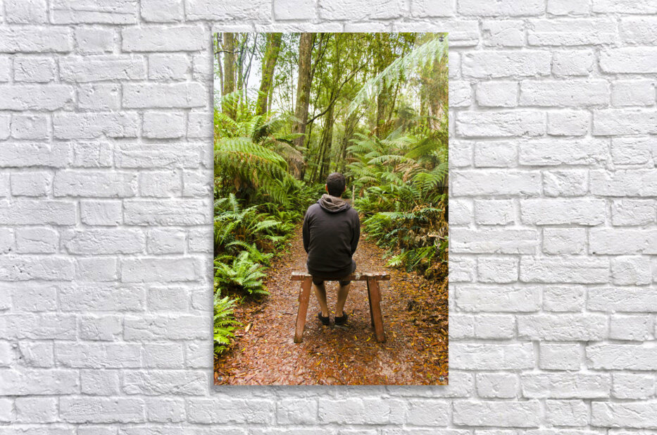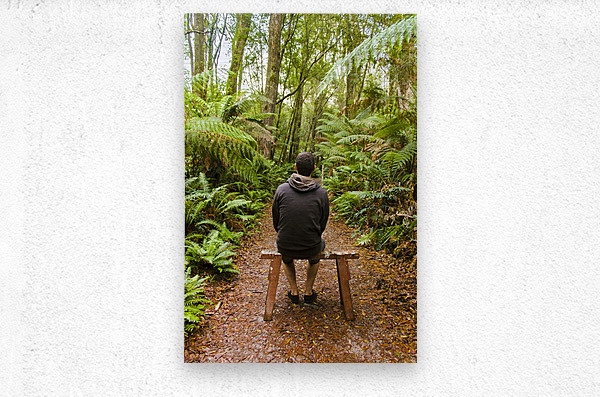 ABOUT THIS ARTWORK: TRAVEL MAN SITTING IN A GREEN LUSH FERN FOREST
