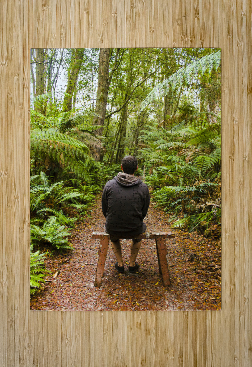 Travel man sitting in a green lush fern forest Jorgo Puzzle printing