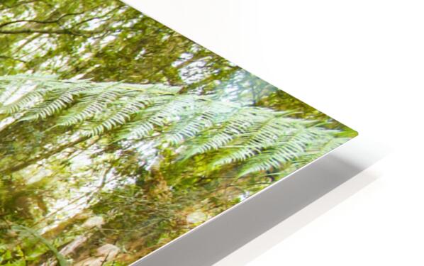 Color rear view photo of a young travel man sitting in a green lush fern forest on the Hogarth Falls Walk during a summer vacation to Strahan in West ...[+]