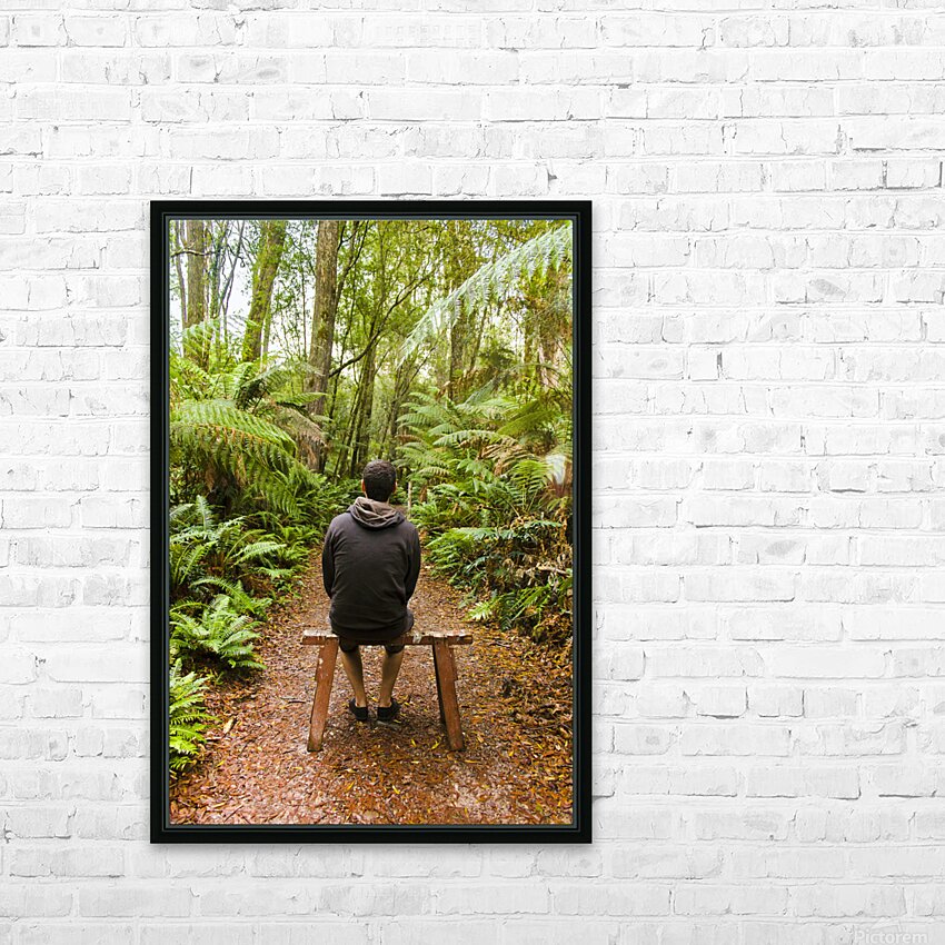 Travel man sitting in a green lush fern forest Picture Frame Printing