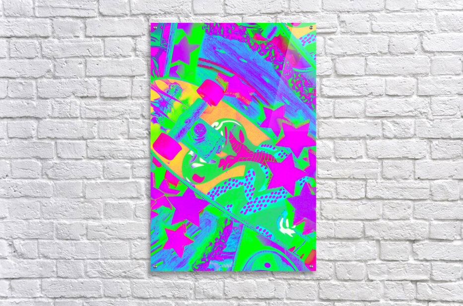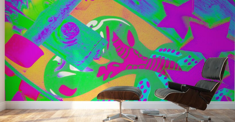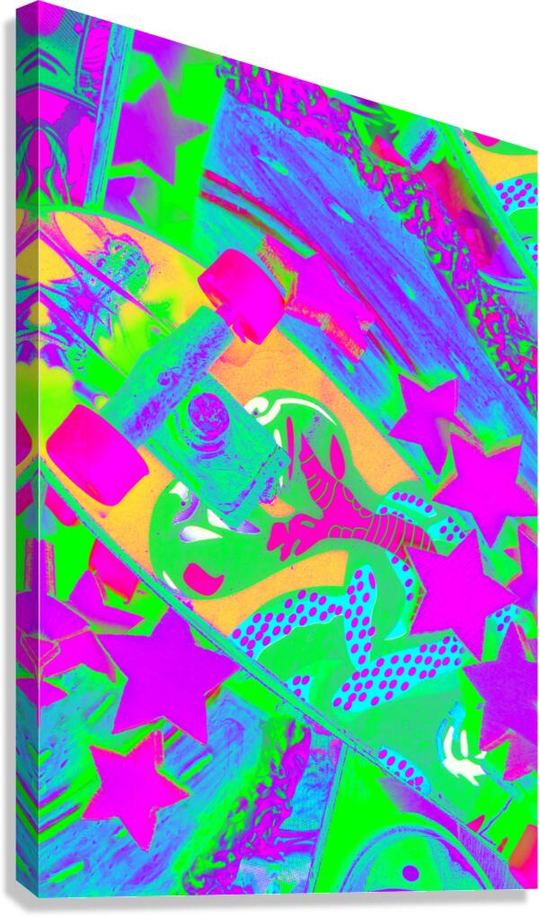 Comic pop art on a fluoro skateboarding scene of stars dots and road stripes. Deckoration