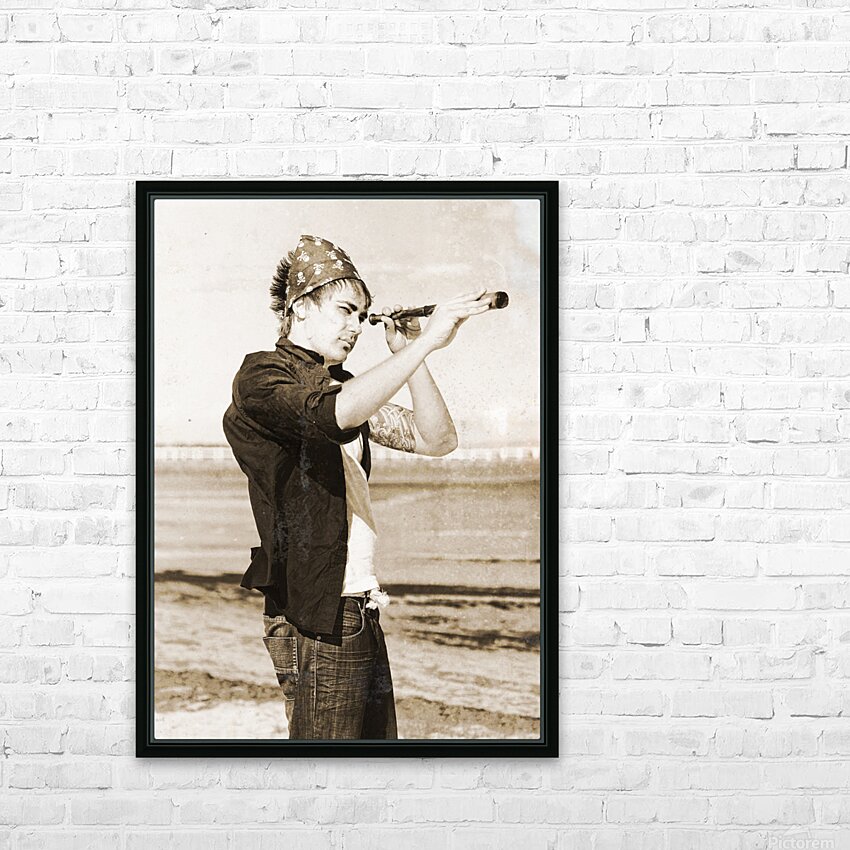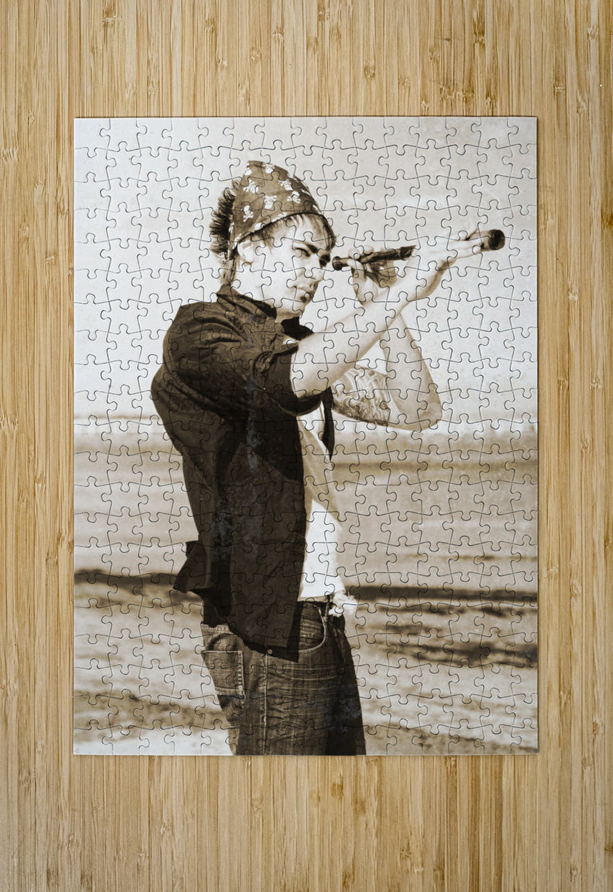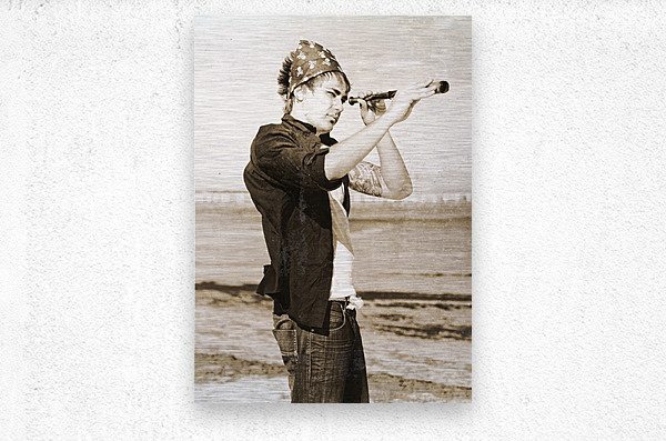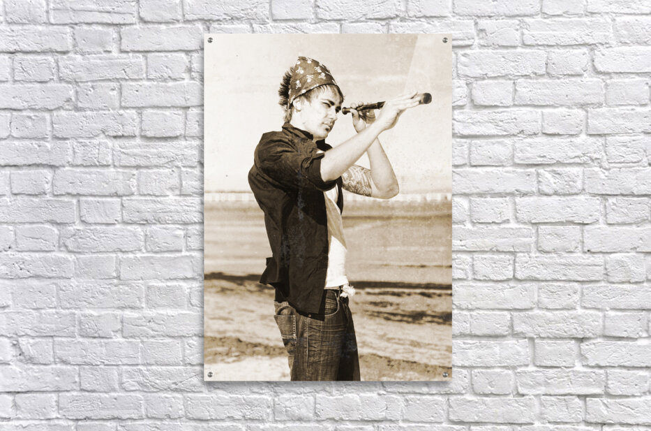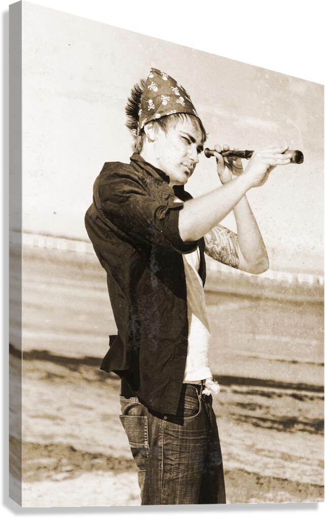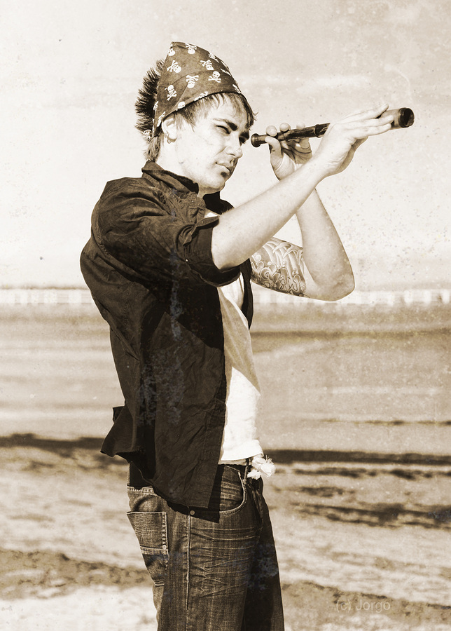 Textured Grungy Portrait Of A Pirate Looking Through A Old-Fashioned Optical Telescope Spying Into The Horizon Of Future Dreams