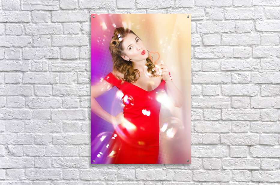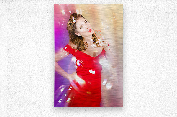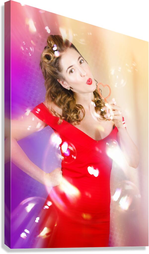 Beautiful pin-up girl at retro disco dance party blowing bubbles to music on club dancefloor with retro lights and ballroom glitter. Event pinups
