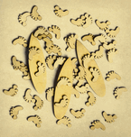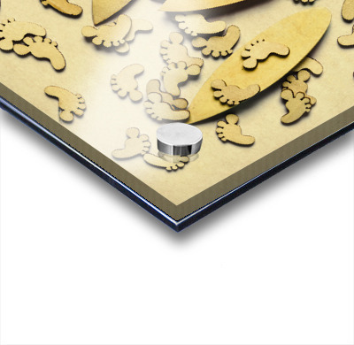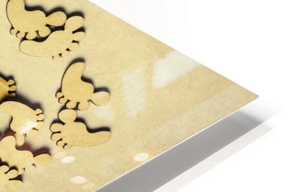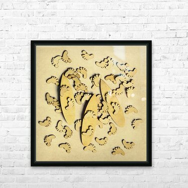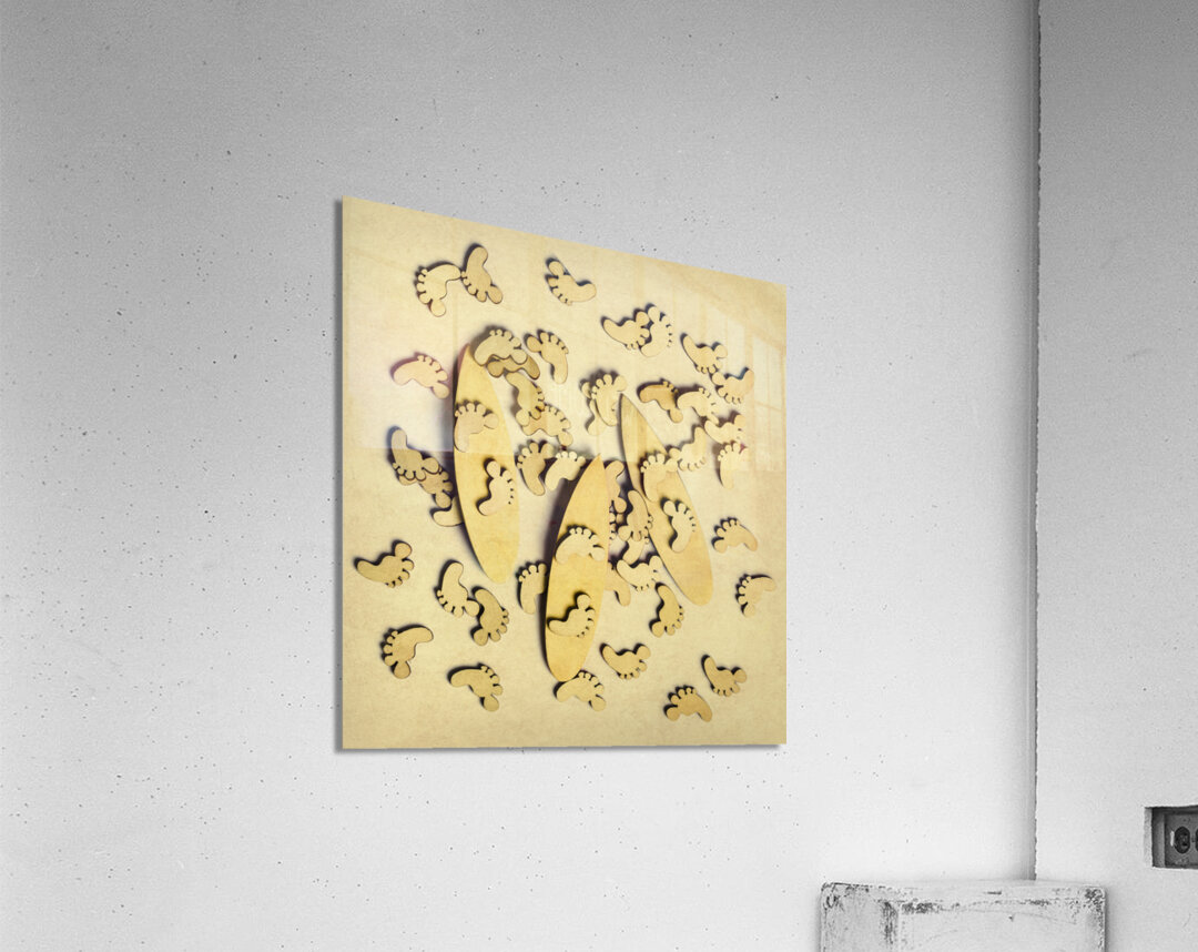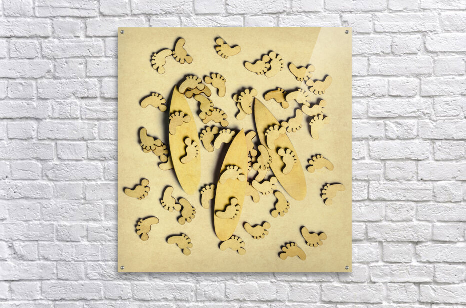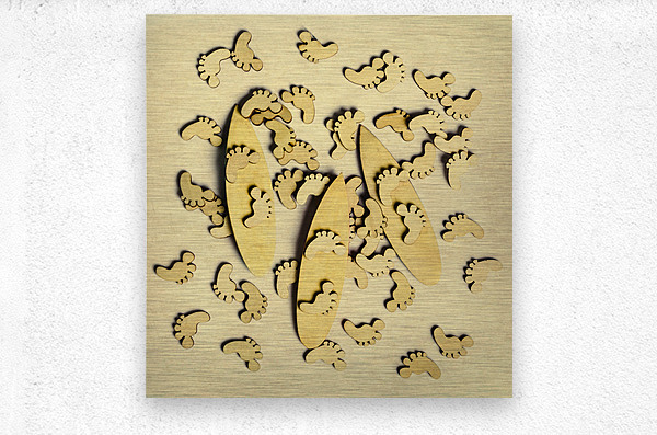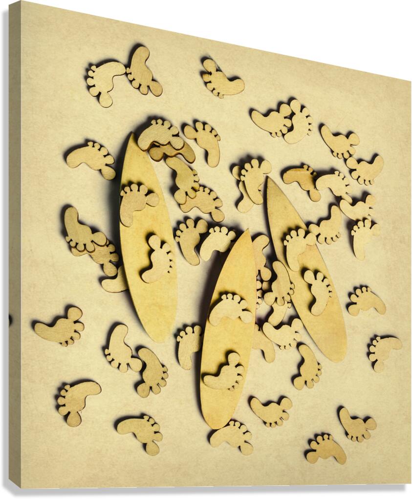 Creative object art in a representation of fun surfing feet on cardboard seas. Wooden wave riders