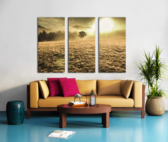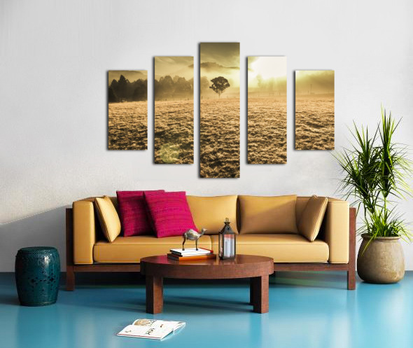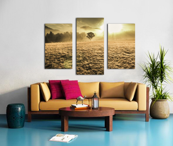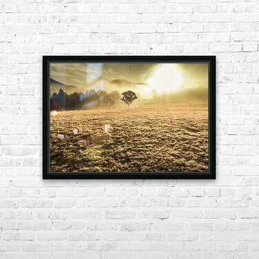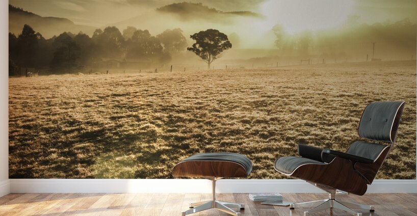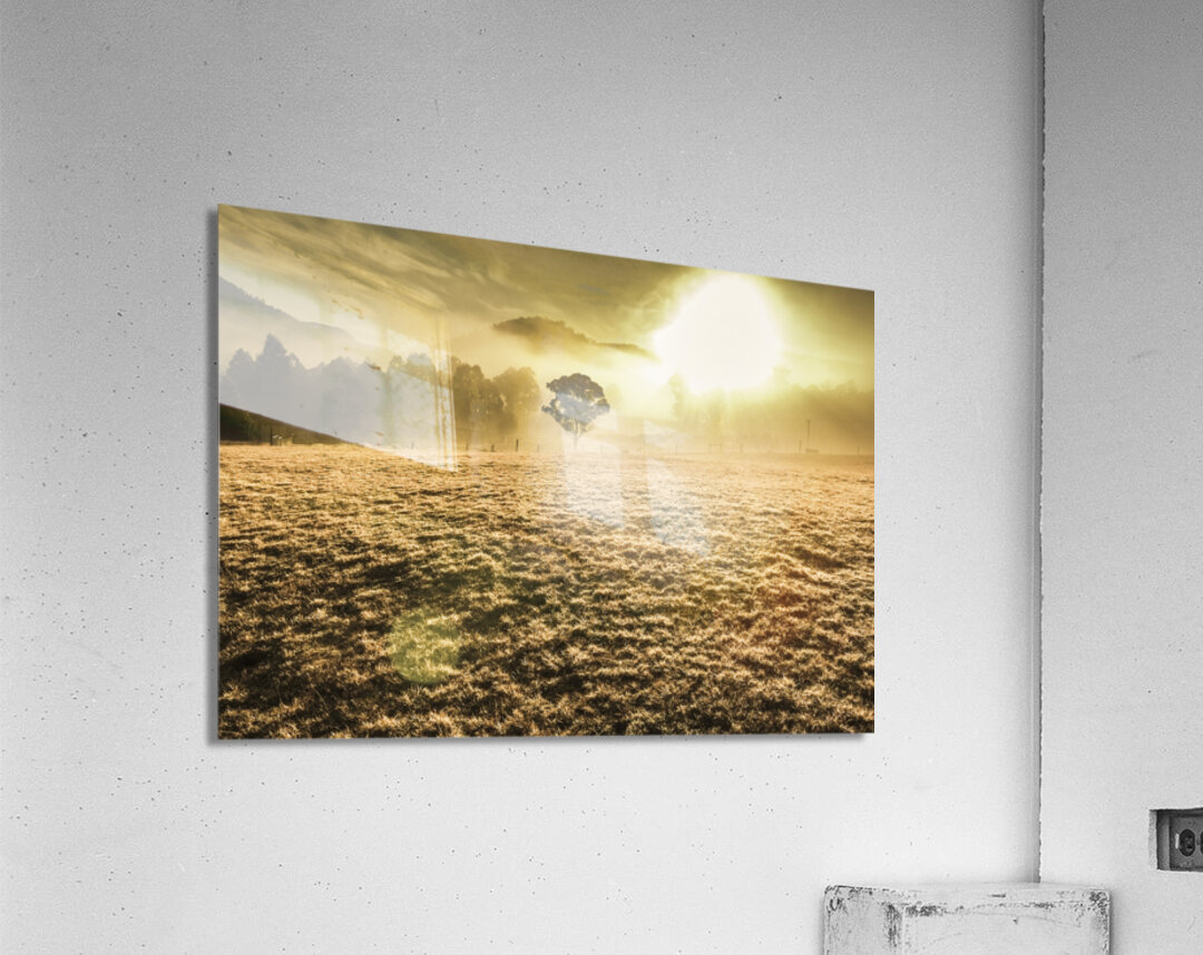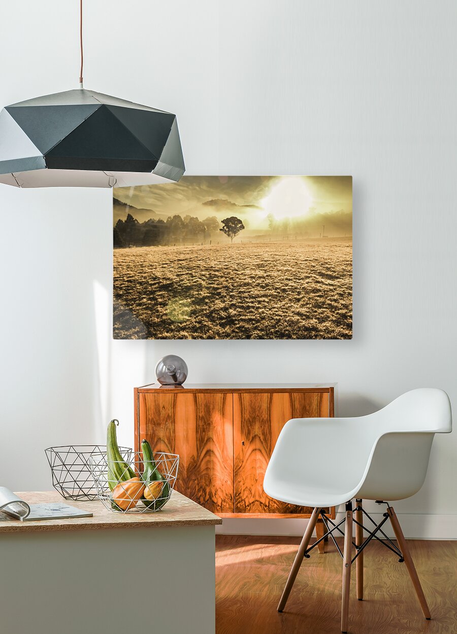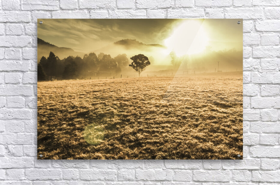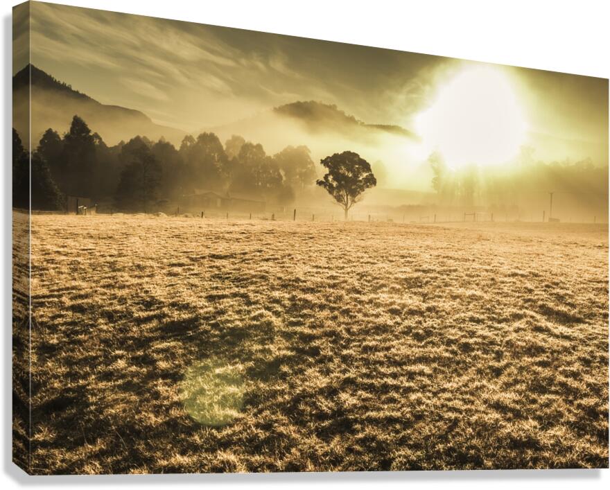 Dramatic dusk landscape of a enigmatic grassland lit my foggy sunlight complete with lens flare. Tasmanian farmland taken Judbury