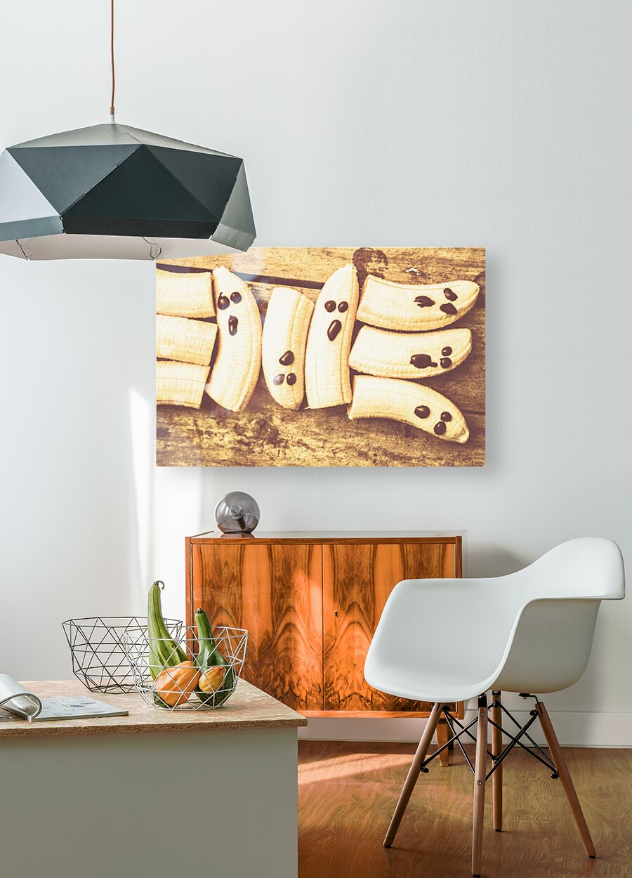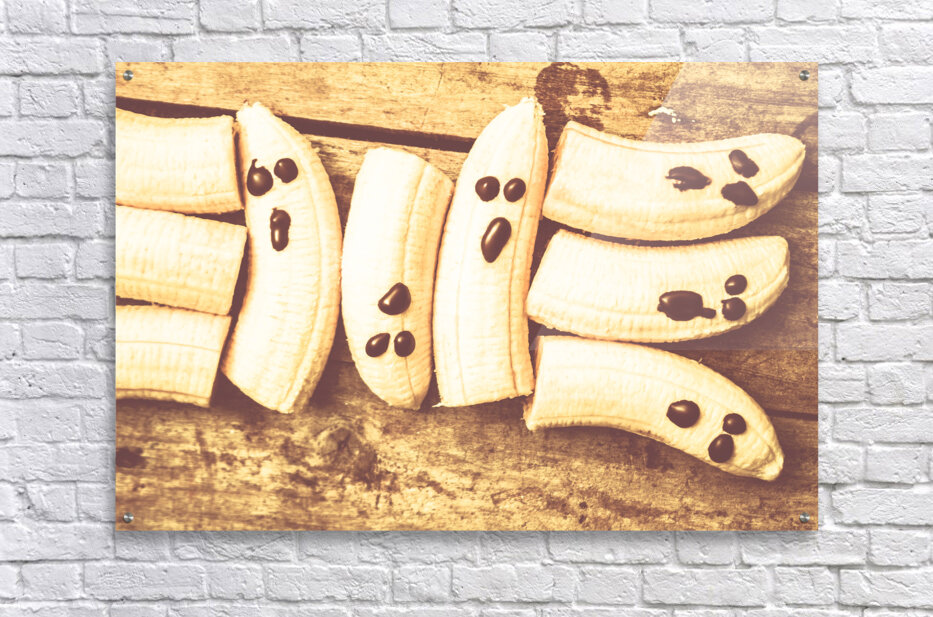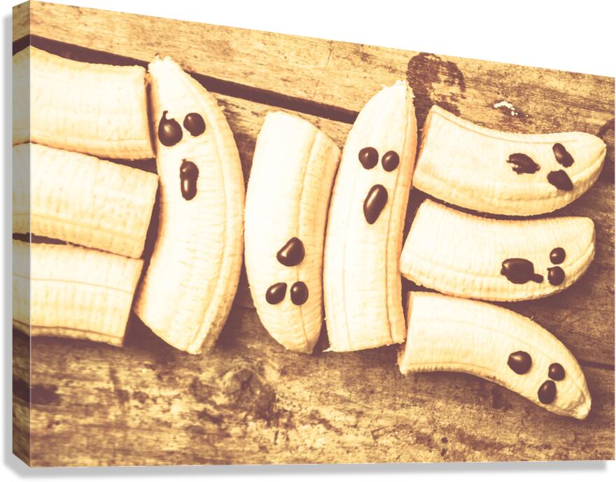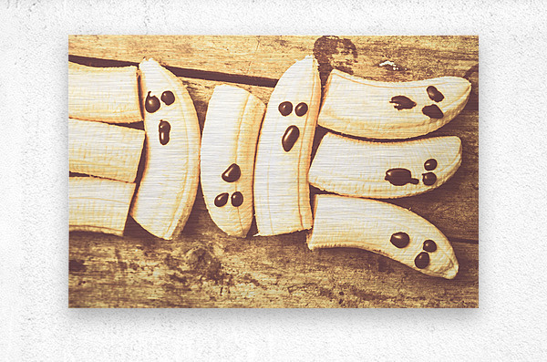Scary halloween still life on a stack of fruity ghosts on rustic country kitchen bench. Healthy halloween dessert