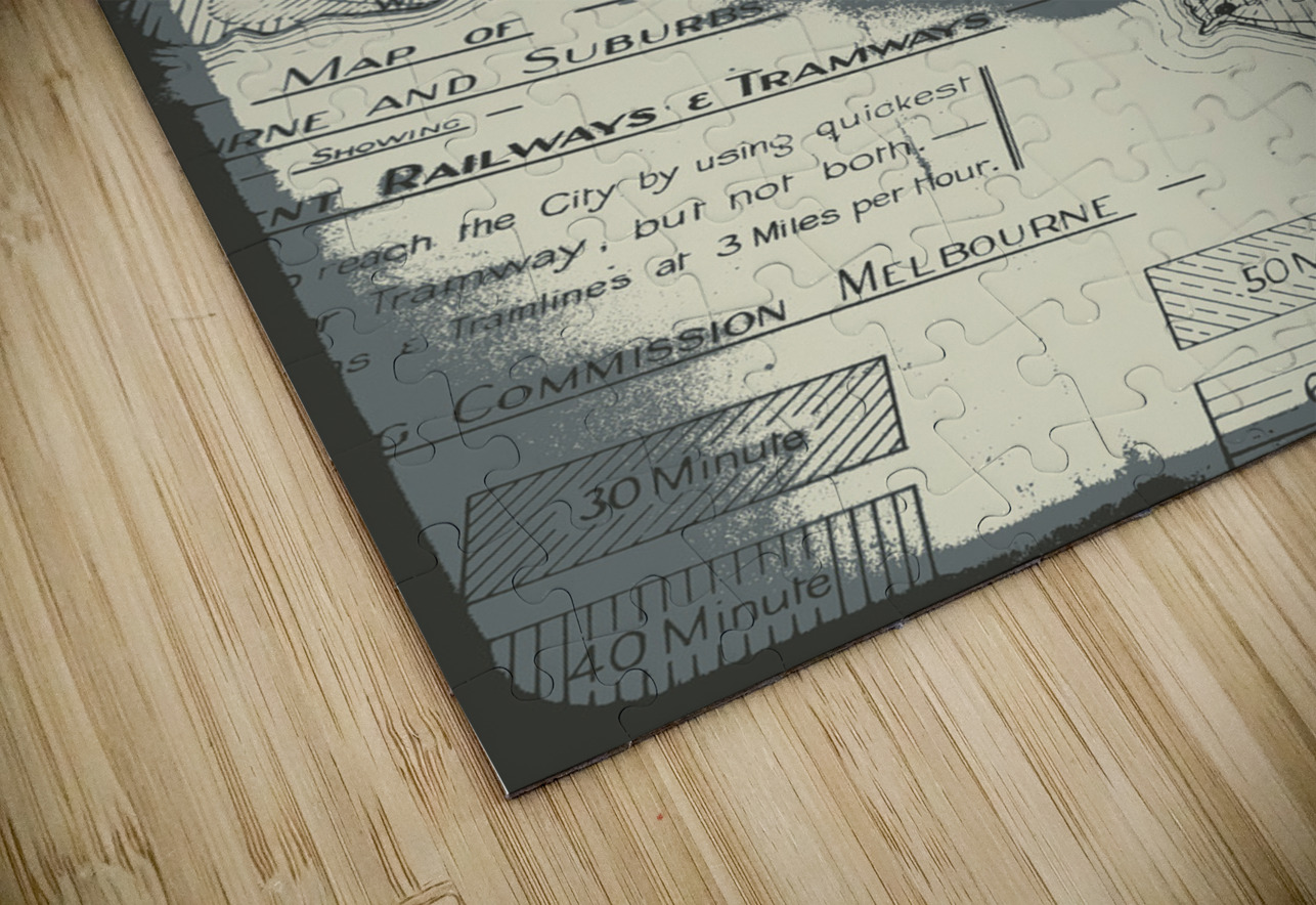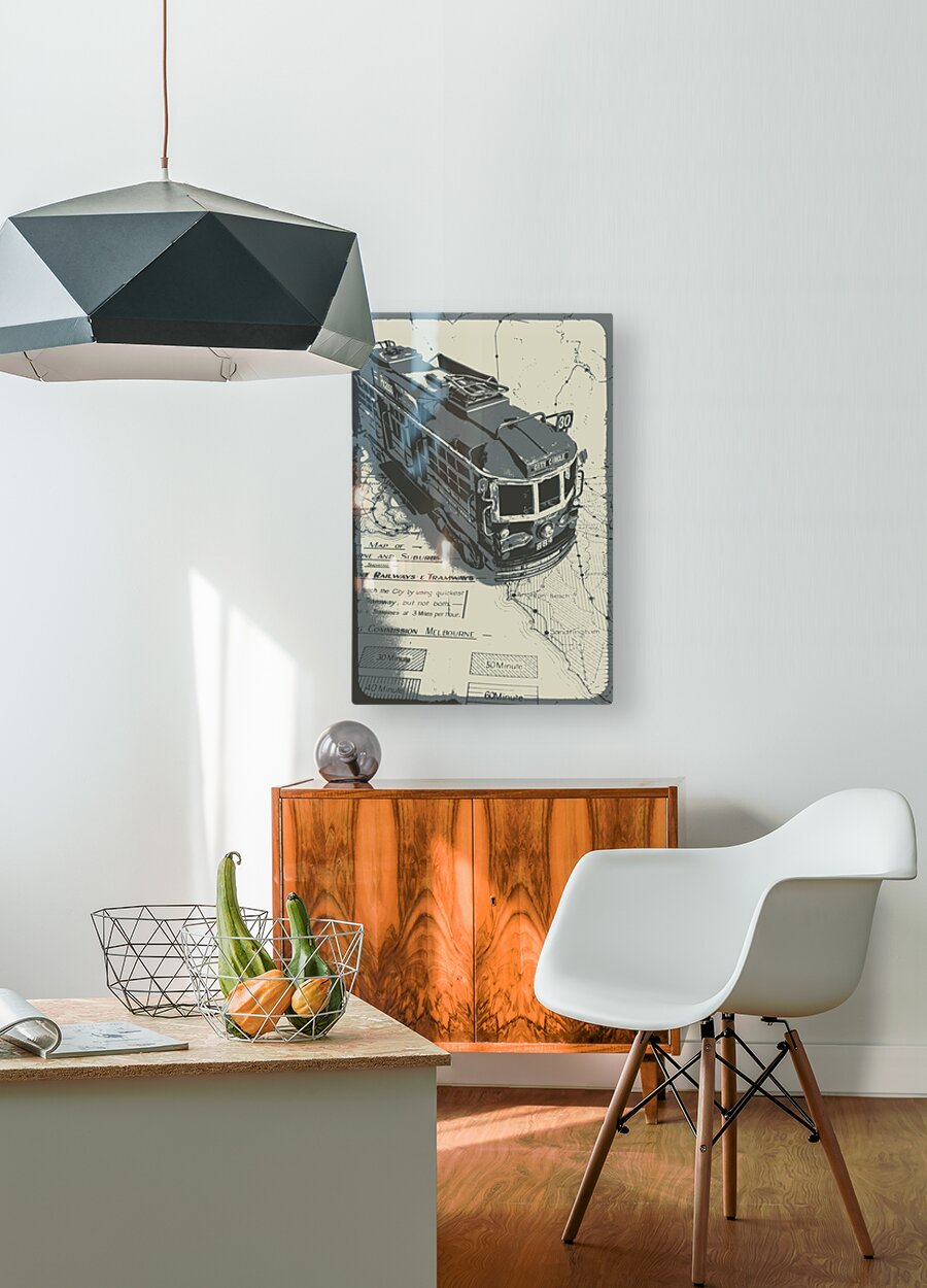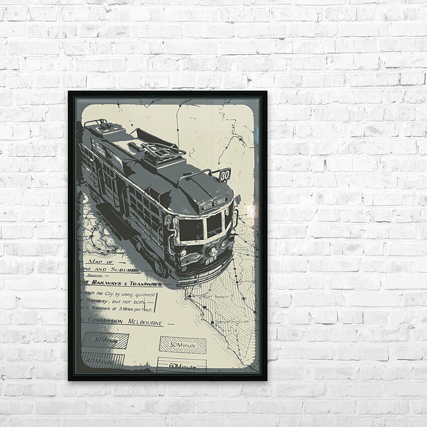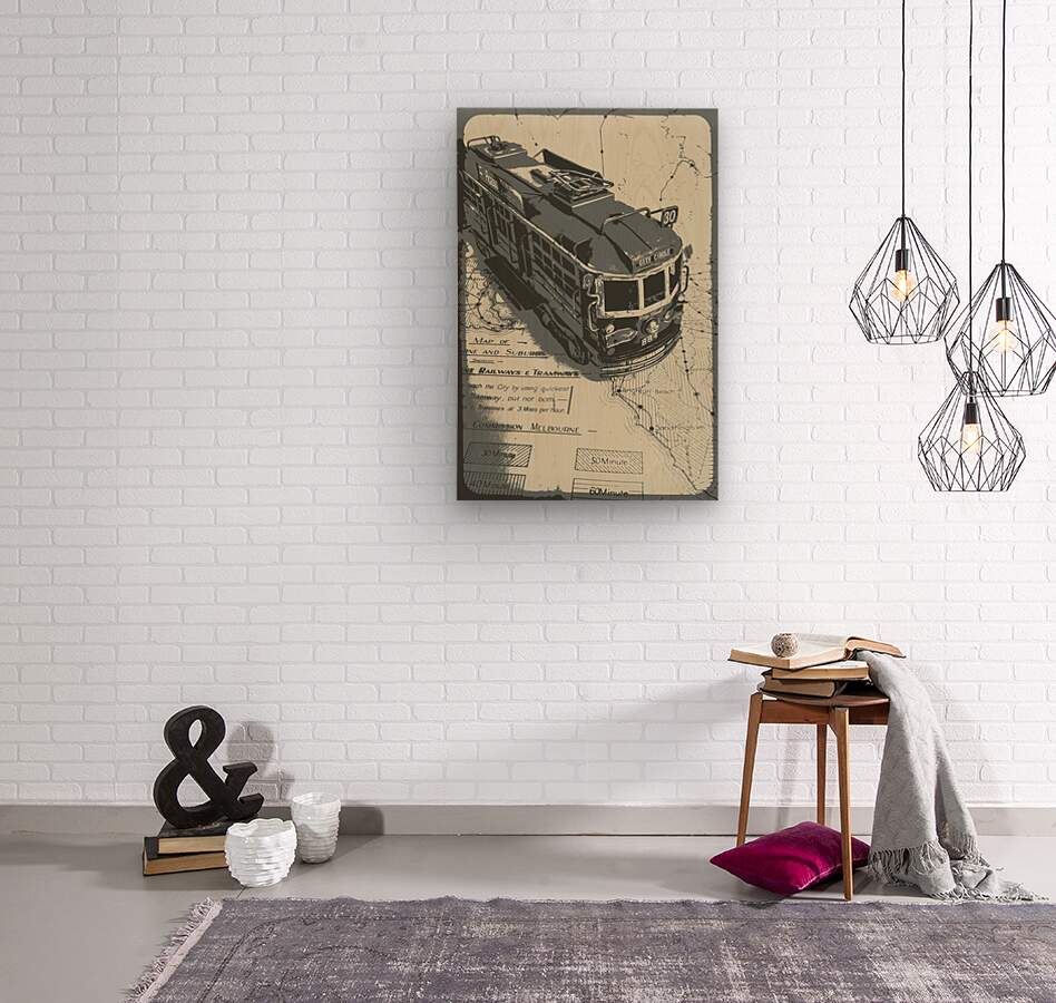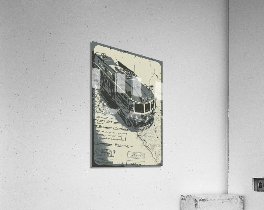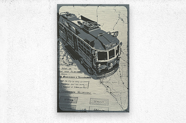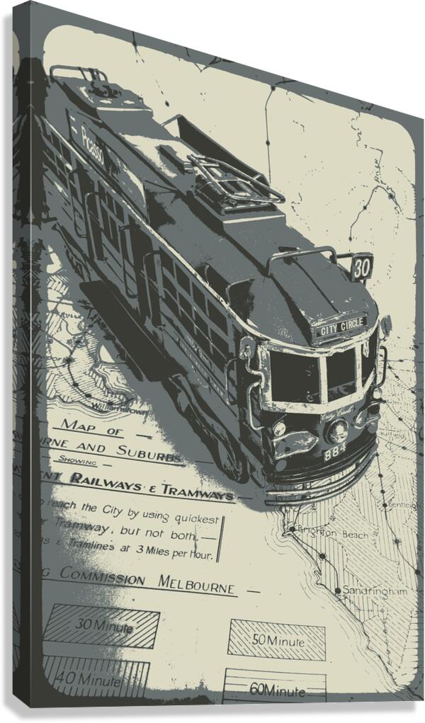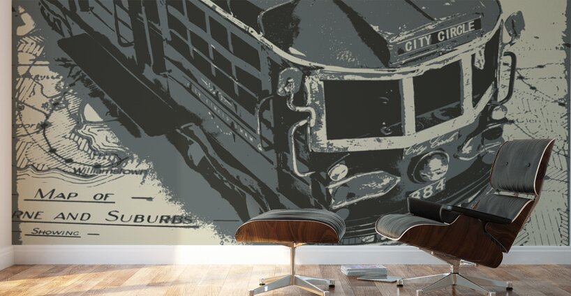 Wall artwork design on a posterized Melbourne City Circle tram navigating the old world of Victoria on authentic tram route map background