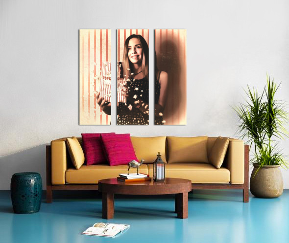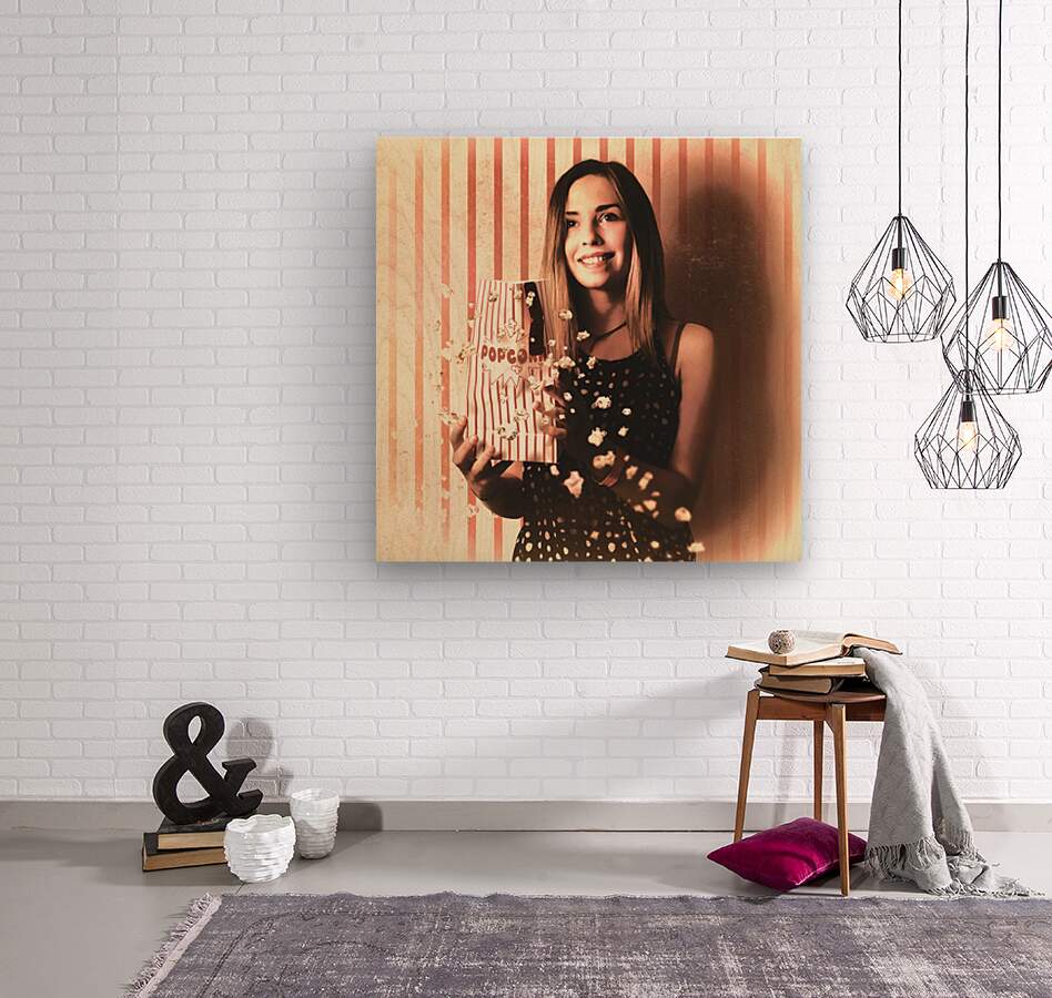 Vintage cinema girl with movie popcorn. Retro film  Wood print