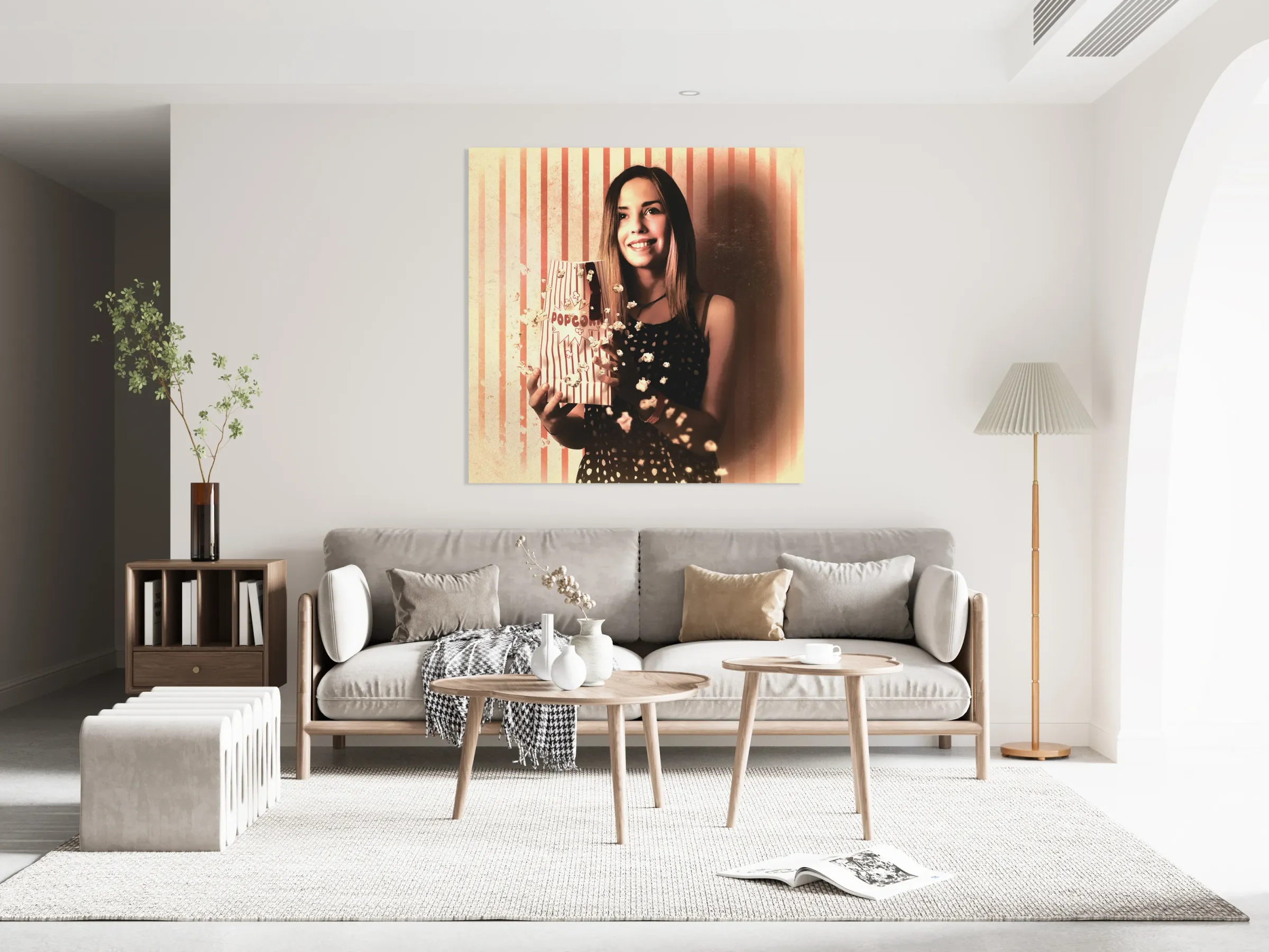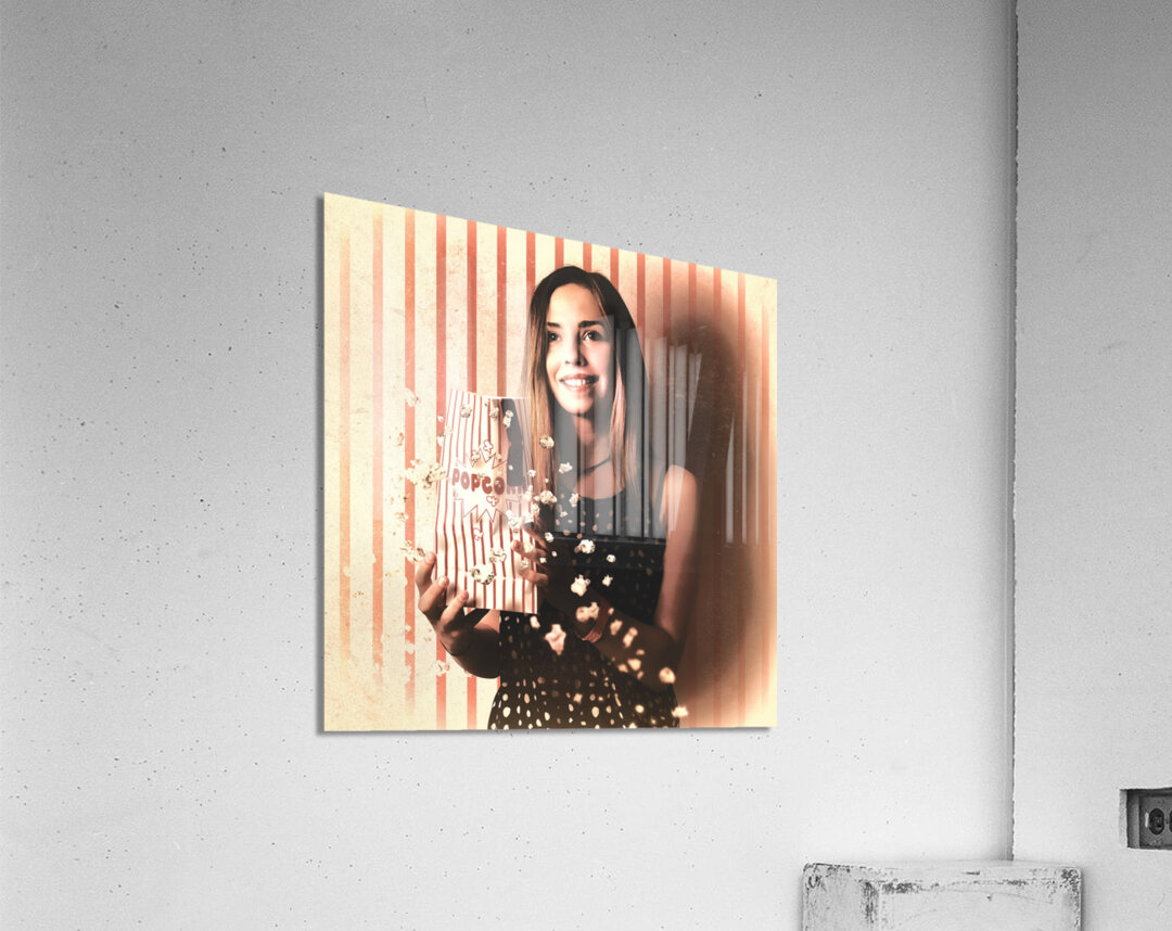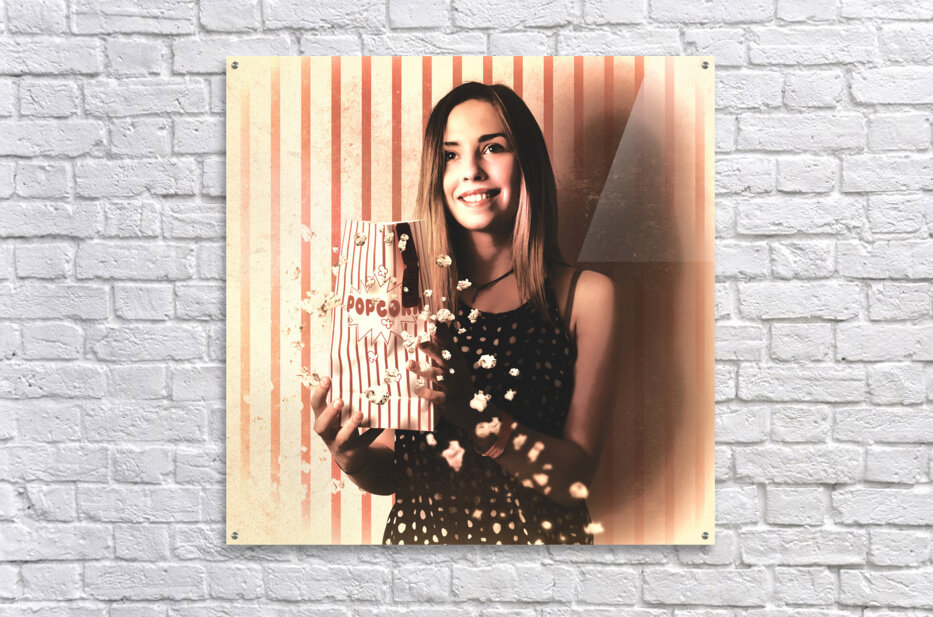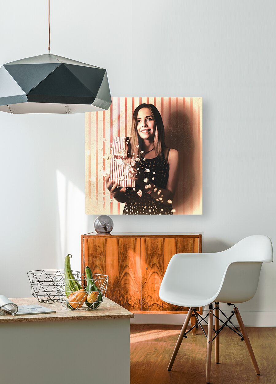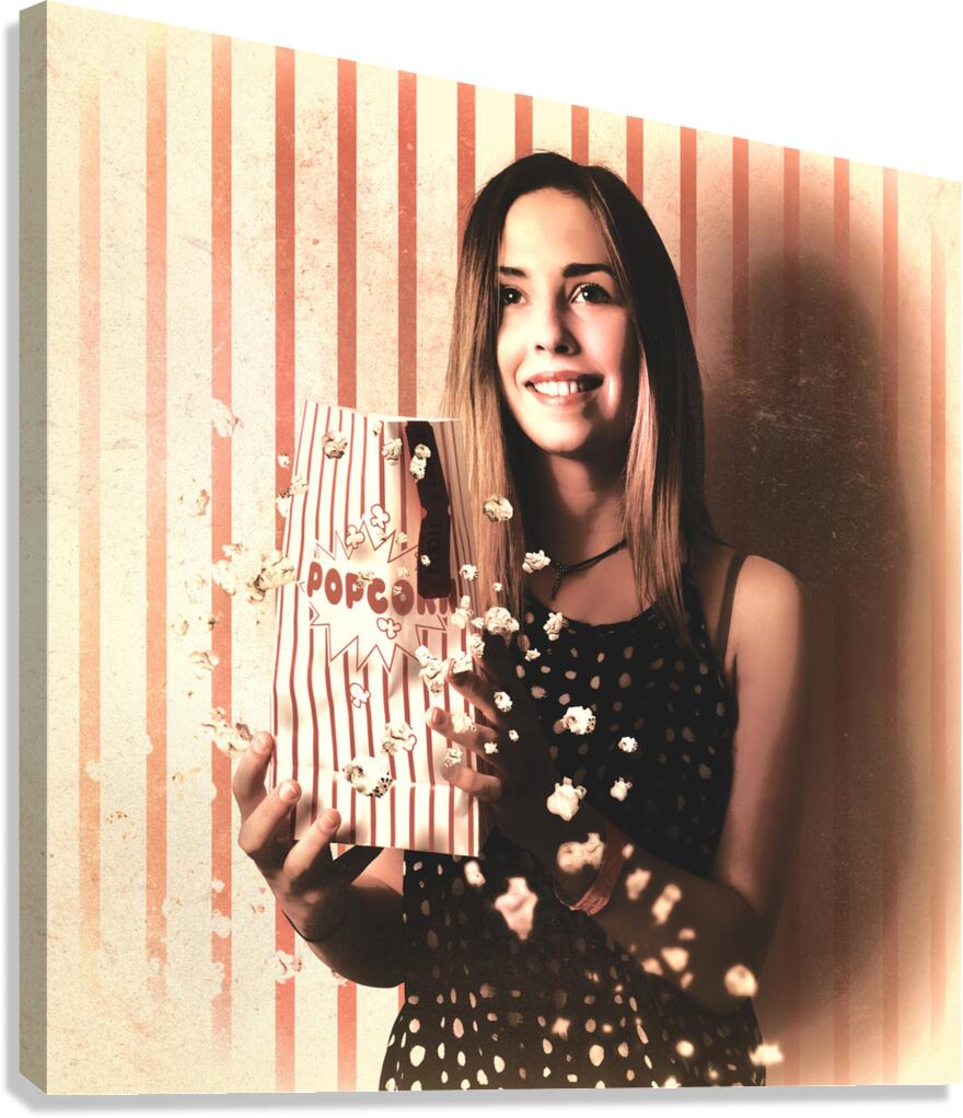 ABOUT THIS ARTWORK: VINTAGE CINEMA GIRL WITH MOVIE POPCORN. RETRO FILM
