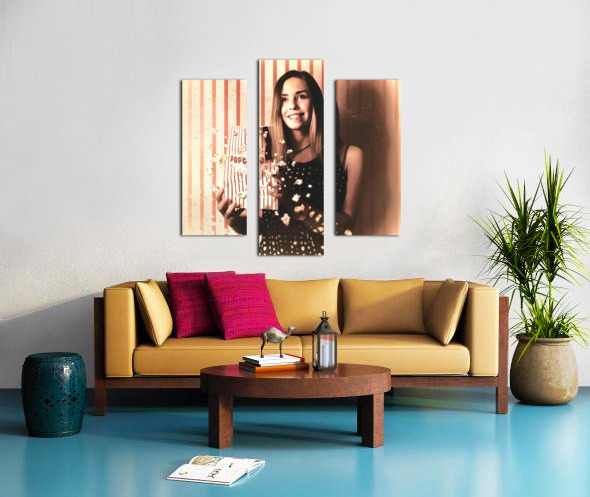 Vintage cinema girl with movie popcorn. Retro film Frame print