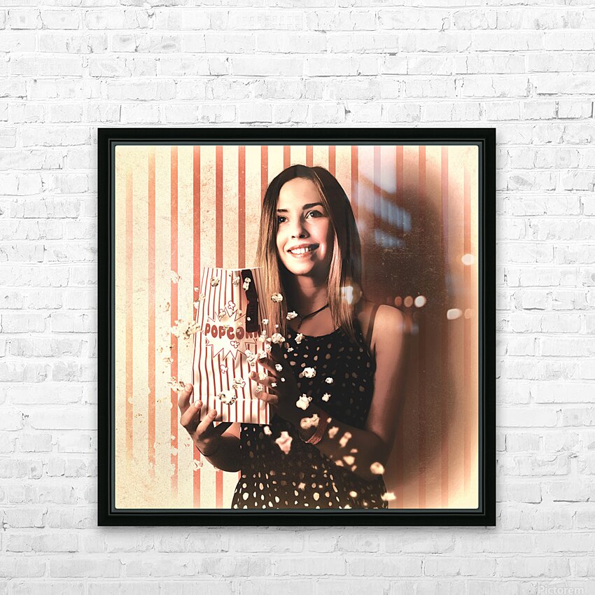 Vintage cinema girl with movie popcorn. Retro film Picture Frame Printing