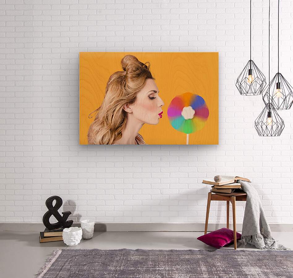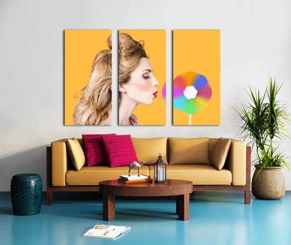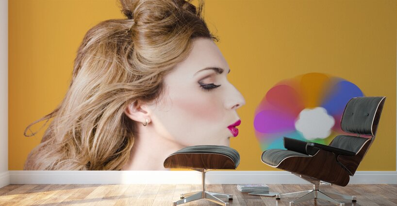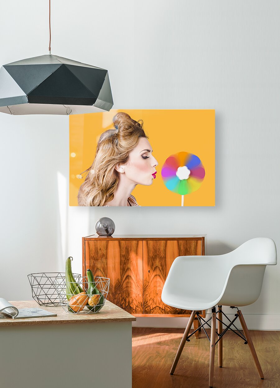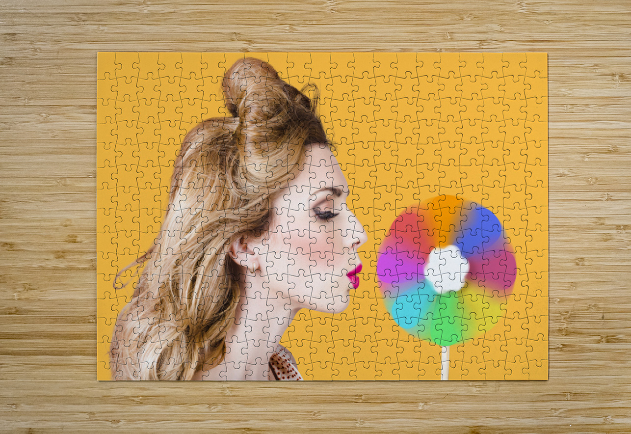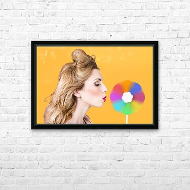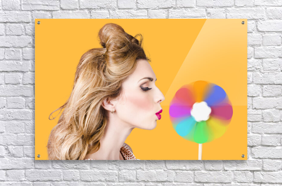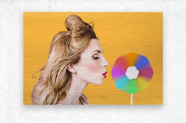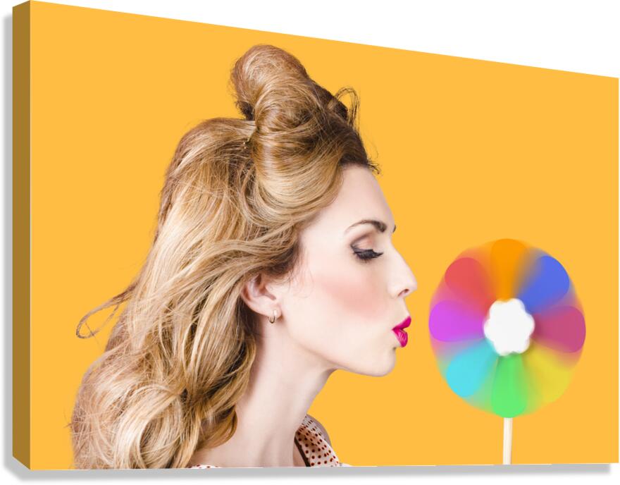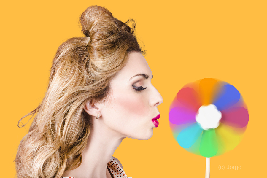 Attractive pin wheel pin up girl blowing on the end of a rotary toy turbine to create a motion of colours