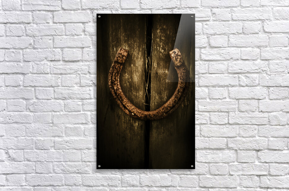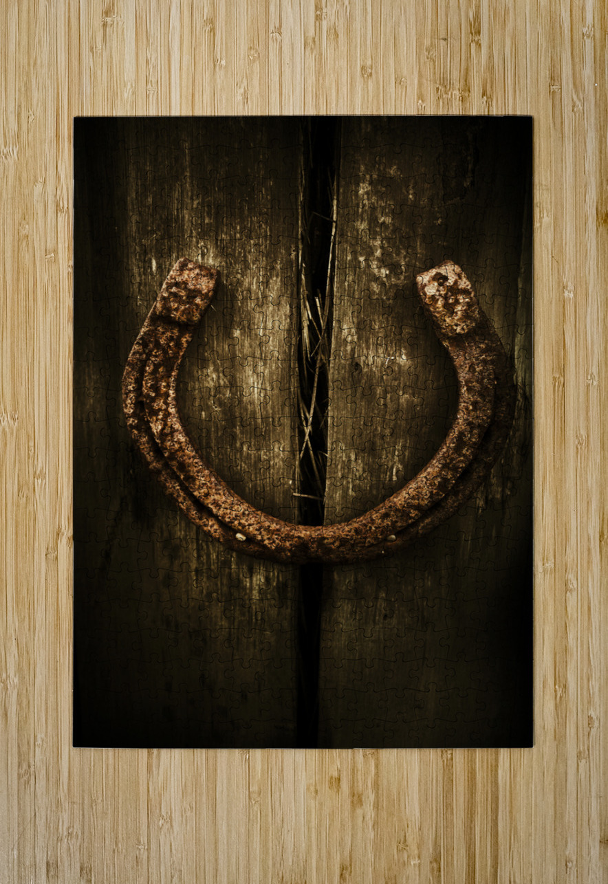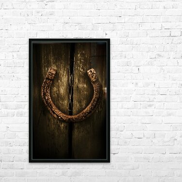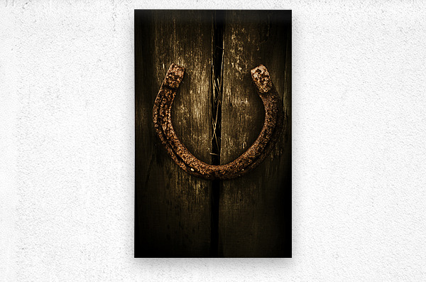 Dark artstic photo on a horseshoe hammered to the wooden barn door in typical rustic style. Country luck
